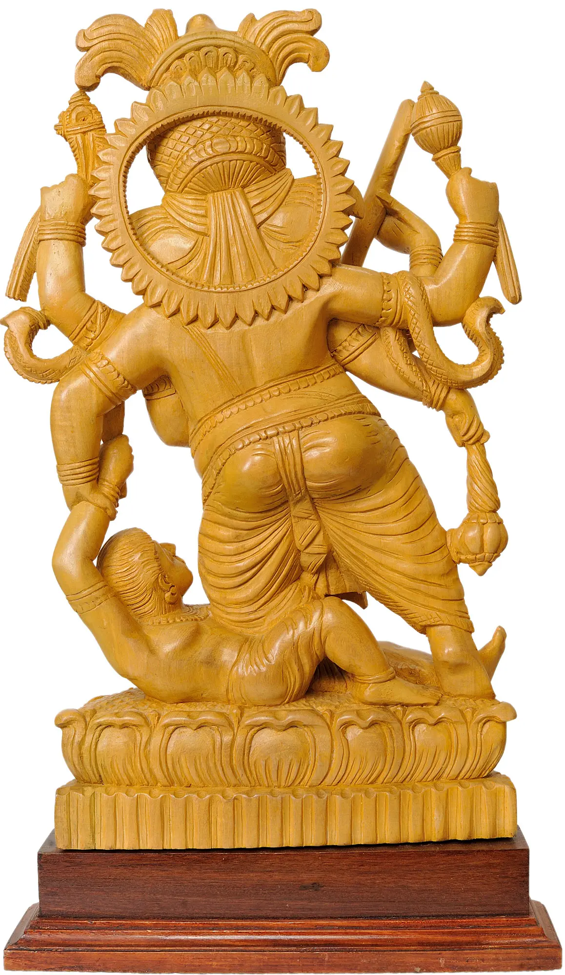The tradition of wood carving in Kerala is ancient and deeply intertwined with the region's rich cultural heritage. Artisans here have honed their skills over generations, transforming raw wood into breathtaking works of art that are both aesthetically stunning and spiritually resonant. The use of White Cedar, known for its durability and fine texture, allows for intricate detailing and a smooth finish, as evident in the delicate adornments on Ganesha's headdress and the folds of his garments. Each element of this sculpture, from the serene yet determined expression on Ganesha's face to the vulnerable posture of the vanquished asura, is meticulously carved, breathing life into the static form. The base, adorned with a lotus motif – a symbol of purity and spiritual awakening – further elevates the divine presence of the deity.