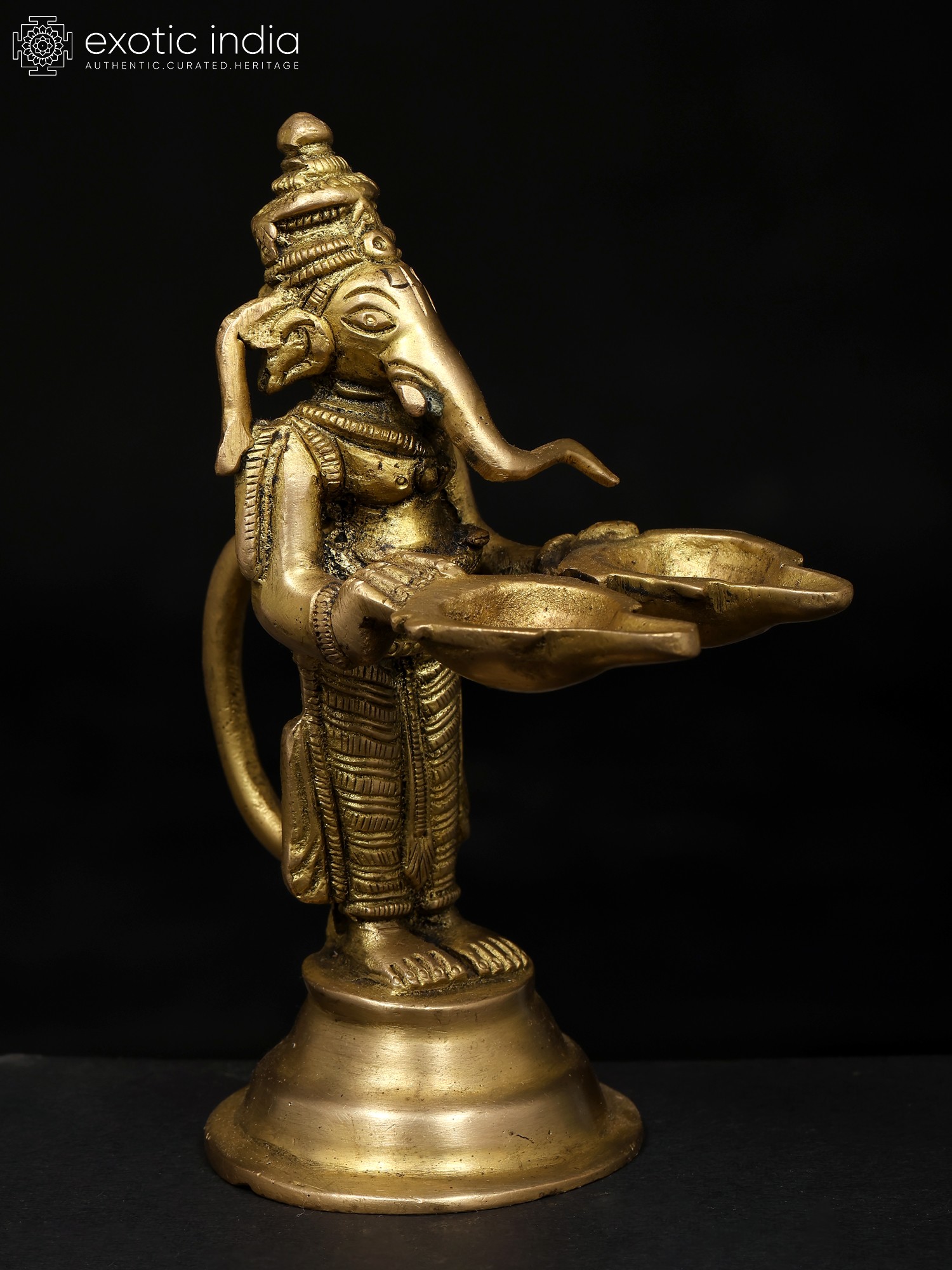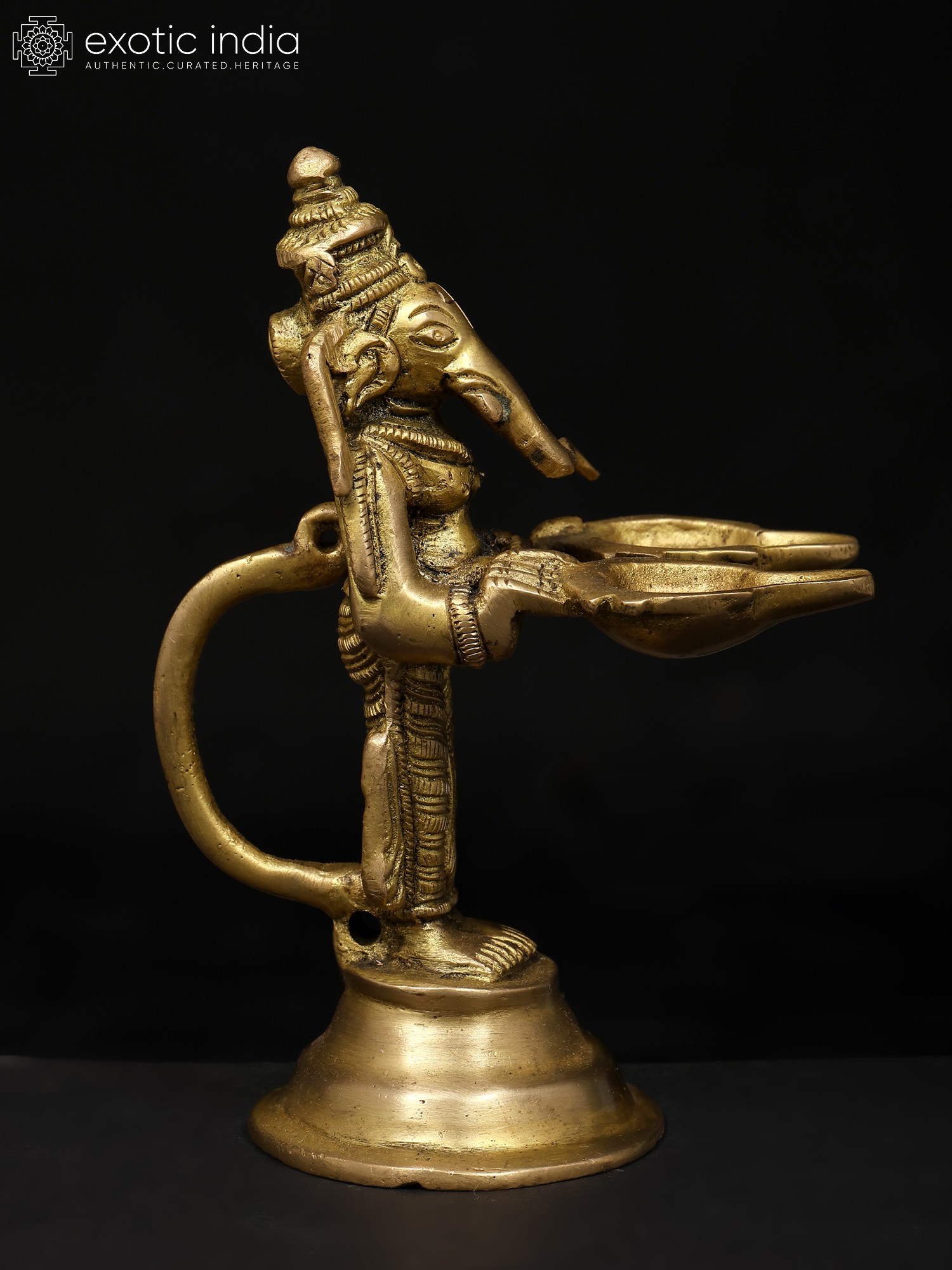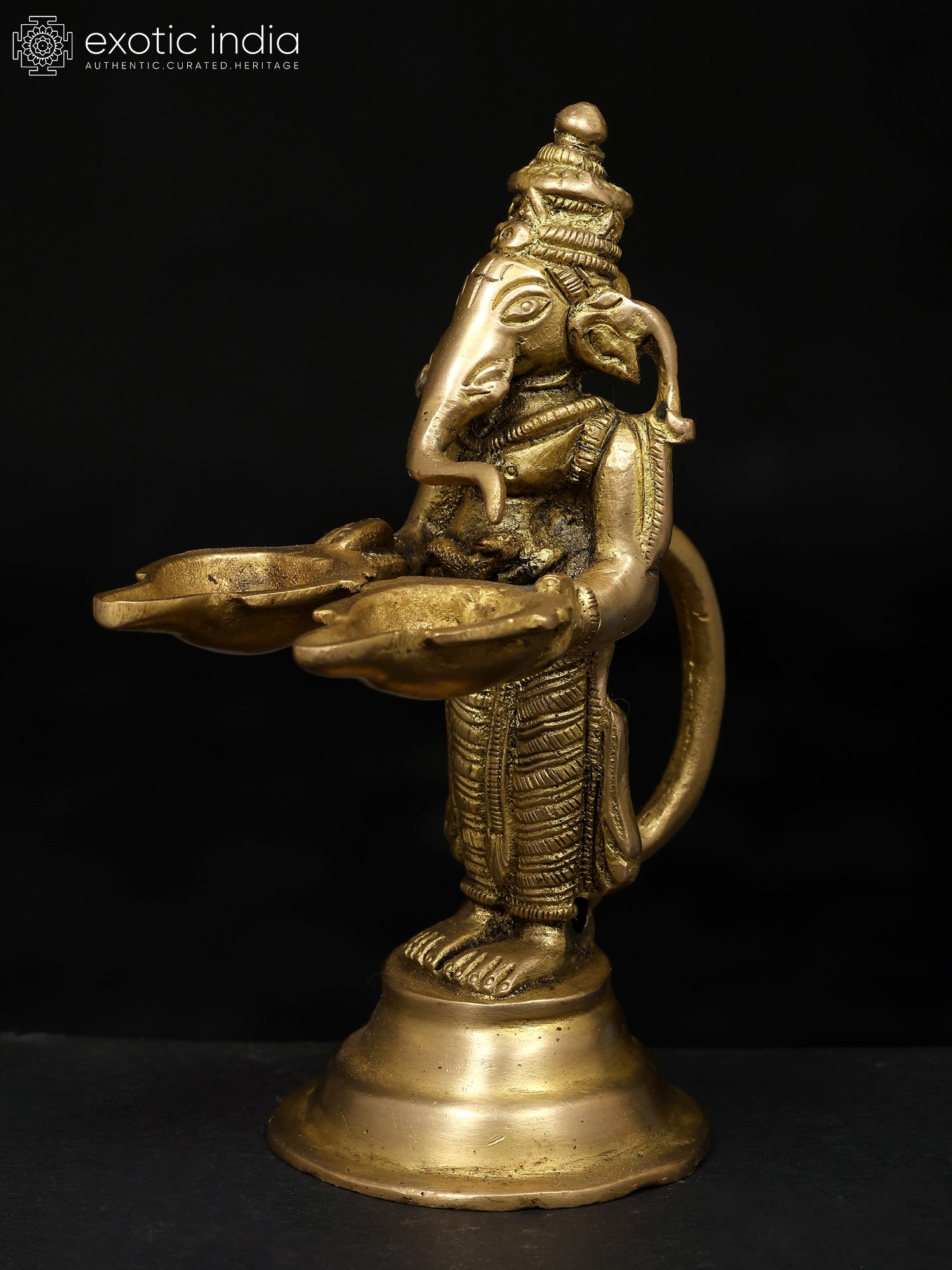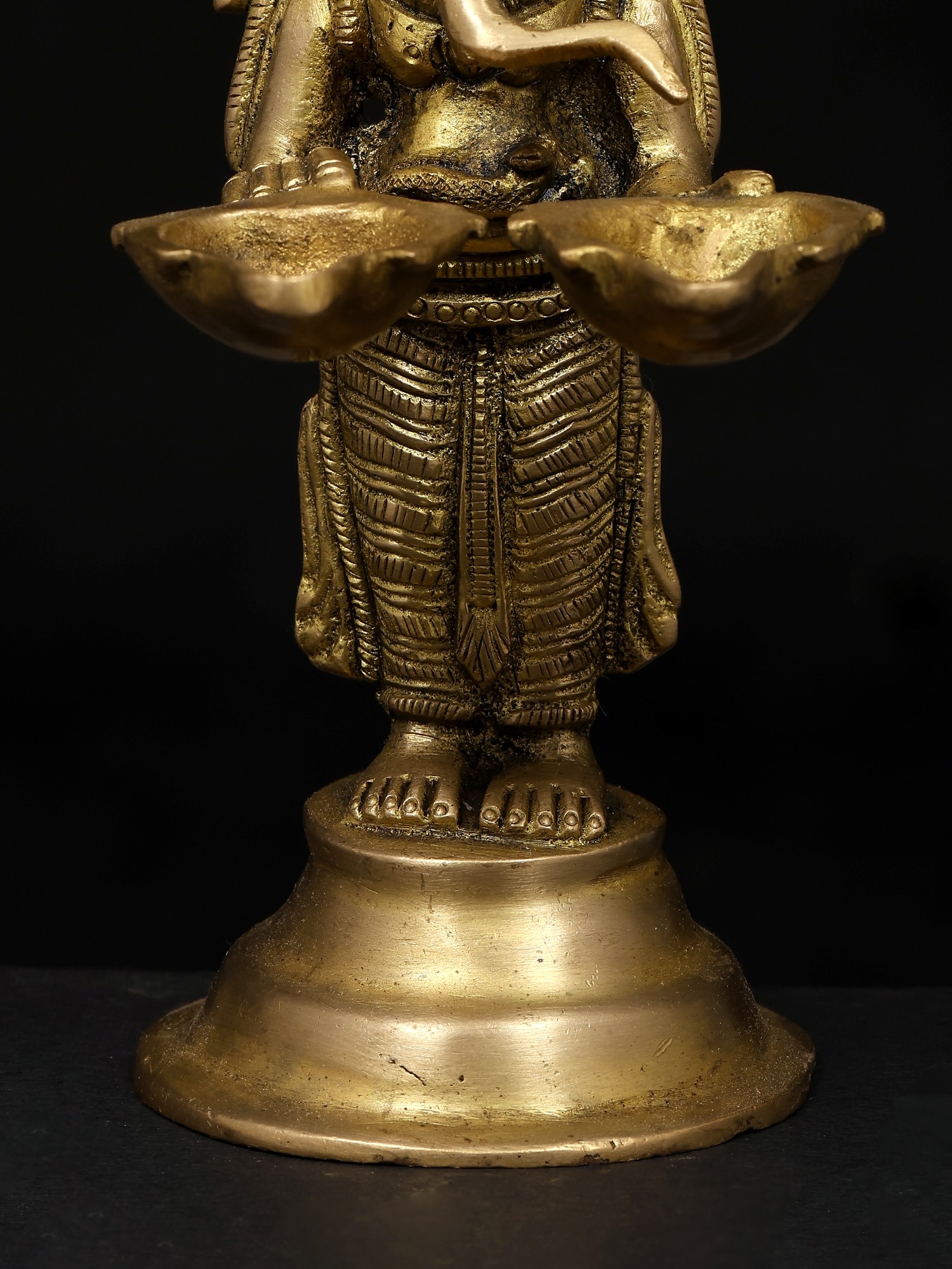 This brass lamp made in the style of a Deepalakshmi can be identified as a Ganesha lamp. It has the typical structure of a figure standing straight holding one or two lamps as if making an offering. Here in this lamp, the image of Lord Ganesha is benevolent and he is holding the lamp as if blessing the devotees with the light of wisdom.