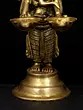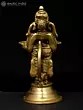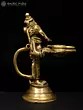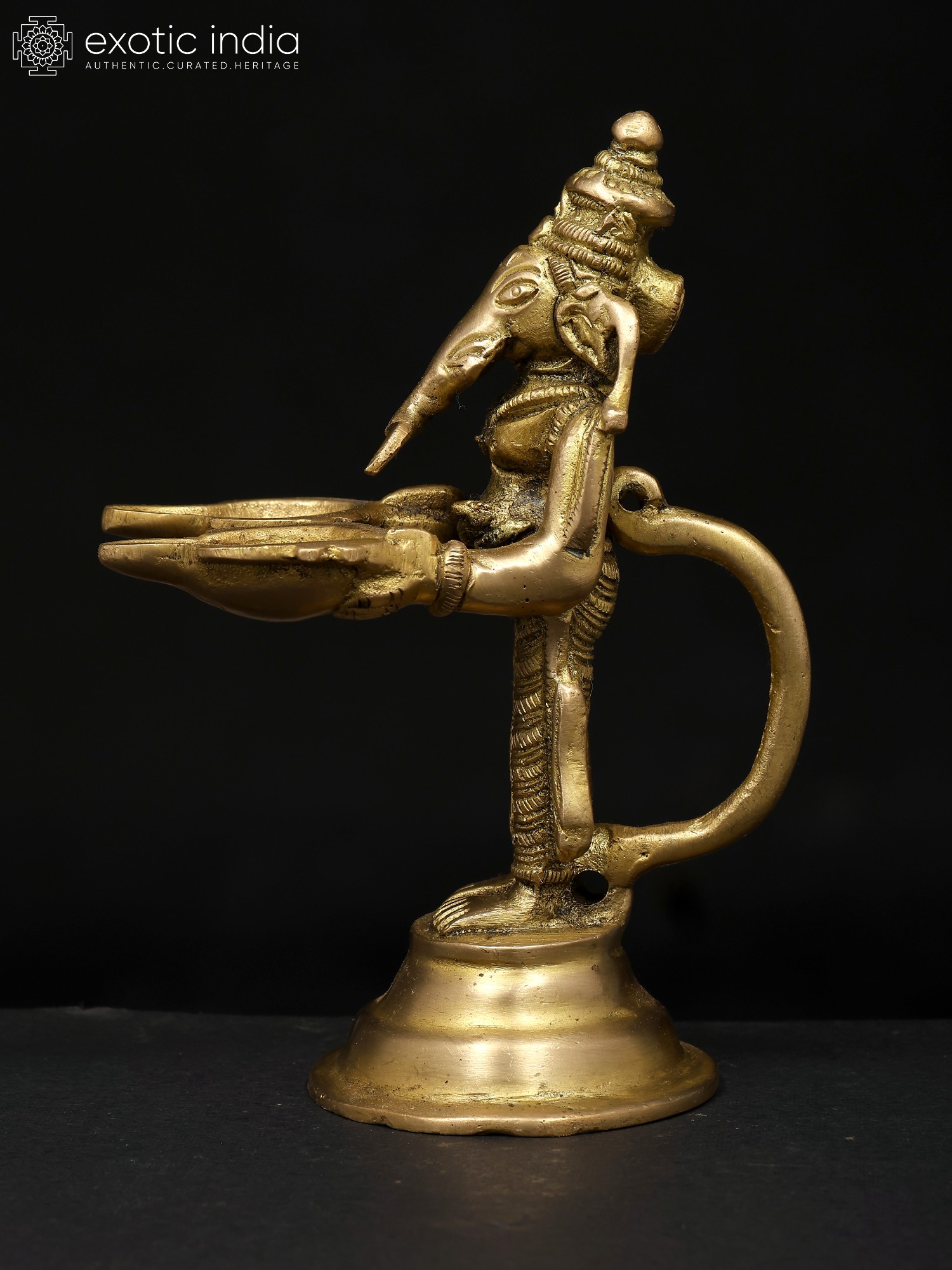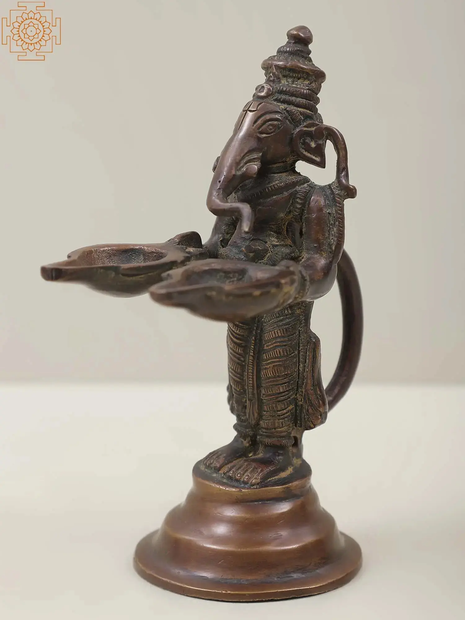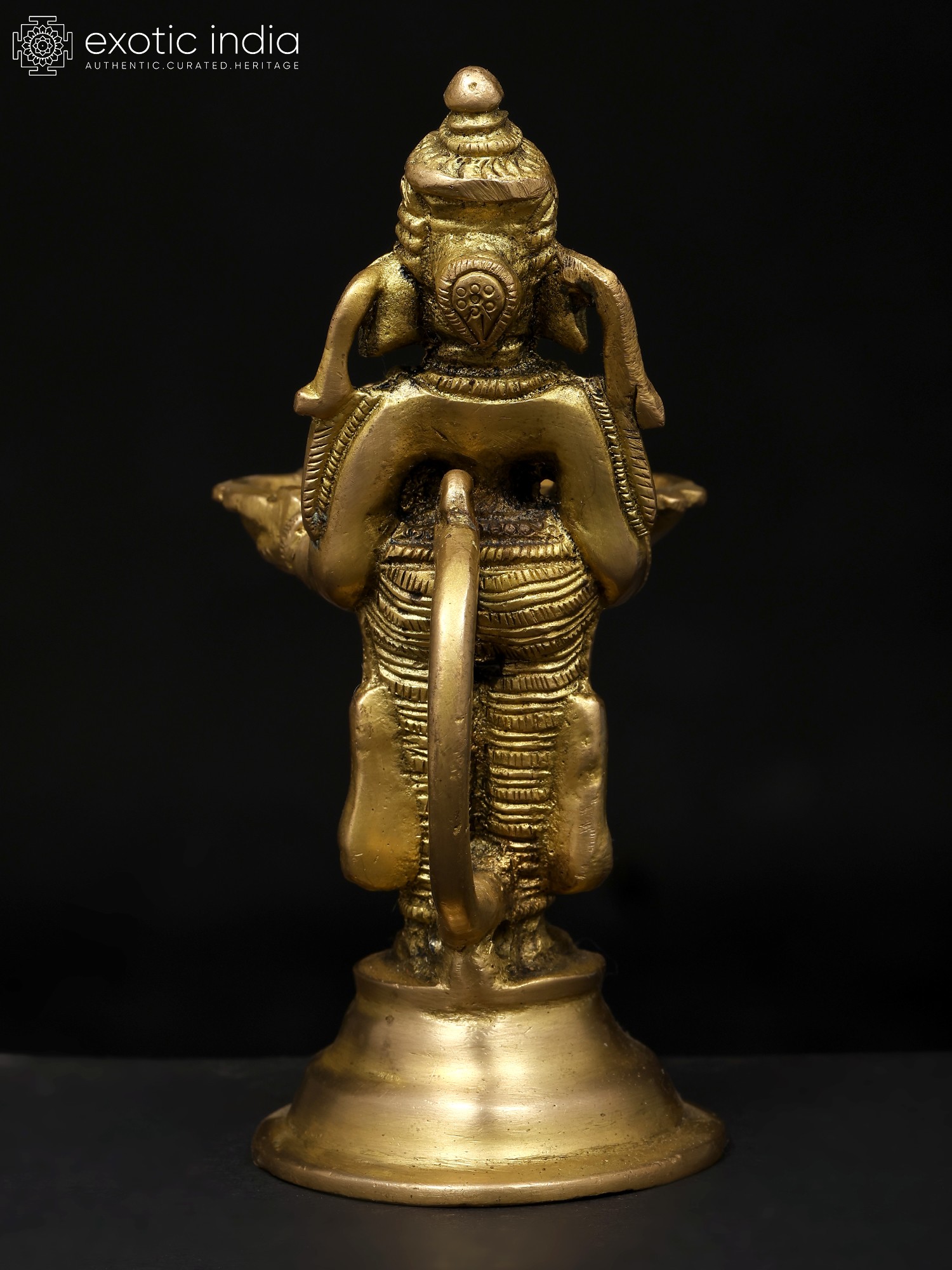 This brass lamp made in the style of a Deepalakshmi can be identified as a Ganesha lamp. It has the typical structure of a figure standing straight holding one or two lamps as if making an offering. Here in this lamp, the image of Lord Ganesha is benevolent and he is holding the lamp as if blessing the devotees with the light of wisdom.