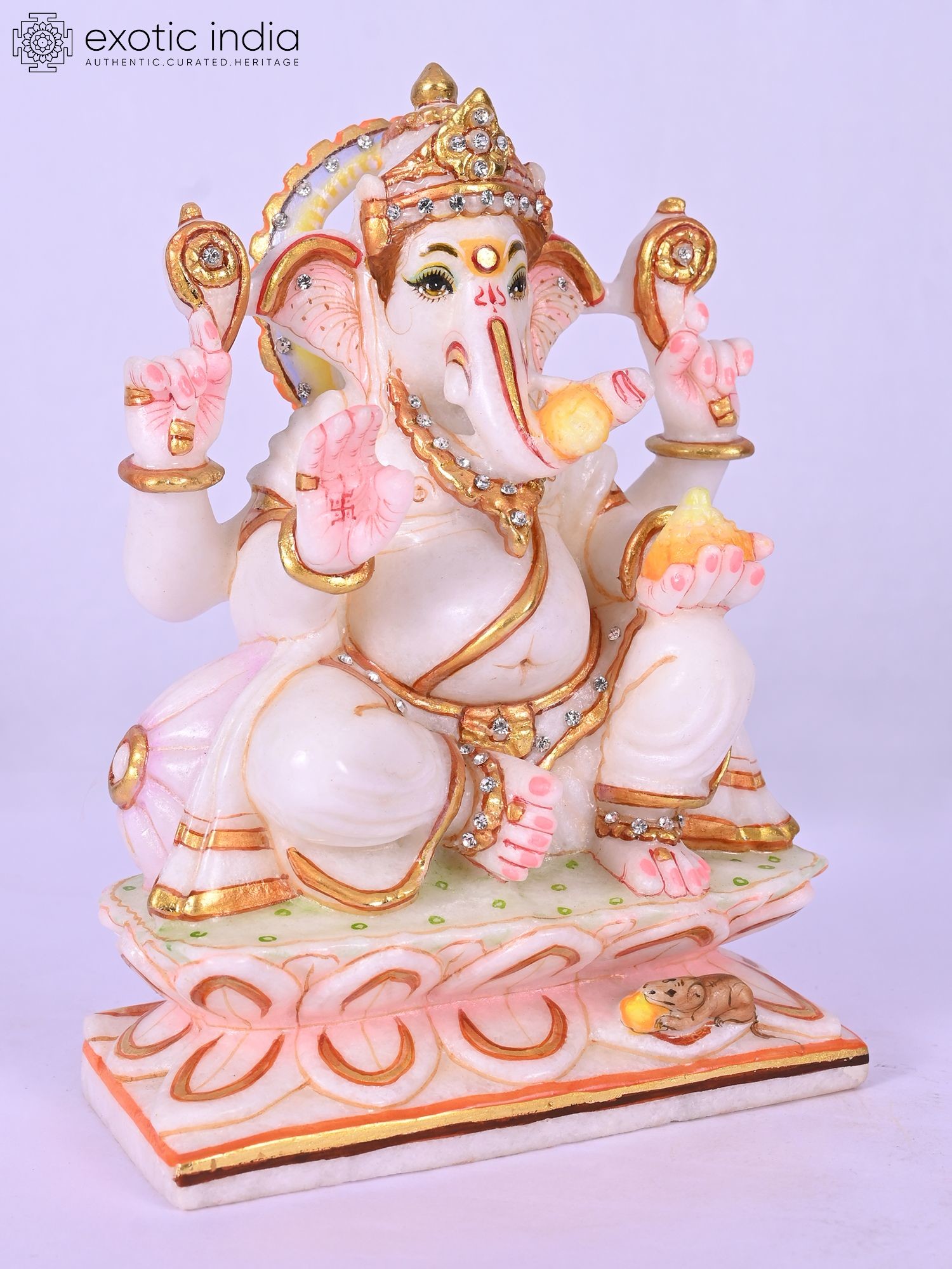8-Inch Four Armed Lord Ganesha Statue in Makrana Marble