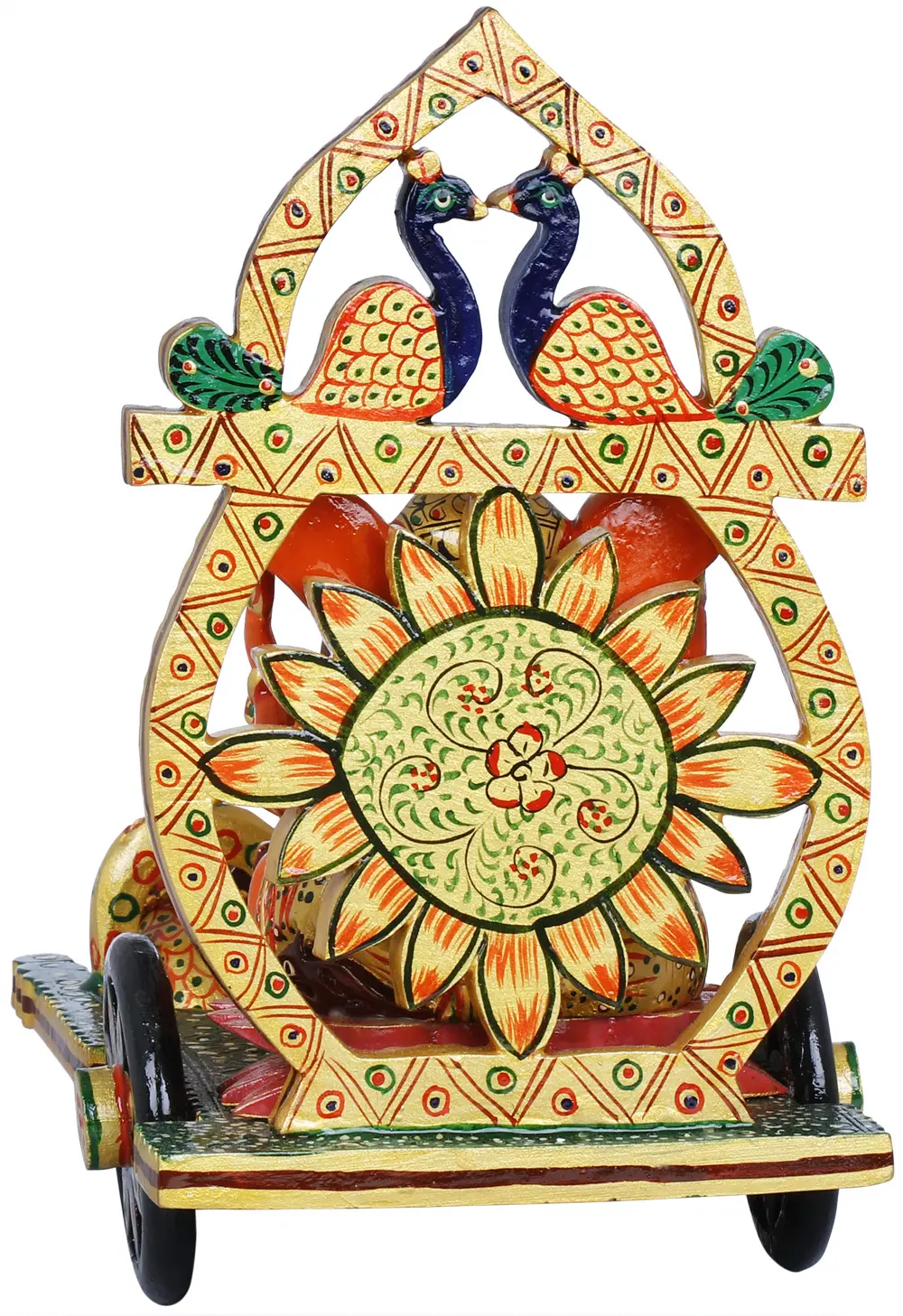 This exquisite wooden carving depicts the beloved Hindu deity, Lord Ganesha, in a magnificent procession. Seated upon a vibrant lotus throne, Ganesha, the remover of obstacles and patron of arts and sciences, is poised to embark on a journey, his divine chariot intricately designed and pulled by his loyal vahana, the humble yet powerful mouse. The craftsmanship evident in this piece is remarkable, showcasing the skill of the artisan in bringing to life a scene steeped in mythology and cultural significance. The chariot itself is a masterpiece, adorned with elaborate carvings and painted with rich, auspicious colors. The back of the chariot features a gracefully arched structure, reminiscent of a peacock's elaborate plumage, with two serene peacocks adorning its crest. The peacock, a symbol of royalty, beauty, and divinity in many Indian traditions, often signifies the triumph of good over evil and the glory of creation. In Hindu mythology, the peacock is also associated with Lord Krishna, and its presence here alongside Ganesha adds layers of symbolic meaning, hinting at cosmic harmony and divine power. The central figure of Ganesha is rendered with loving detail. His characteristic elephant head, large ears, and benevolent expression exude wisdom and grace. He is adorned with traditional jewelry, and his posture suggests a blessing or a moment of serene contemplation before his journey. The vibrant orange hue of Ganesha's form is often associated with auspiciousness, energy, and the sun, further enhancing the divine aura of the sculpture. Pulling this divine chariot are not one, but several mice, meticulously carved and painted. The mouse, Ganesha's mount, symbolizes his mastery over worldly desires and his ability to overcome even the smallest of obstacles. Its small size juxtaposed with the immense power of Ganesha highlights the deity's ability to control and navigate the intricacies of existence. The chain connecting the mice and the ornate chest in front of them adds a touch of regal splendor to the procession, suggesting that even in his humble mode of transport, Ganesha travels with divine authority. This wooden carving is more than just a decorative piece; it is a tangible representation of faith, tradition, and artistic heritage. The natural grains of the wood lend a warmth and organic feel to the sculpture, while the hand-painted details bring the figures to life with vibrant energy. Whether placed in a home altar, a study, or a living space, this Ganesha on his peacock chariot is sure to be a focal point, inspiring a sense of peace, prosperity, and spiritual connection. It is a perfect gift for devotees, art enthusiasts, or anyone seeking to bring the blessings of Lord Ganesha into their lives.