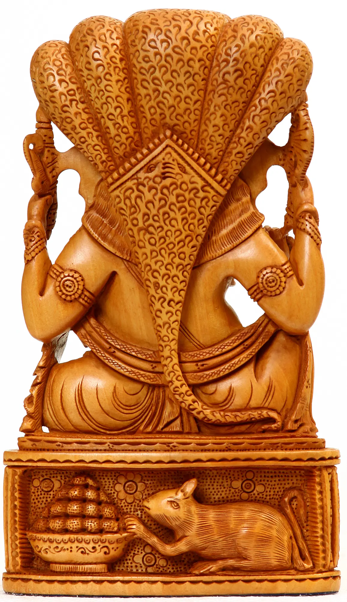 Adding another layer of symbolism is the magnificent seven-hooded serpent that arches protectively over Ganesha. In Hindu mythology, serpents, or *nagas*, are powerful beings associated with guardianship, fertility, and cosmic energy. The seven hoods represent the multiple levels of consciousness and the comprehensive protection offered by the serpent's wisdom. Its presence assures devotees that Ganesha is shielded from negativity and that his blessings are bestowed with unwavering strength. This combination signifies a powerful blend of wisdom, musical harmony, and divine protection. The base of the sculpture also features intricate carvings, including depictions of Ganesha's vahana (vehicle), the mouse. The mouse represents desires that gnaw and distract, but Ganesha's mastery over it symbolizes his control over earthly desires. The attention to detail in the sculpture shows dedication to the craft. It serves as a reminder to overcome obstacles and seek wisdom in every aspect of life. This exquisite piece, originating from the skilled artisans of Jaipur, is more than just a decorative object; it’s a powerful symbol of blessings. The sculpture can be a beautiful reminder to embrace challenges, seek knowledge, and find harmony amidst the chaos of life. Jaipur, known for its rich tradition of wood carving, lends its distinct artistic sensibility to this sculpture, reflecting the cultural heritage of the region.