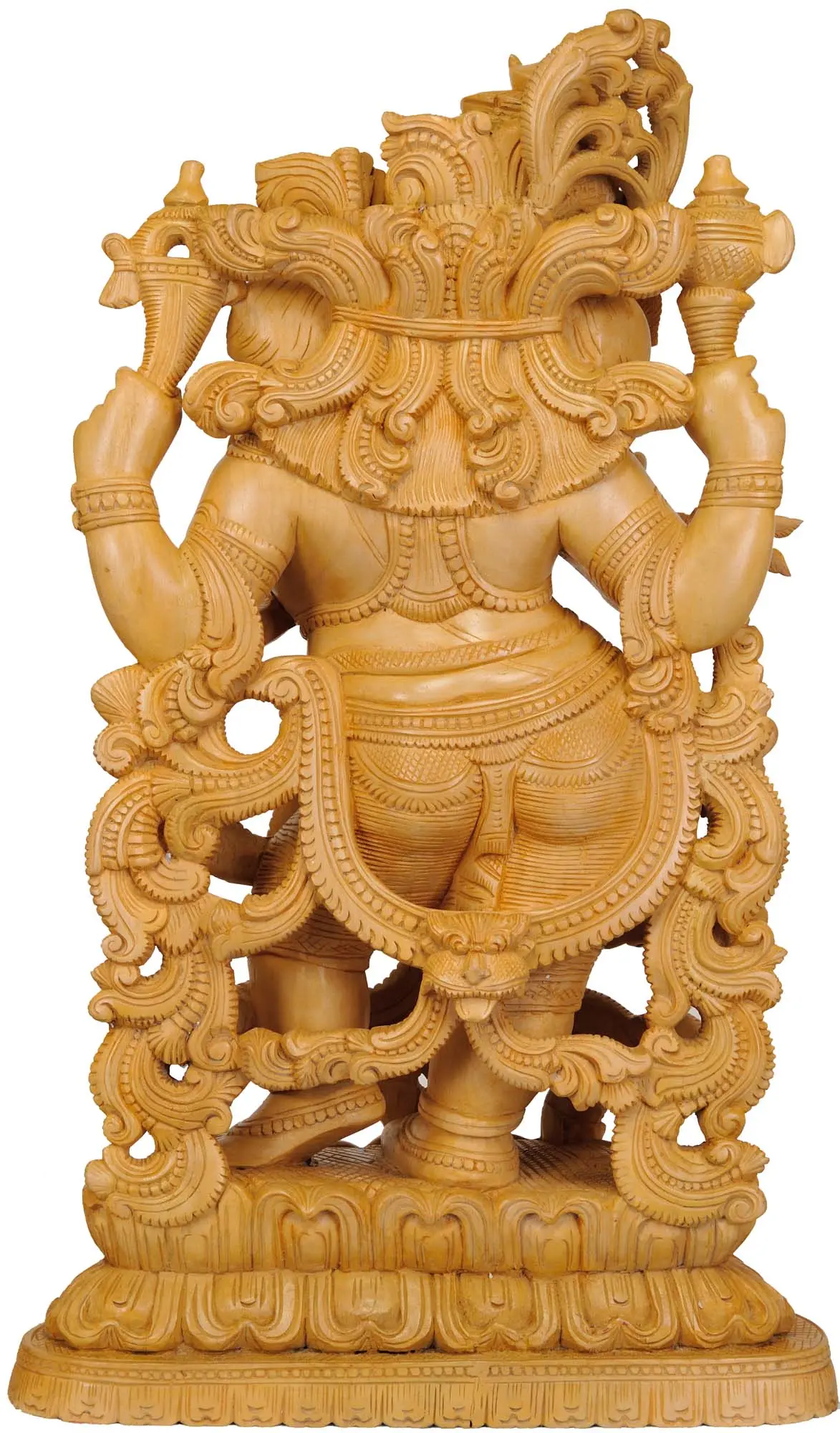 This exquisite wood carving depicts Lord Ganesha in a unique and captivating pose, holding a flute to his lips, as if conjuring a celestial melody. Unlike the more common depictions of the Remover of Obstacles with his divine weapons, this artistic rendition emphasizes his role as a bringer of harmony, joy, and creative inspiration. The subtle smile on his trunk suggests a deep contentment, resonating with the blissful tunes he is imagined to be playing. Crafted from fine White Cedar wood sourced from Trivandrum, this statue embodies the rich tradition of Indian artistry. The wood's natural warmth and intricate grain provide a perfect canvas for the detailed carving. Every curve, every fold of drapery, and the very texture of Ganesha's form are rendered with exceptional skill, bringing the divine elephant-headed deity to life. The intricate patterns adorning his jewelry and garments speak of the meticulous craftsmanship that went into its creation. The elaborate lotus-shaped pedestal upon which he stands further enhances the regal and divine aura of the sculpture.