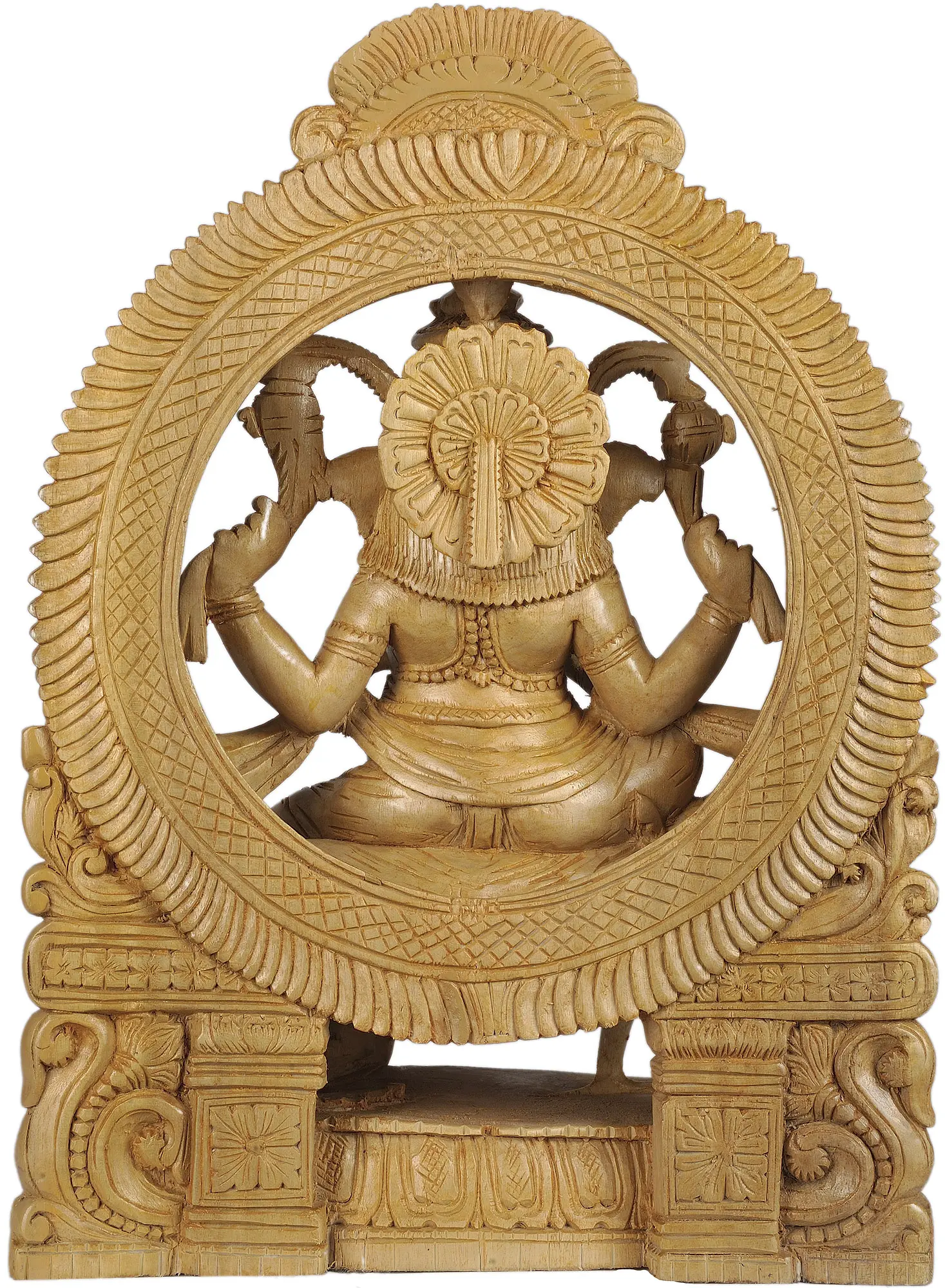This is carved from white cedar wood, its fine grain lending itself beautifully to the intricate detailing. The figure showcases Ganesha’s benevolent countenance, his large ears said to hear the pleas of his devotees. The gentle curves of his form and the positioning of his multiple arms, each holding symbolic objects, exude a sense of serenity and power. One hand is often depicted offering blessings to devotees. The carving captures the texture of the fabric draped across his torso, the delicate beads of his jewelry, and the gentle curve of his trunk, which is said to represent the ability to overcome obstacles. Observe the floral aureole that frames the deity, representing the universe and Ganesha's all-encompassing presence. At the apex, a Kirtimukha is carved, a mythical creature whose fierce appearance wards off negativity and protects the sacred space. Kirtimukha’s origins are rooted in a tale of devotion, where he was tasked to devour himself as an act of loyalty, symbolizing selfless sacrifice. The intricate patterns etched into the base of the statue and the details of Mushika further enhance its aesthetic appeal.
