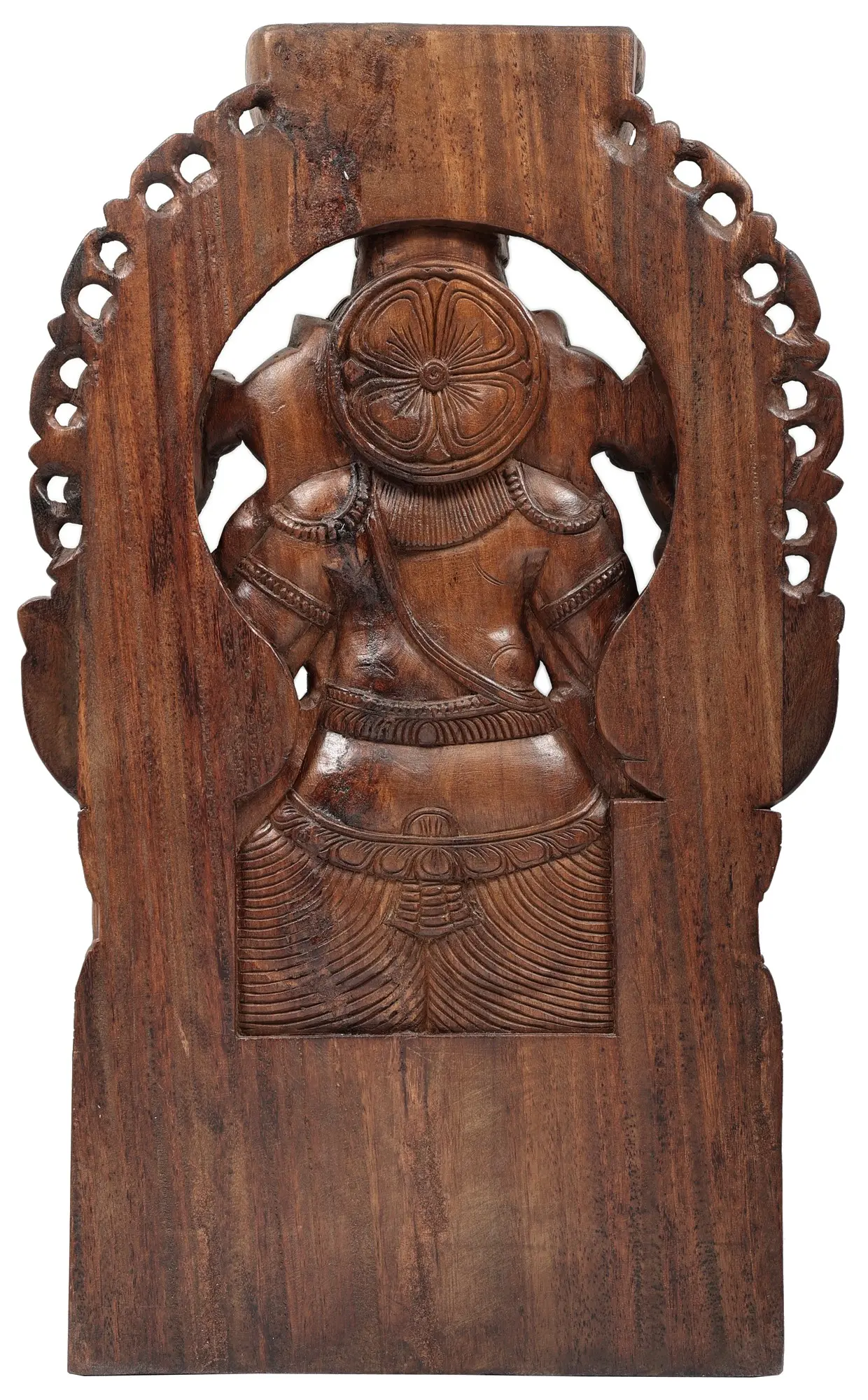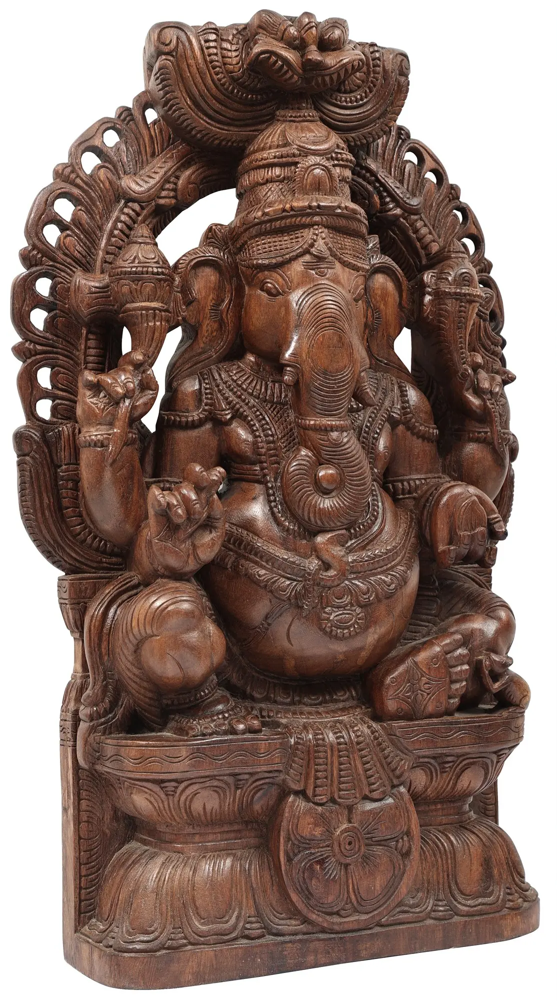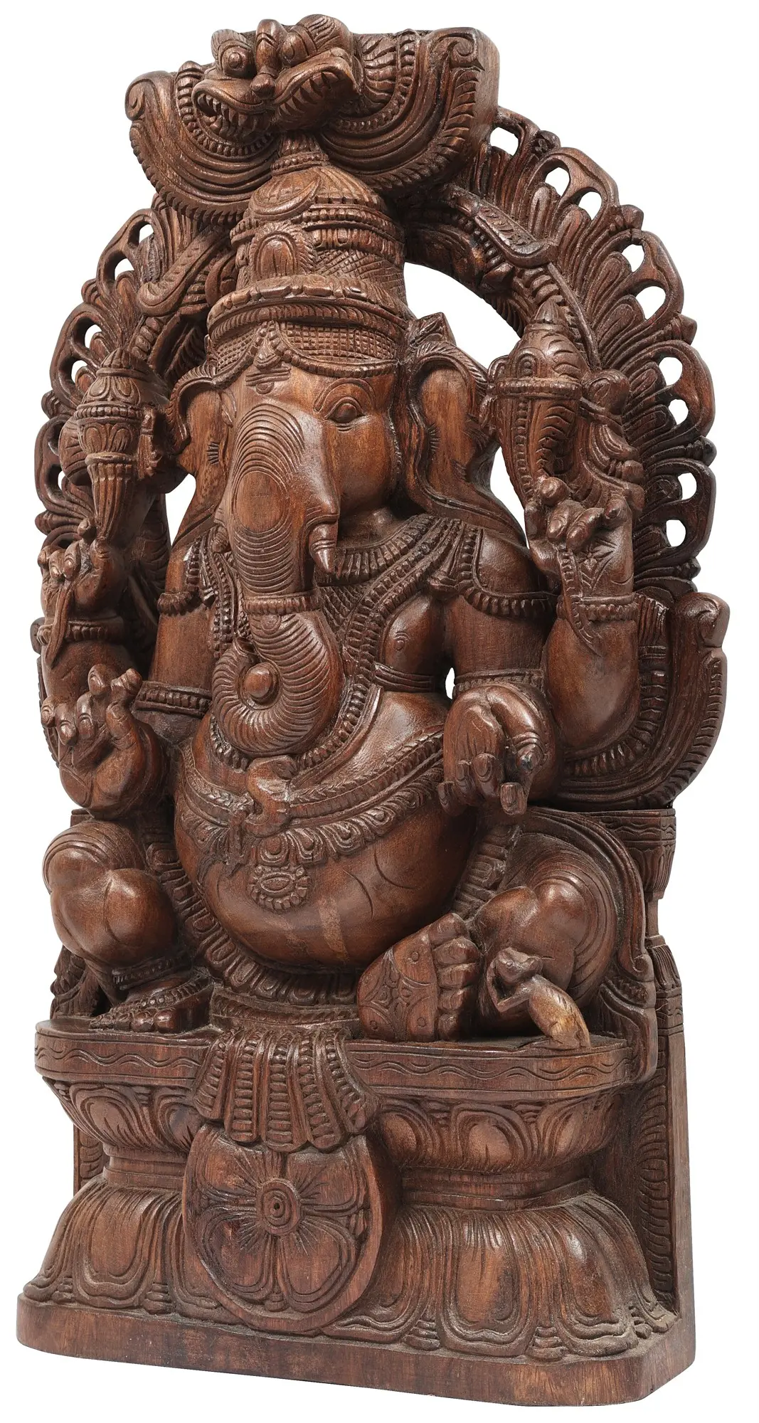 In this heavy wooden statue, Lord Ganesha is shown in a sitting posture, wearing a majestic haloed crown. His right rear hand holds Ankusha, the elephant-goad, a symbol for krodha, or anger. His left hand holds the pasa, the noose, which symbolizes the bonds of attachment, the raga. His right lower hand holds his broken tusk - thus the name Ekdanta - while the corresponding left holds his favourite sweet, the modak. He is represented wearing a yajnopavita and has a snake wrapped around his belly. The base of the statue is a double-lotus pedestal representing the creative force of the universe. Keeping Lord Ganesha statues in homes is believed to bring good fortune and success in all worldly endeavours
