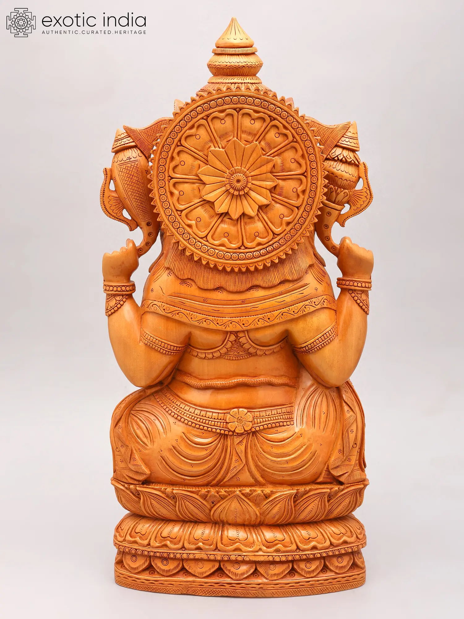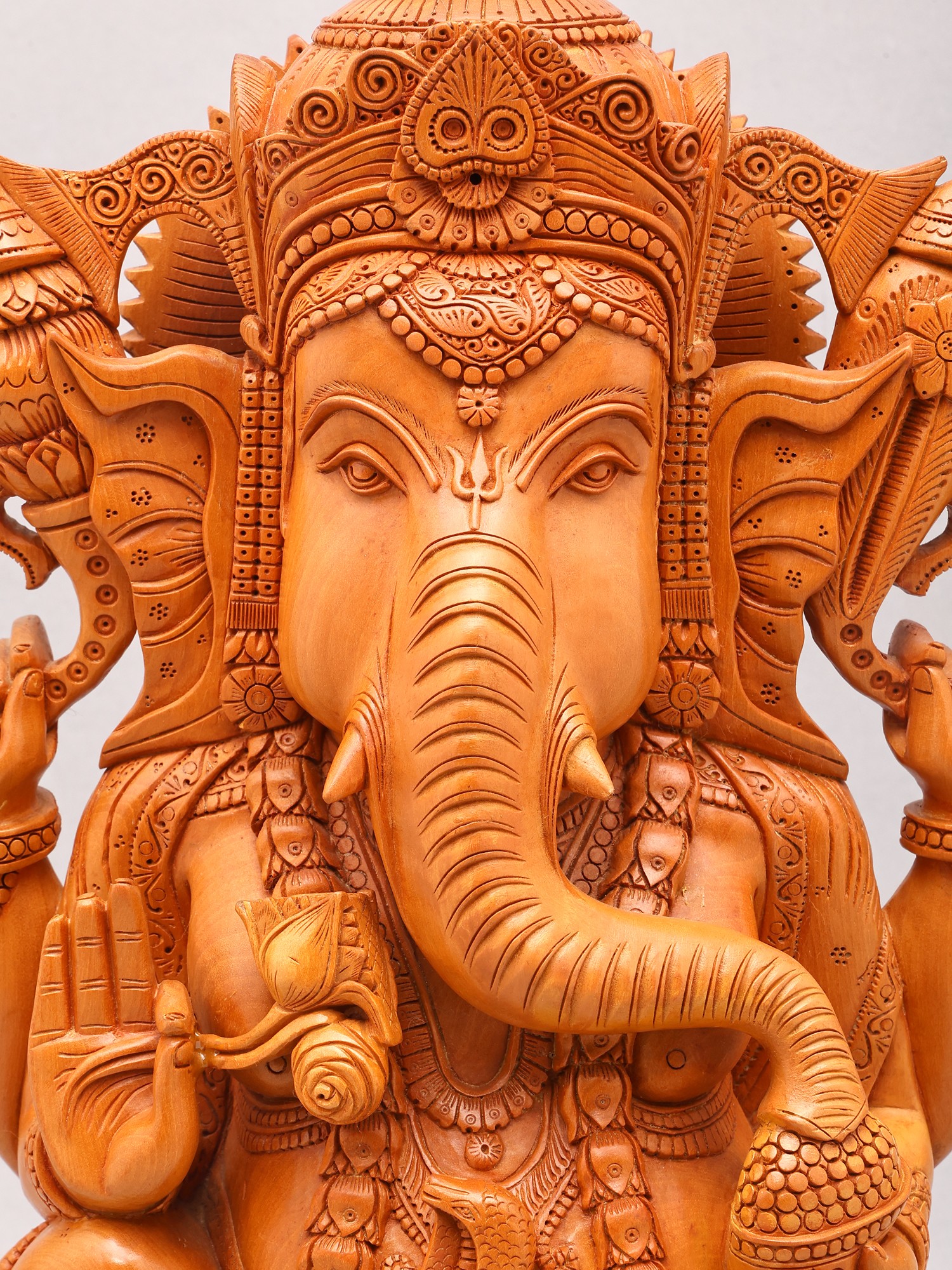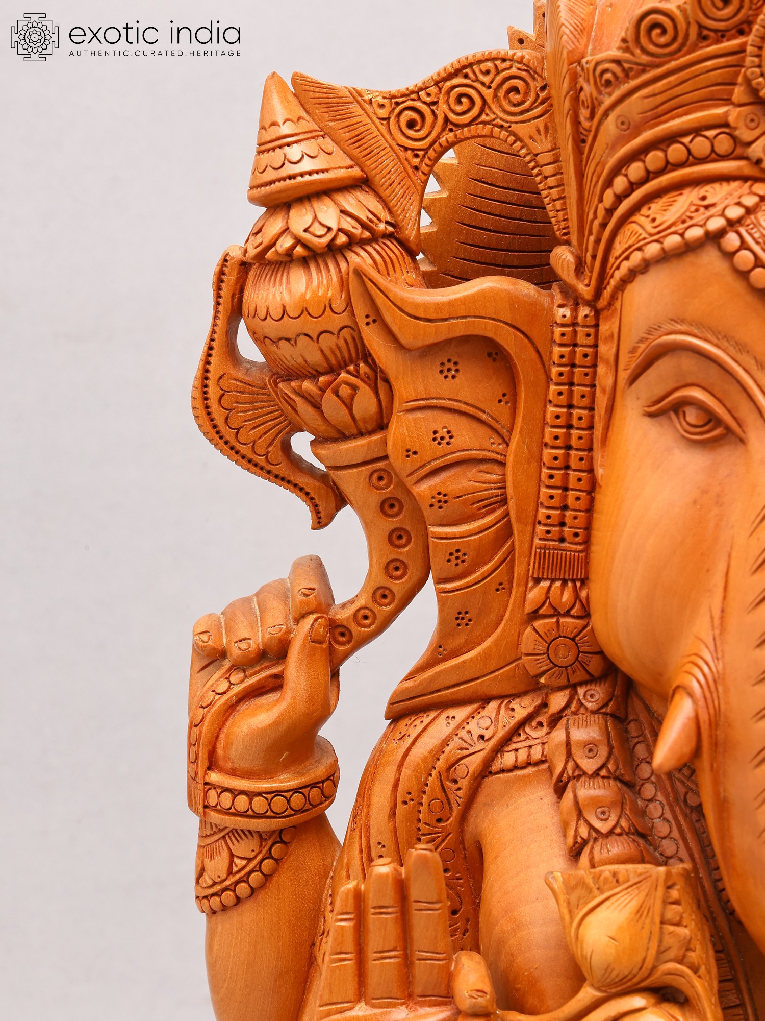 Lord Ganesha Seated Statue - Four Armed Blessing Wood Carving