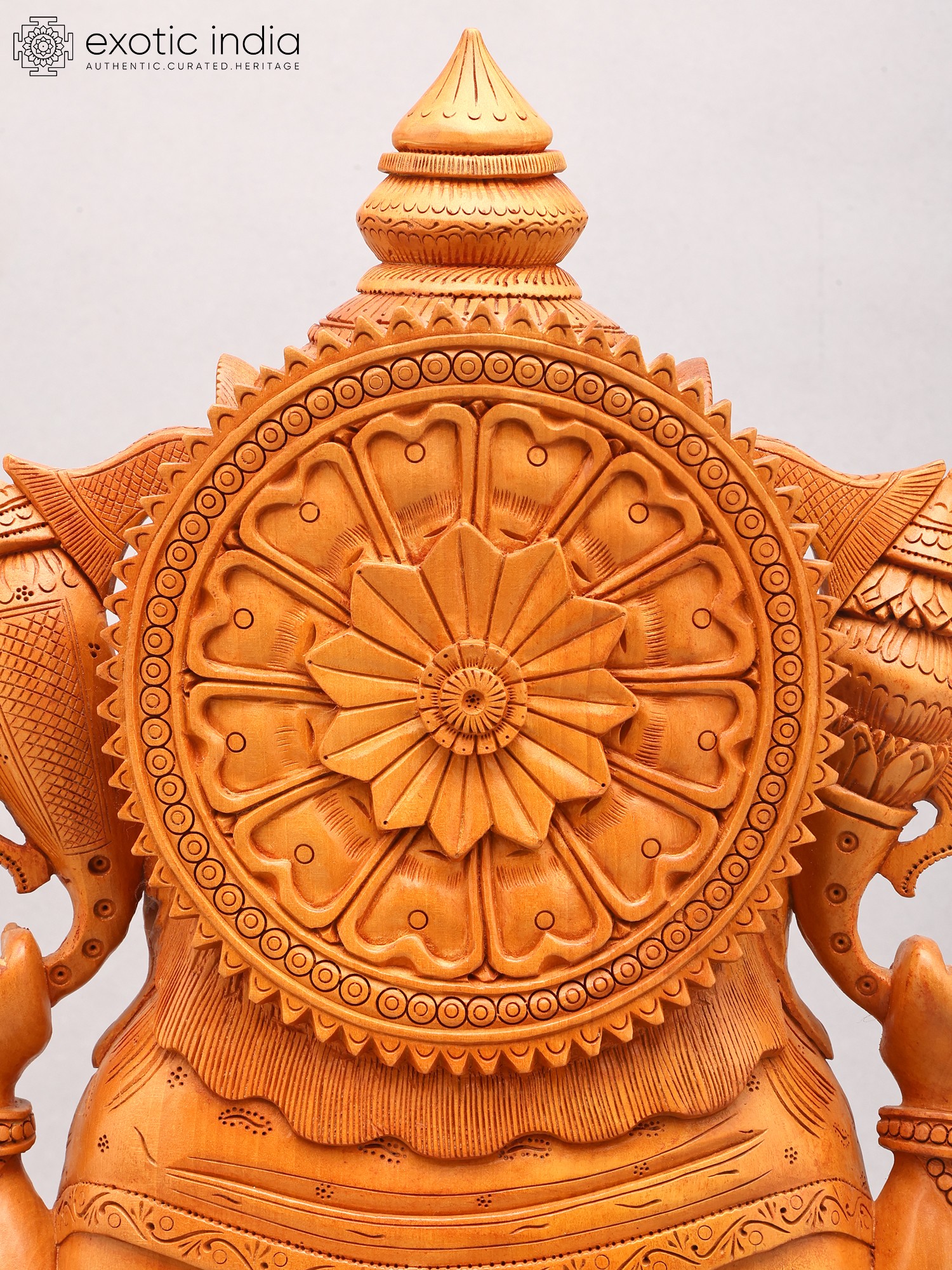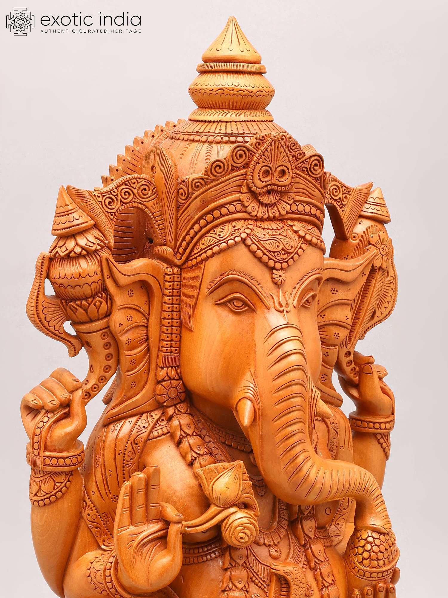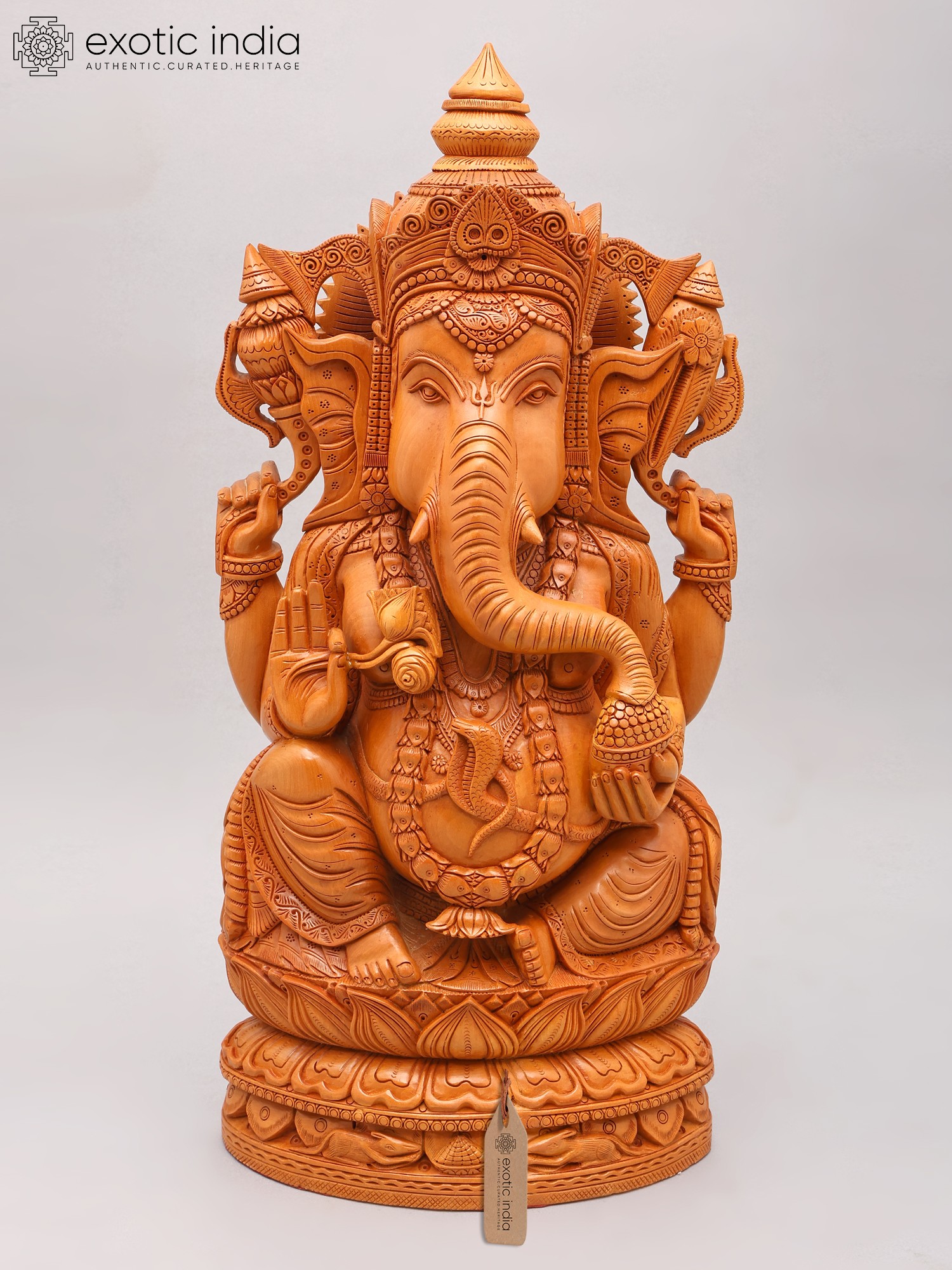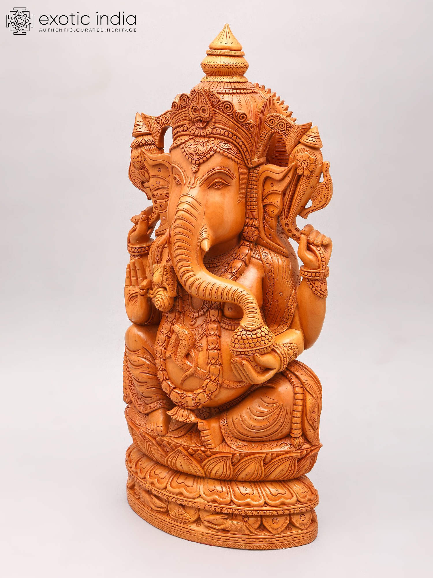 Lord Ganesha Seated Statue - Four Armed Blessing Wood Carving