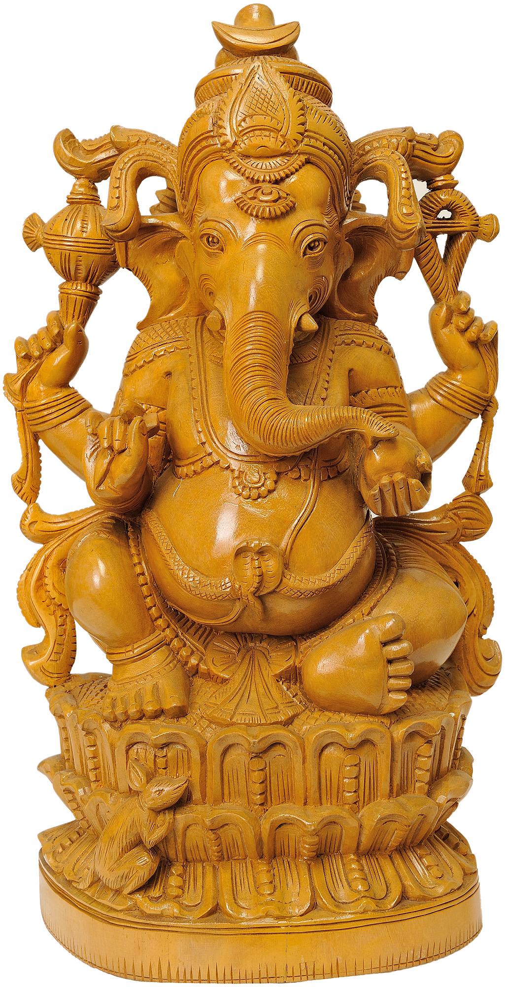Invite the blessings of wisdom, prosperity, and good fortune into your home with this exquisite wood carving of Lord Ganesha. Crafted with remarkable detail from fragrant White Cedar wood sourced from the verdant forests of Trivandrum, this statue embodies the divine essence of the beloved elephant-headed deity. Ganesha, revered as the Vighnaharta (Remover of Obstacles) and the patron of arts and sciences, is a central figure in Hindu mythology. He is invoked at the beginning of every ritual and ceremony, symbolizing auspicious beginnings and the successful completion of endeavors. The artistry of this piece is evident in every curve and contour. Lord Ganesha is depicted in his characteristic form, seated gracefully upon an intricately carved lotus. The lotus, a symbol of purity and spiritual growth, represents the blossoming of consciousness and the overcoming of worldly attachments. His gentle gaze and serene expression convey a sense of peace and benevolent power. His multiple arms, a common iconography, are adorned with divine attributes, each signifying a specific aspect of his power and grace. In one hand, he may hold a modak, his favorite sweet, symbolizing the rewards of spiritual practice. Another hand might hold his broken tusk, a testament to his sacrifice and willingness to overcome adversity for knowledge. ––––––––––––––––––