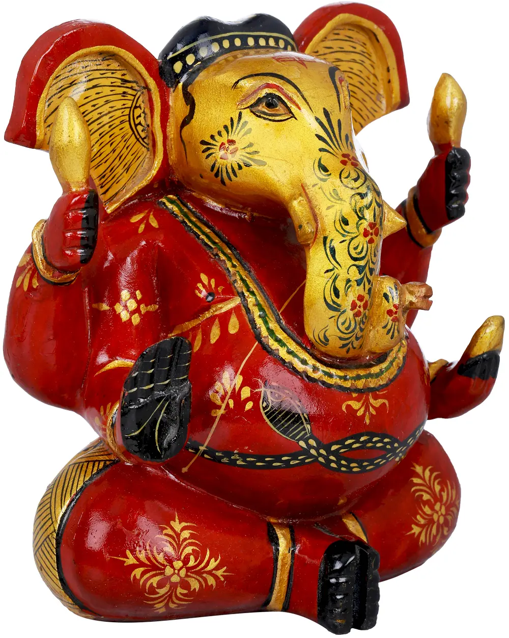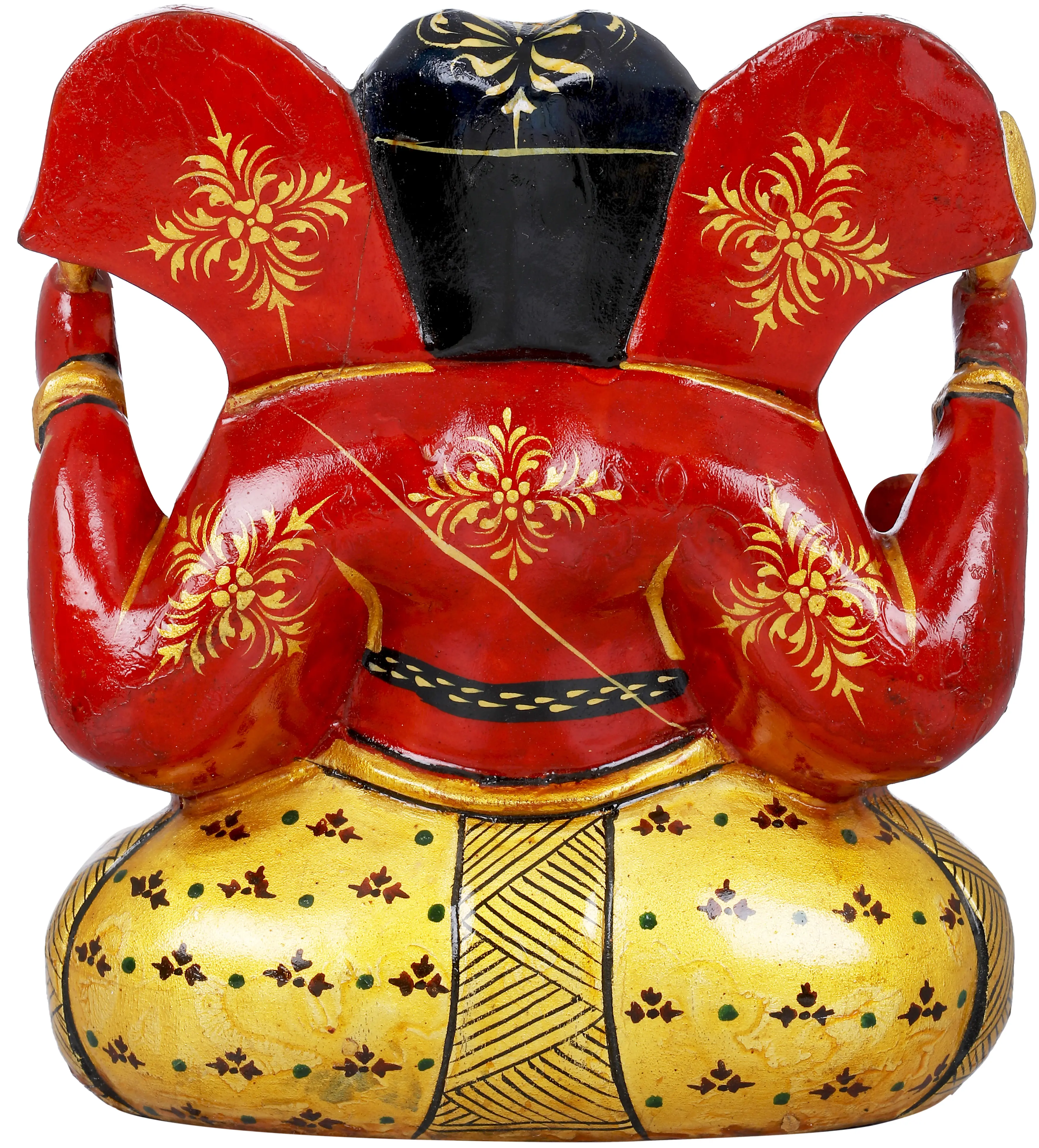 This is a small portly figured sitting Ganesha having four hands and two legs. Right hand is in Abhaya Mudra blessing his devotees and left hand is holding a laddoo. The other two hands are holding his sacred weapons for protecting the mankind. Legs are in a sitting posture and the feet are joined together. It is a rare red colored piece of Lord Ganesha, having golden colored printed briefings of ornaments and flower designs on front and back making it the most unique one. Face, trunk and the printed dhoti are giving a beautiful contrast with golden color. Red ears having golden earlobes patterned with black color are enhancing its naturality. The trunk, folded from below has mesmerizing flower patterns focusing its exclusiveness. The face has a red colored Shaivite tilak. Distinct shade of black on palms and feet are matching with the ornamented black hair at the back. Structure of eyes is reflecting its power and boldness.