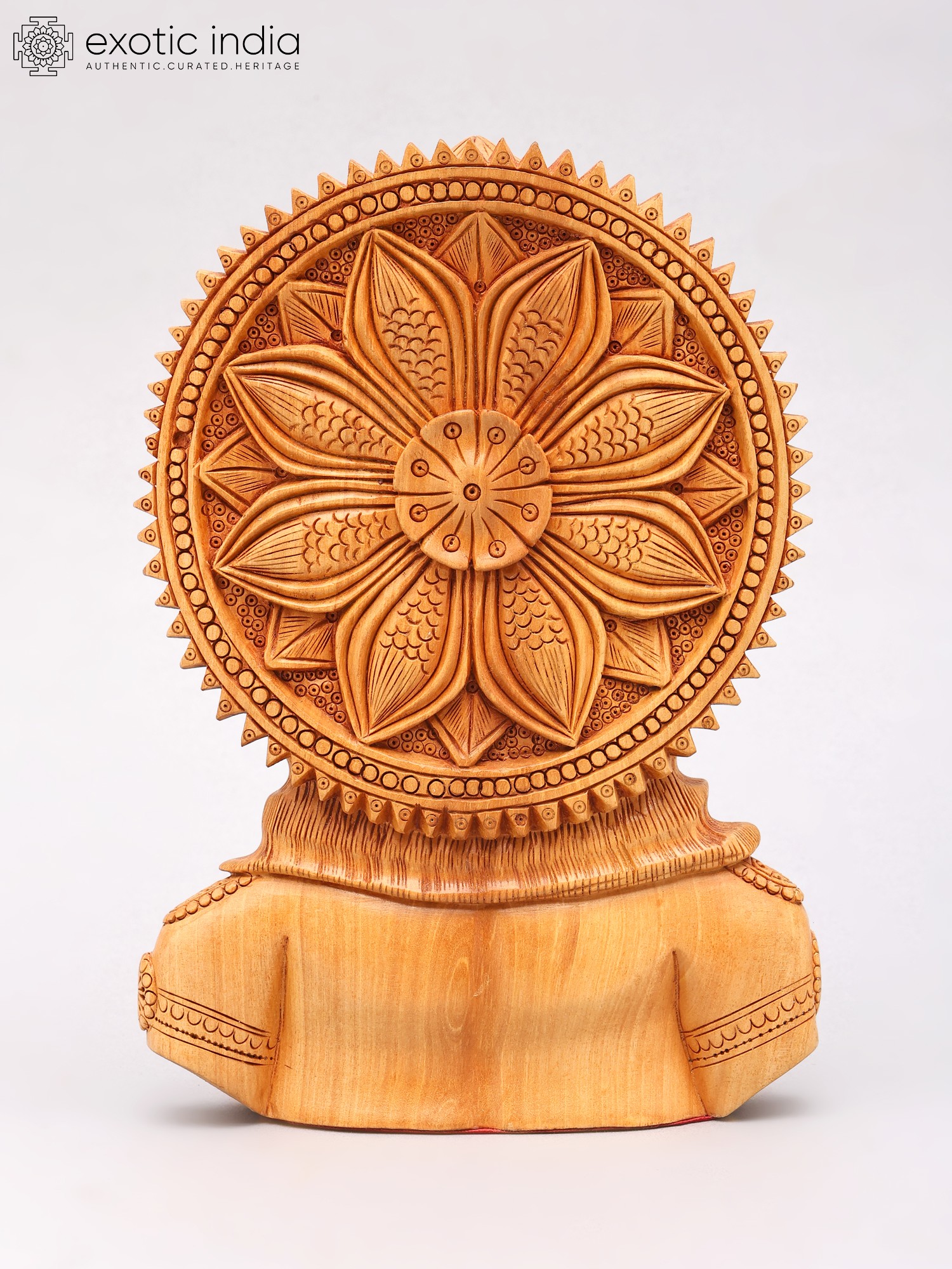 The serene expression, with eyes gently closed in meditation, conveys a deep inner peace. A magnificent, multi-tiered crown adorns the head, richly detailed with floral motifs and geometric patterns, transitioning into a radiant halo that encircles the sculpted form. Elaborate necklaces and armbands, finely incised with crosshatch and circular designs, further accentuate the regal and divine presence. The warm, natural finish of the wood enhances its tactile appeal, inviting admiration and contemplation of its substantial form, measuring approximately 8 inches in height.