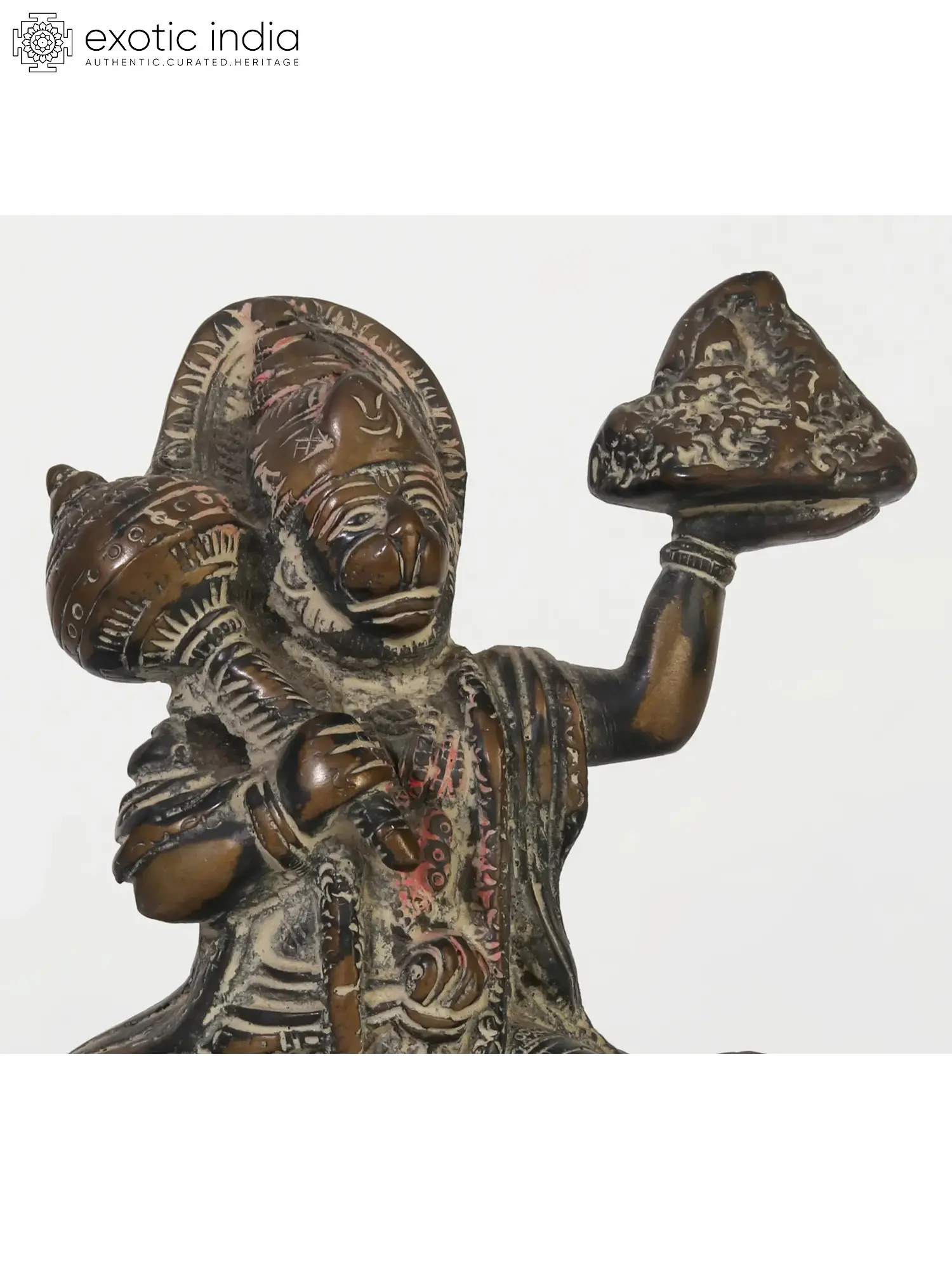 In the ethereal realm of divine artistry, behold this awe-inspiring spectacle of Lord Hanuman, “also known as Sarvamayavibhanjana (the Destroyer of all Illusion)”, standing tall and resplendent. His left hand cradles the life-restoring the “Sanjeevani Mountain”, a beacon of hope. A mighty mace, resting on his broad shoulder, exemplifies his unmatched strength. Regal attire adorns his majestic form, a flowing robe gracefully draping his shoulders. Langot (Loincloth) hints at his profound humility, even in his grandeur. Atop his head rests the “Pitambara Mukut”, a symbol of his celestial lineage. With a heart ablaze with devotion, Hanuman, “the Immortal One”, stands poised for flight, a sentinel of unwavering devotion and unwavering service to “Dharma”. This brass portrayal encapsulates his unwavering commitment to revive Lakshmana (Lord Rama’s Brother), symbolising the limitless power of faith and the triumph of good over adversity.