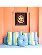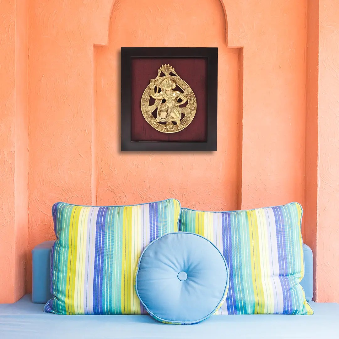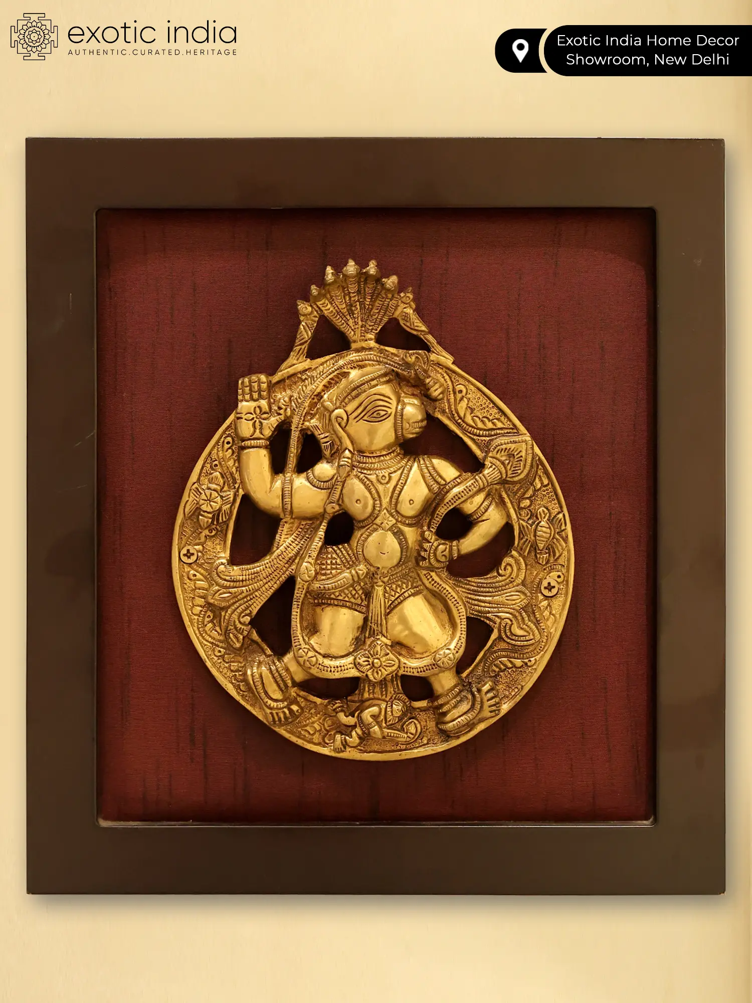 The guarding gaze of Pavanaputra Hanuman is residing in this brass and wood wall hanging which you can add to your space to experience the Shakti of the mighty Rama-bhakta. Placed within a simple wooden frame, Hanuman is encircled by an exquisitely sculpted ring, which is adorned by the image of five-hooded Adi Shesha on top. Against a beautiful burgundy backdrop, the golden hue of brass stands out, with Hanuman with his hand in Abhaya mudra, dispelling all fear and negativity from one’s life.