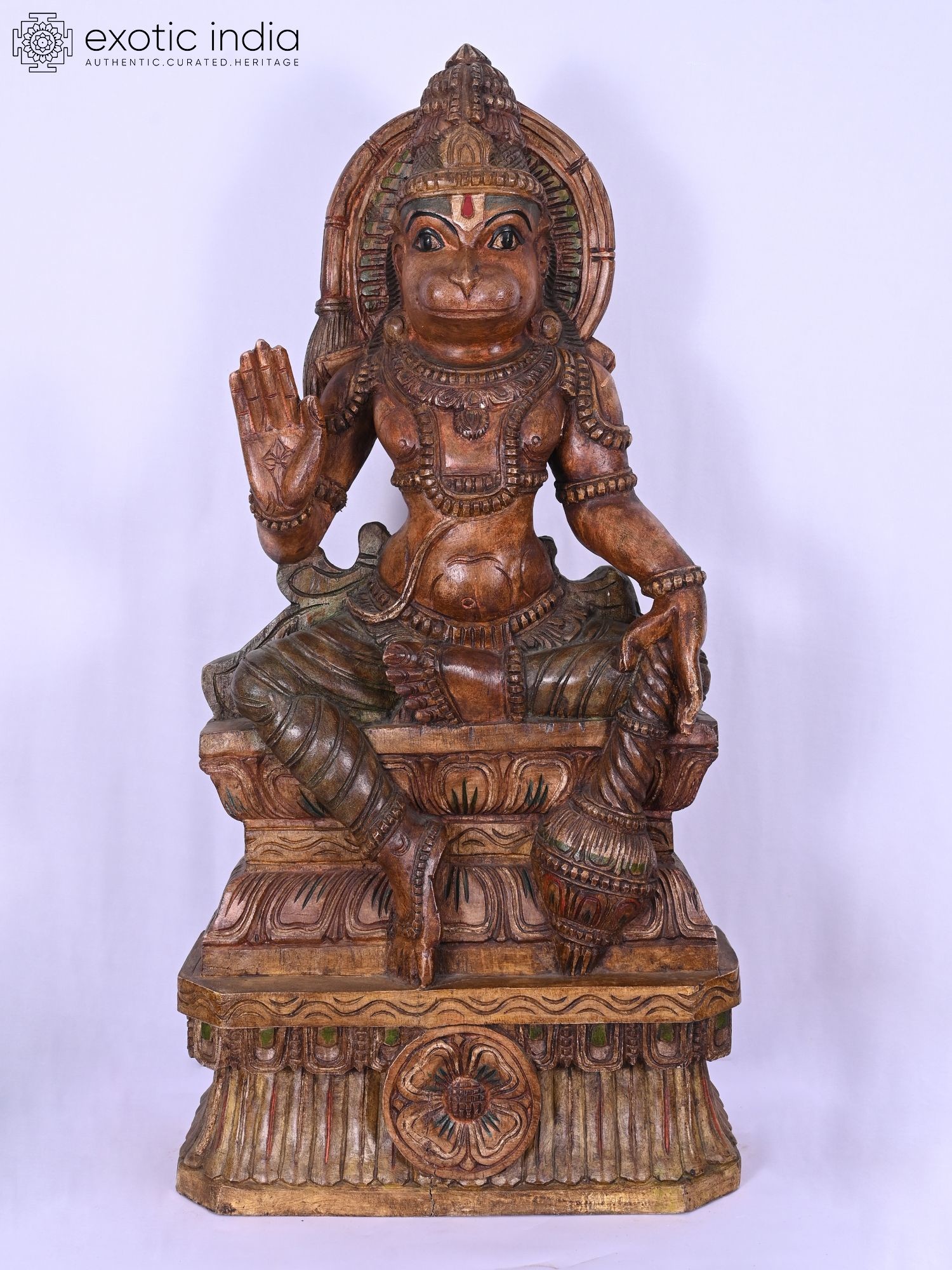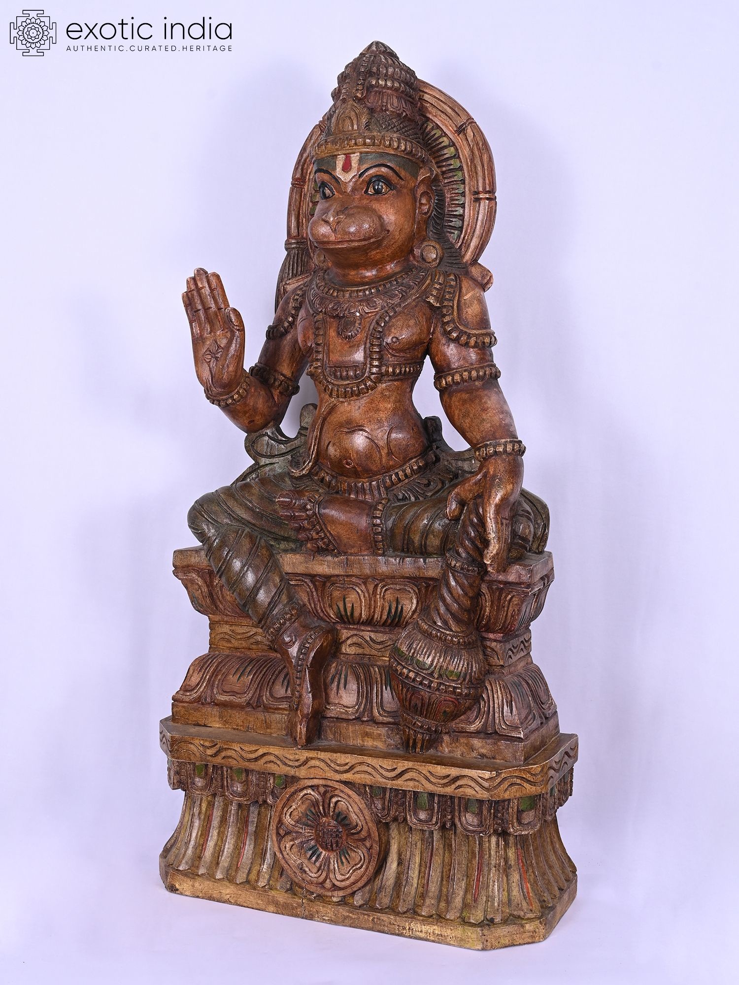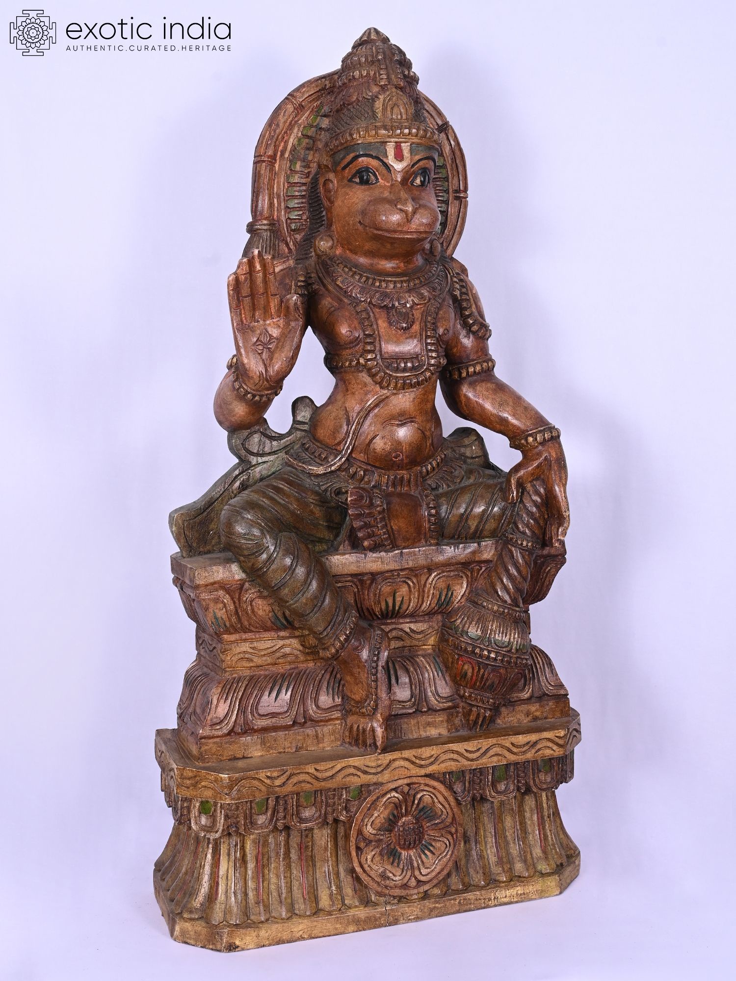 This 37-inch wooden statue depicts Lord Hanuman in a seated posture, representing devotion and strength.