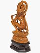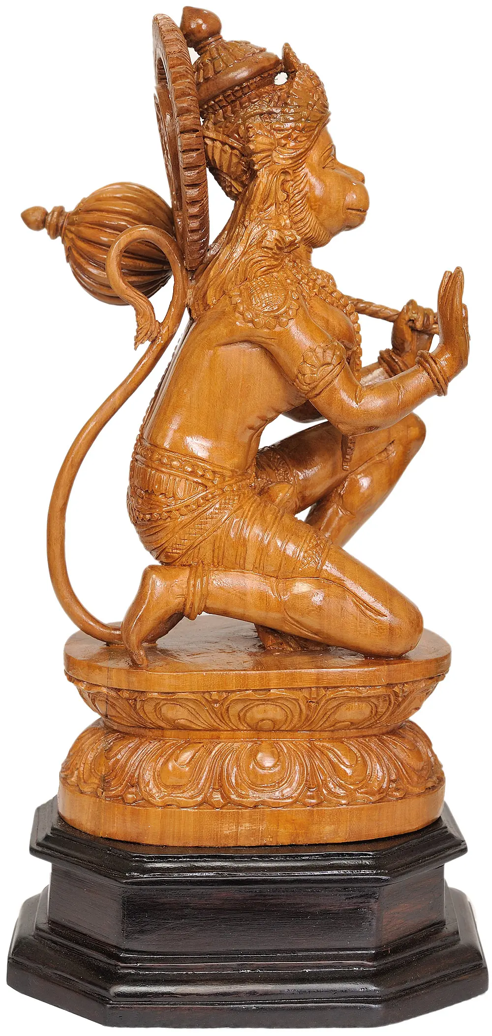 This exquisite teak wood carving captures the divine essence of Lord Hanuman, a central figure in Hindu mythology renowned for his unwavering devotion, immense strength, and selfless service. Crafted with meticulous detail, the statue portrays Hanuman in a characteristic pose, kneeling with one knee raised and the other on the ground, exuding a sense of reverence and readiness. His face, with its gentle yet resolute expression, reflects the deep piety that defined his life. The intricate carving of his ornaments, including a traditional mala (garland) and a mace, further adds to the authenticity and artistic merit of this piece. The radiant halo behind his head symbolizes his divine aura and the boundless energy he possessed.