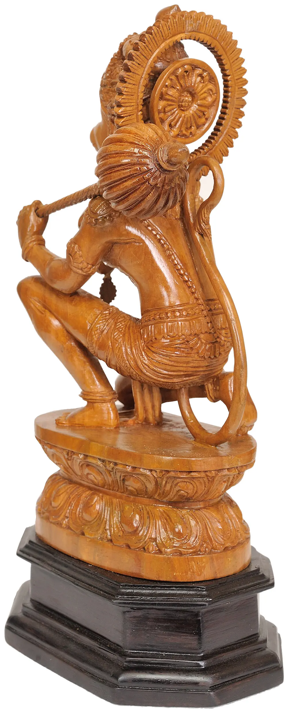 The choice of teak wood for this statue is significant. Teak is known for its durability, fine grain, and rich natural color, which allows for intricate carving and a beautiful, lasting finish. The wood itself lends a warm and natural feel to the representation of the divine. The artist has skillfully brought out the texture of Hanuman's form, from the musculature of his limbs to the delicate folds of his attire. The detailed rendering of the facial features, the adornments, and the halo showcases the artisan's mastery and dedication to capturing the divine form with reverence and precision. Each chisel stroke tells a story of dedication, transforming a block of wood into a symbol of spiritual significance.