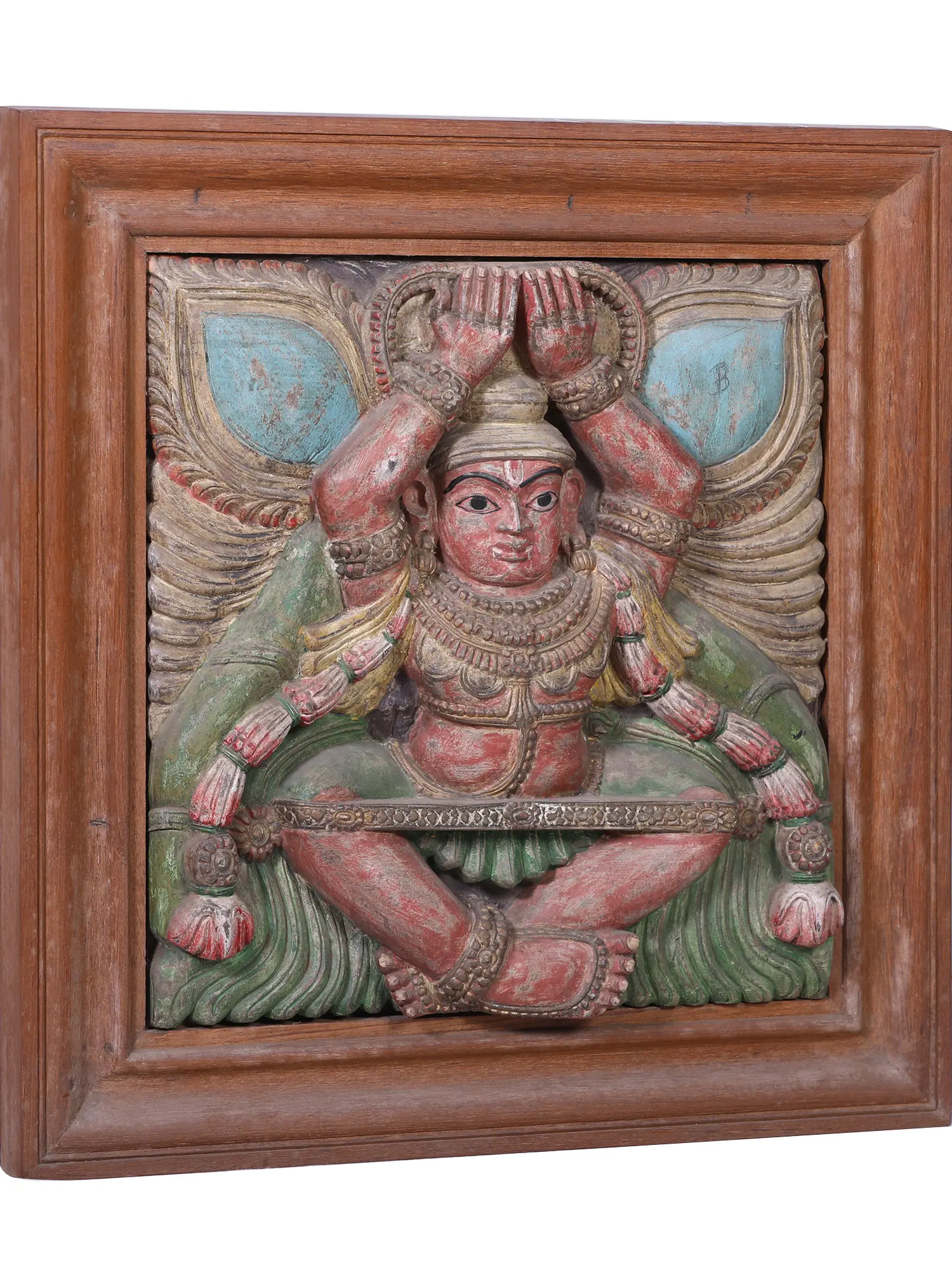 The seated posture of Lord Indra, along with his hands raised in a gesture that can be interpreted as devotion or invocation, creates a harmonious and contemplative presence. The stylized wings or aureole behind him suggest his celestial nature and omnipresence. This panel is more than just an object of art; it is believed to bring an aura of peace, prosperity, and divine protection to its surroundings. Its intricate details, from the texture of the wood to the carefully painted adornments, invite closer inspection and contemplation, offering a continuous connection to the stories and beliefs it represents. This piece is an ideal addition for anyone seeking to infuse their living space with spiritual significance and artistic elegance.