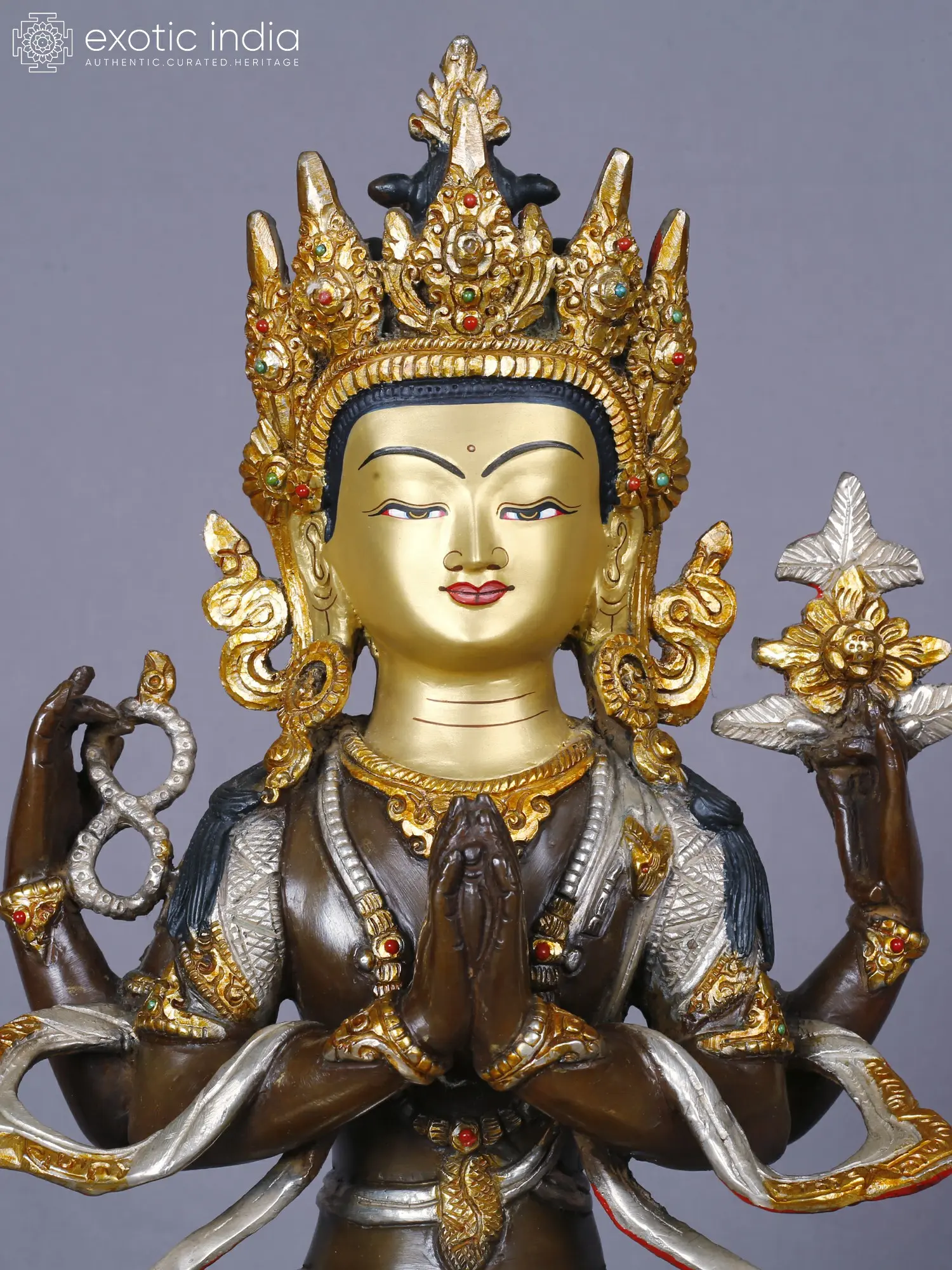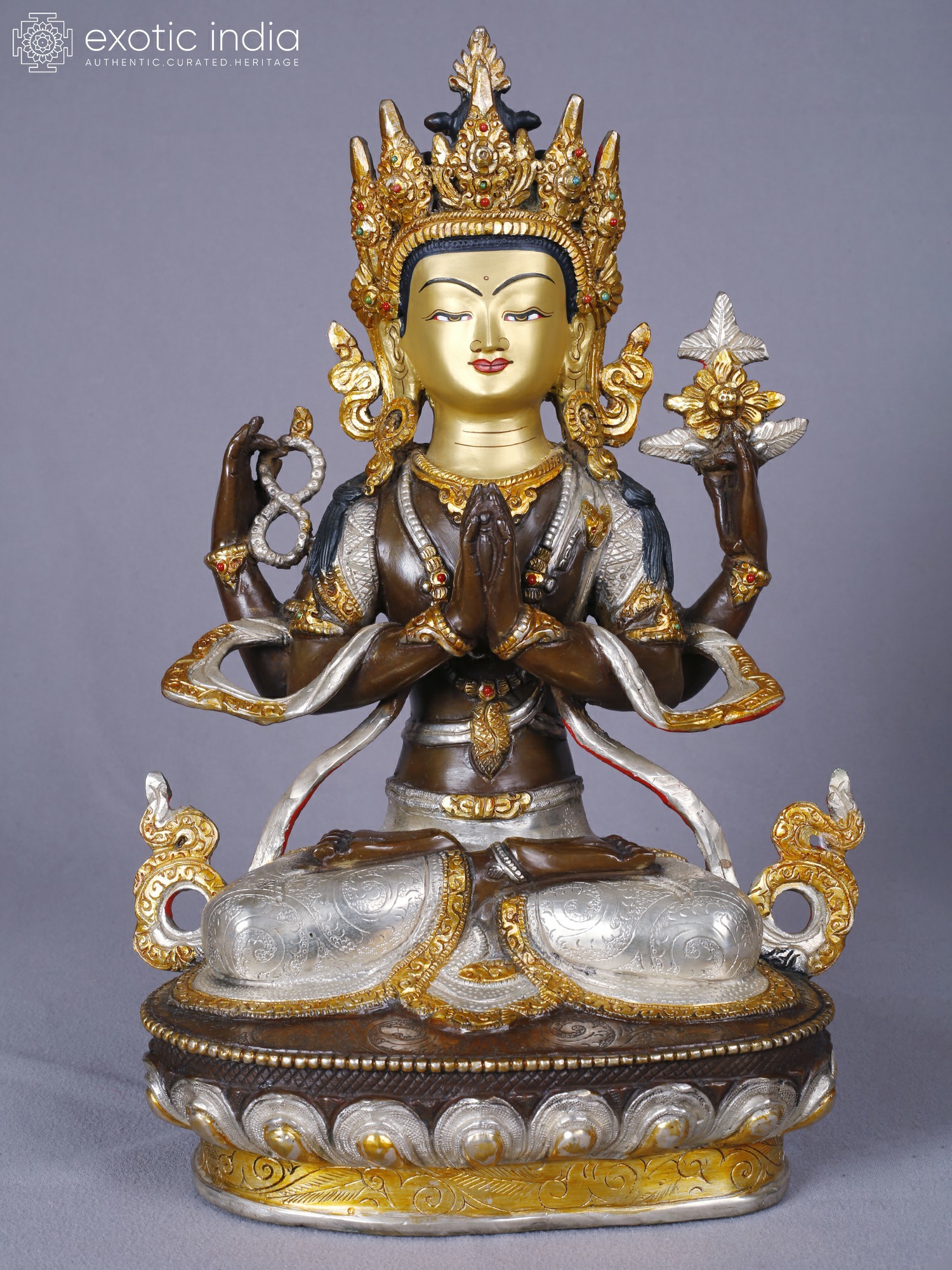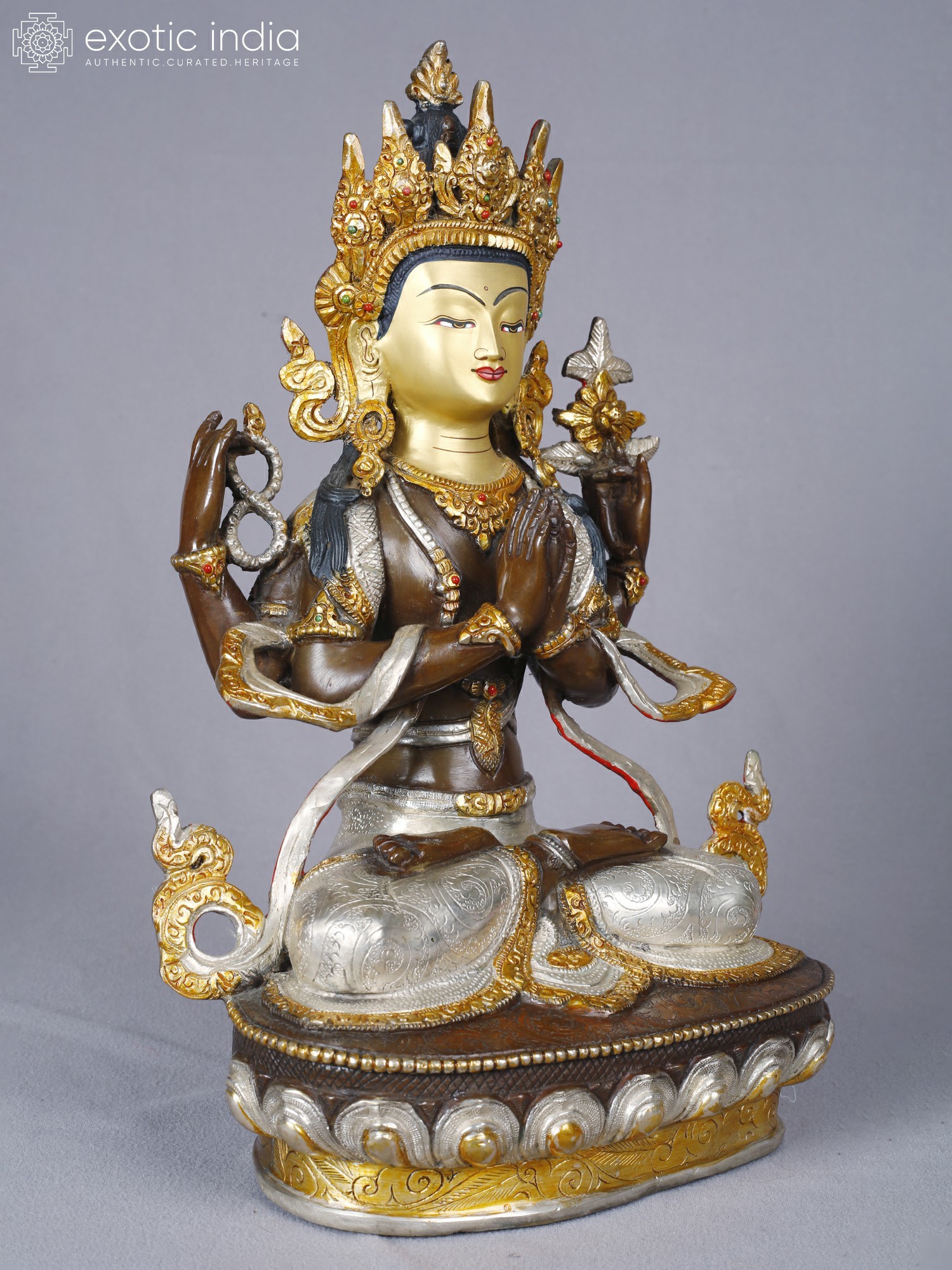 You’ll appreciate the stunning visual narrative woven into every aspect of its design. The deity's serene countenance, rendered in warm gold, is framed by an ornate, jeweled crown and intricate accoutrements, highlighted with touches of vibrant color. The flowing robes and layered garments are brought to life with contrasting silver and gold finishes, each element carefully crafted to capture the essence of divine grace. The subtle yet significant hand gestures, conveying specific blessings and teachings, add layers of meaning for those who understand their profound significance.