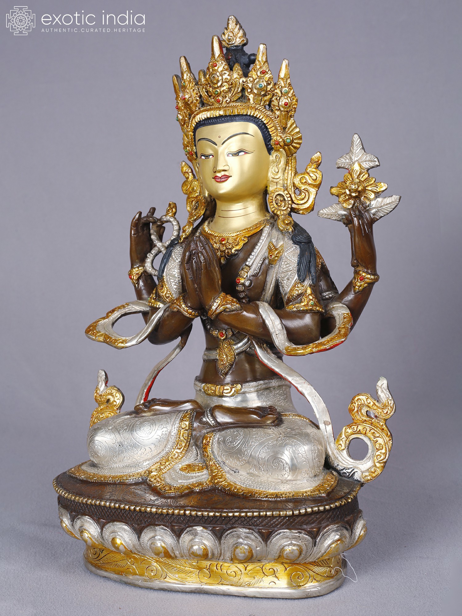 Lord Manjushree Buddhist Deity Idol | Copper with Gold and Silver Plated | Handmade Exquisite Art