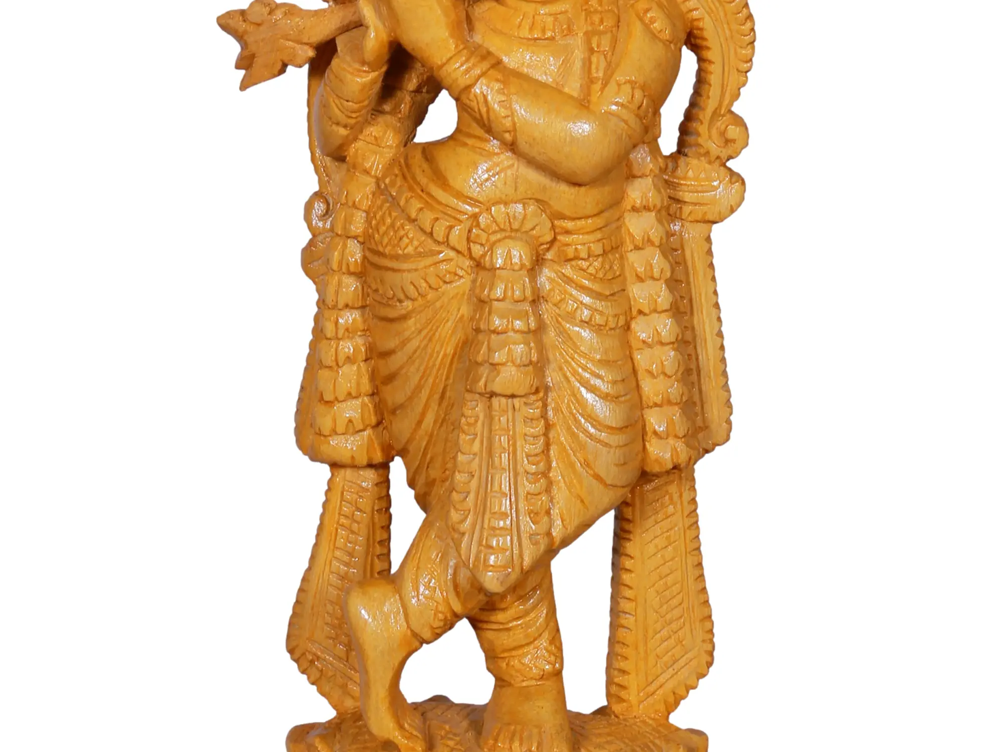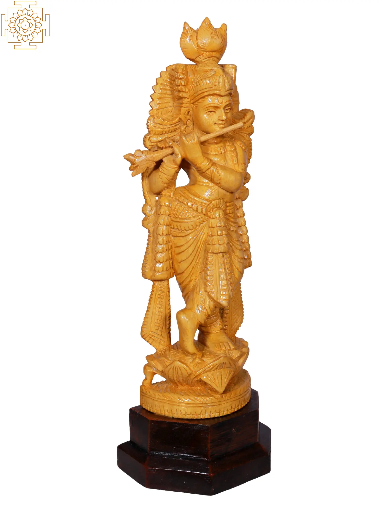 Murli-Dhara or Krishna with his Murli or flute is a classic representation of the beautiful god in Hinduism, as a symbol of his eternal and sweet presence amongst his devotees, guiding them with the tunes of his flute. This wooden statue of Krishna presents his form as Murli-Dhara, standing on a lotus pedestal, in a splendid Tribhanga or triple bent pose.