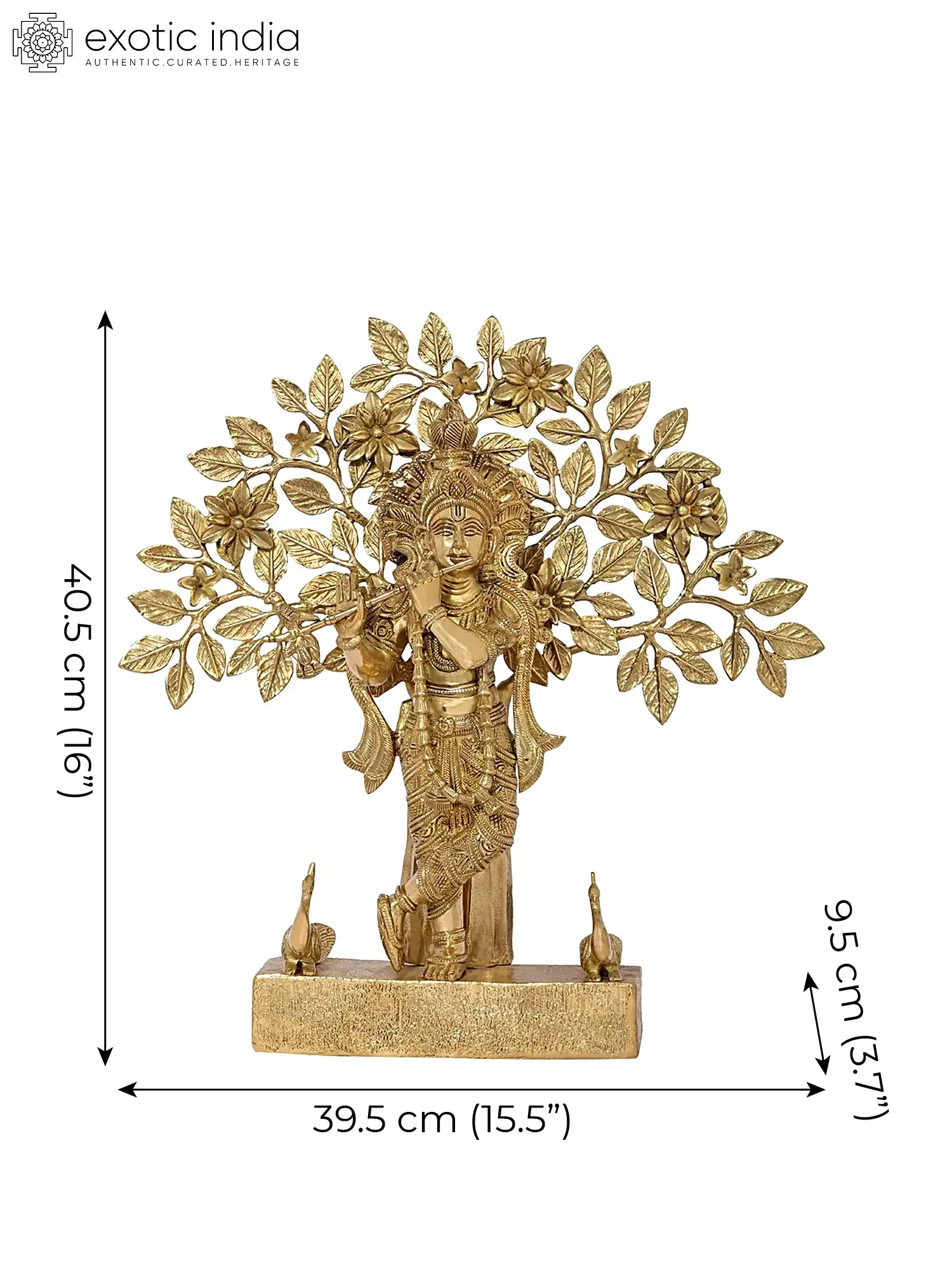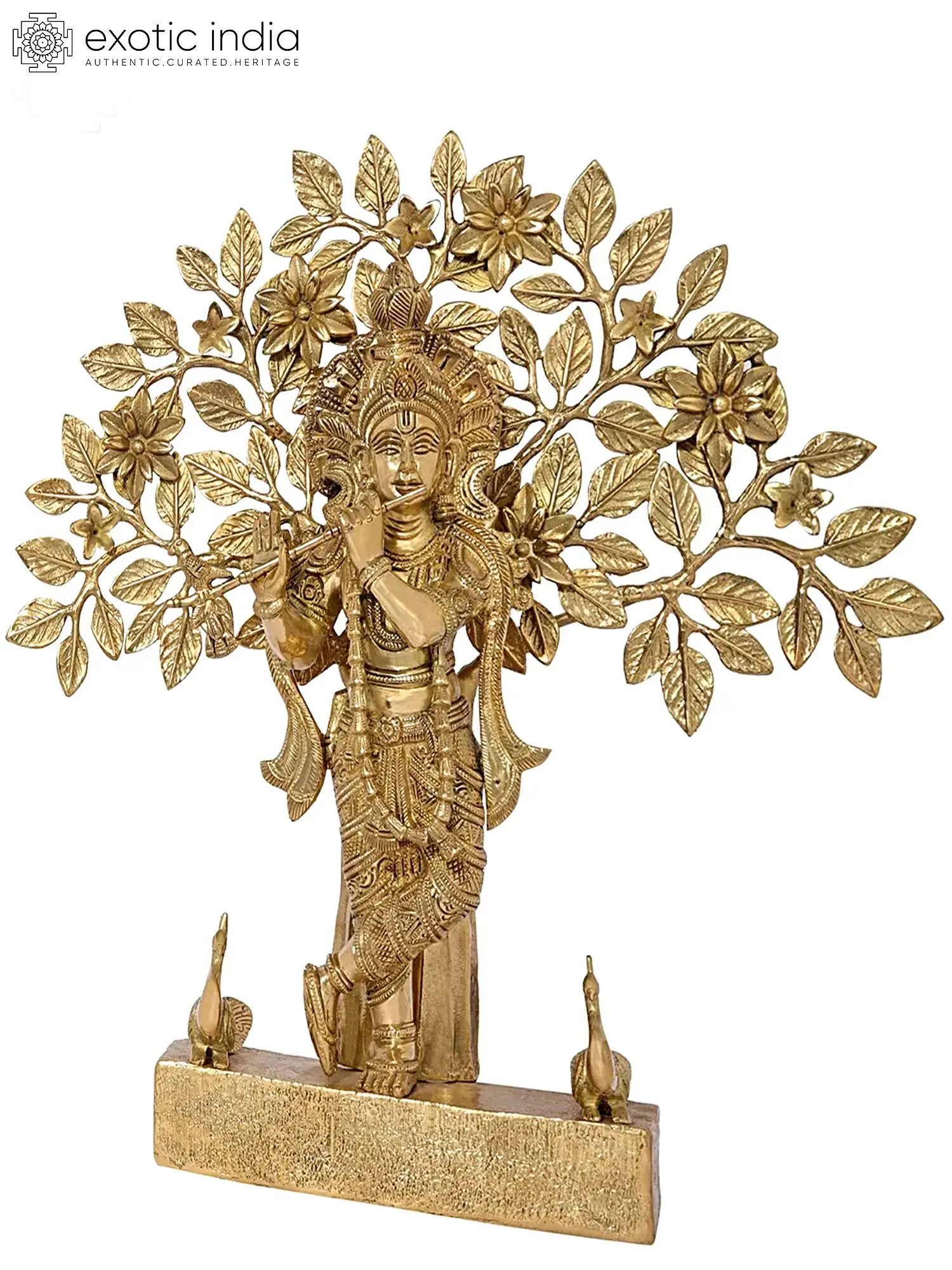 The brass sculpture capturing Lord Krishna playing the flute beneath a flourishing tree, adorned with vibrant flowers, and accompanied by two majestic peacocks, is a scene that radiates divine charm and natural beauty. Crafted with intricate detail, the statue brings to life Krishna's serene visage as he produces enchanting melodies from his flute. The brass medium adds a timeless luster, enhancing the sacred ambiance. The presence of flowers surrounding the divine scene symbolizes the divine touch in nature, infusing the sacred space with a riot of colors and fragrances.