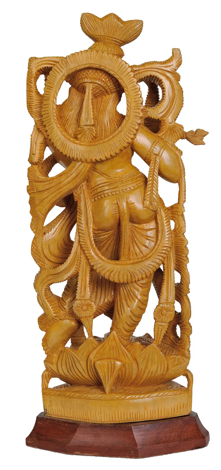 This intricately carved statue captures the essence of Krishna, one of the most beloved deities in the Hindu pantheon. Depicted in a relaxed and graceful stance, he holds his flute, ready to enchant the world with its melodious tune. Every detail, from the serene expression on his face to the flowing garments, reflects the artistry and devotion of the craftsman. The wood grain, smooth and warm, adds to the piece's tactile appeal, inviting the viewer to connect with the divine presence it embodies. The statue rests upon a base carved in the shape of a lotus, the symbol of purity, enlightenment, and divine beauty in Hinduism. This elevates Krishna both physically and spiritually, emphasizing his transcendence and connection to the higher realms. The lotus, born from the mud, blossoms into exquisite perfection, mirroring Krishna's ability to transform the mundane into the divine.