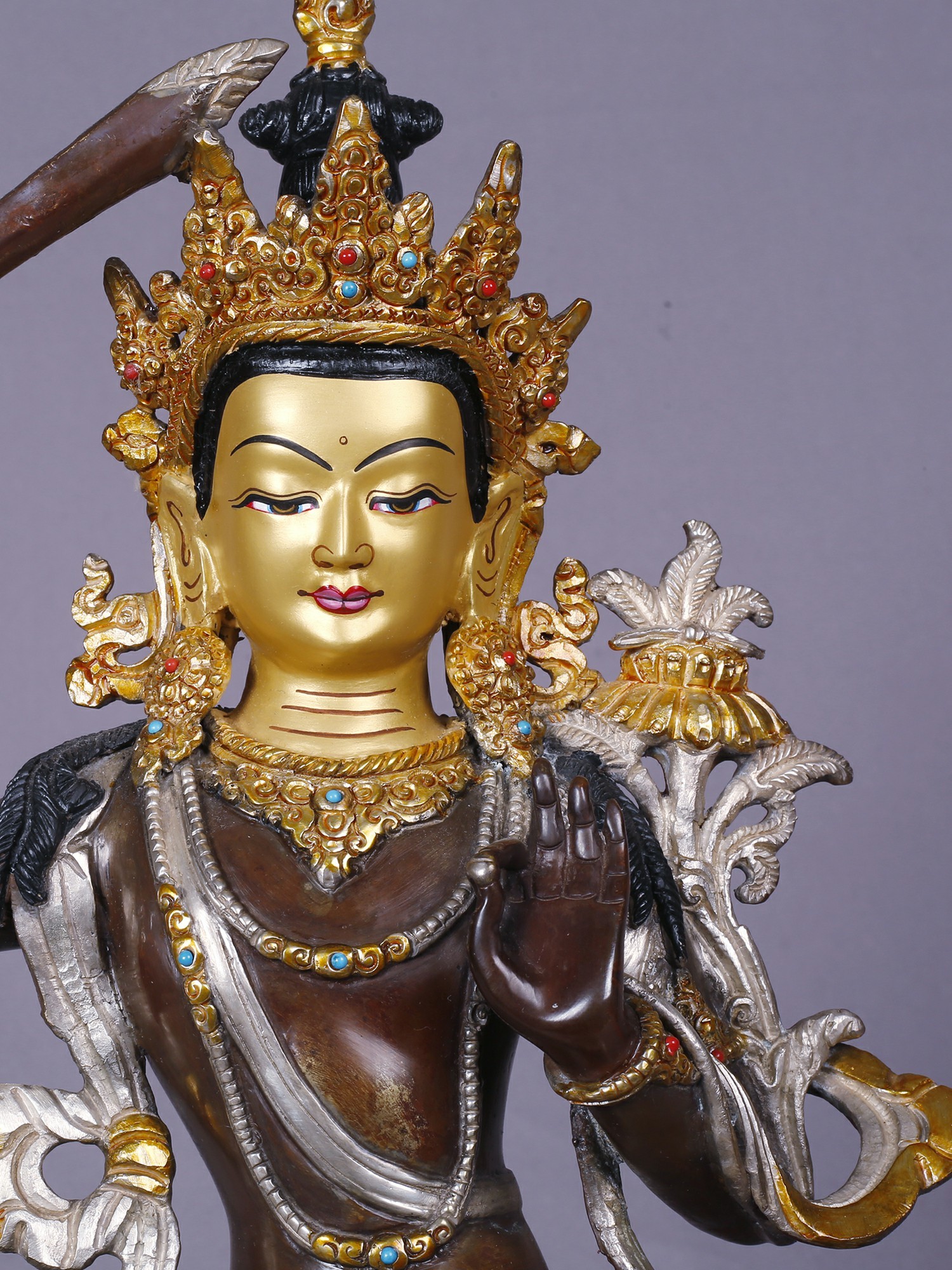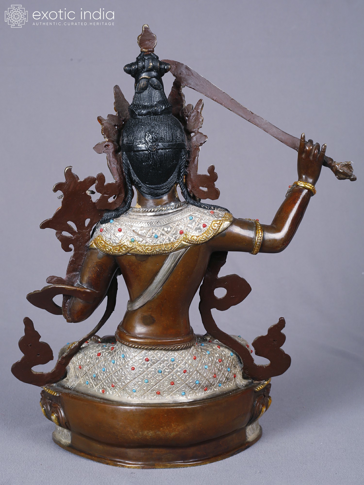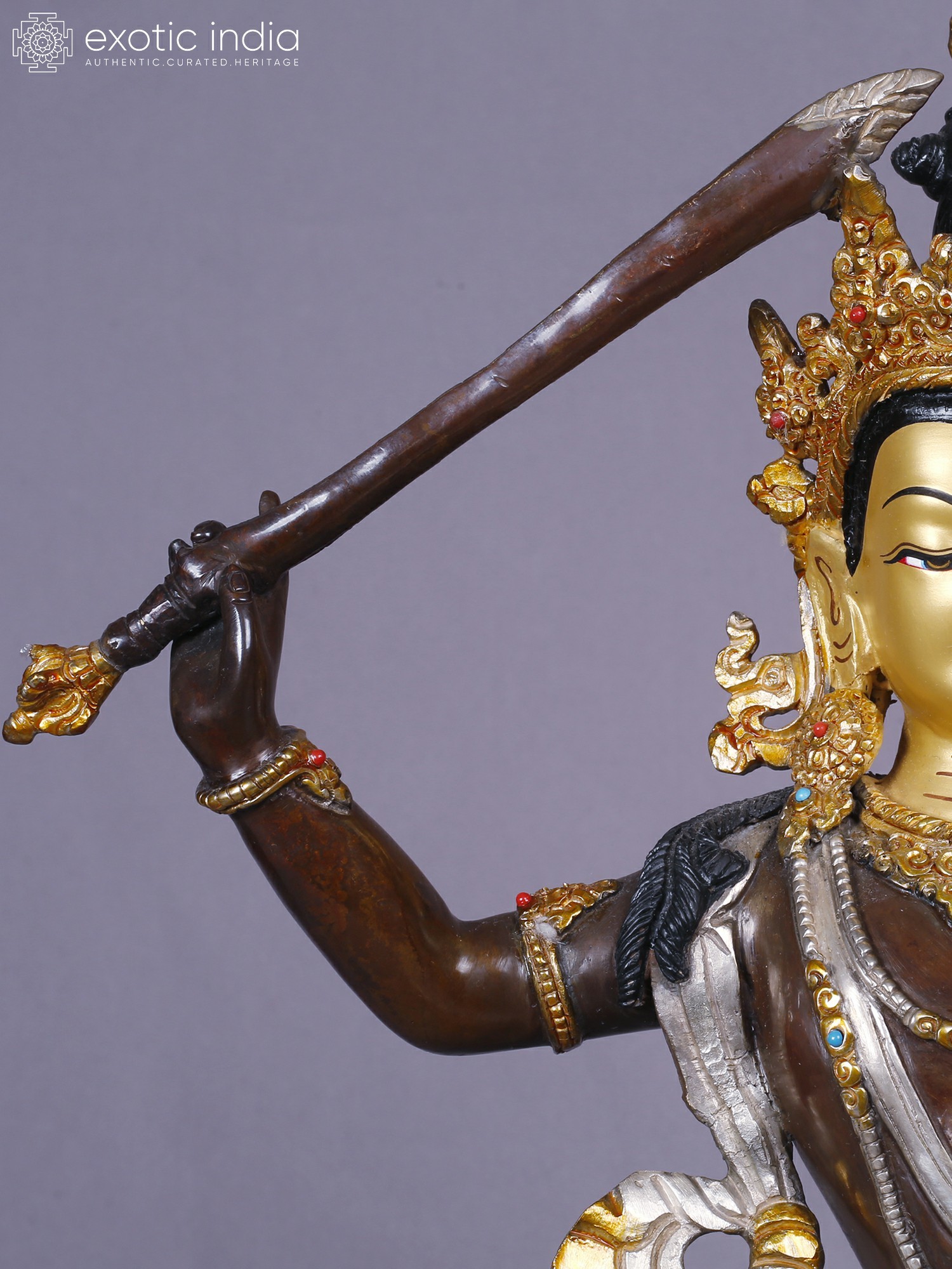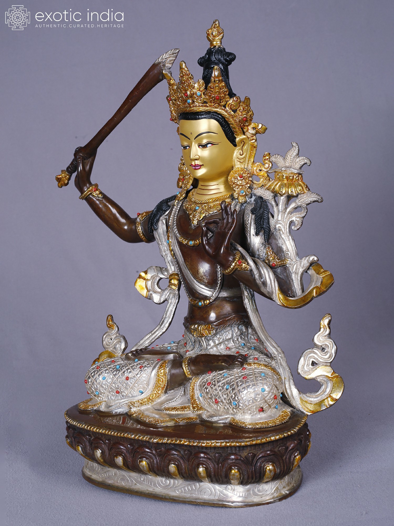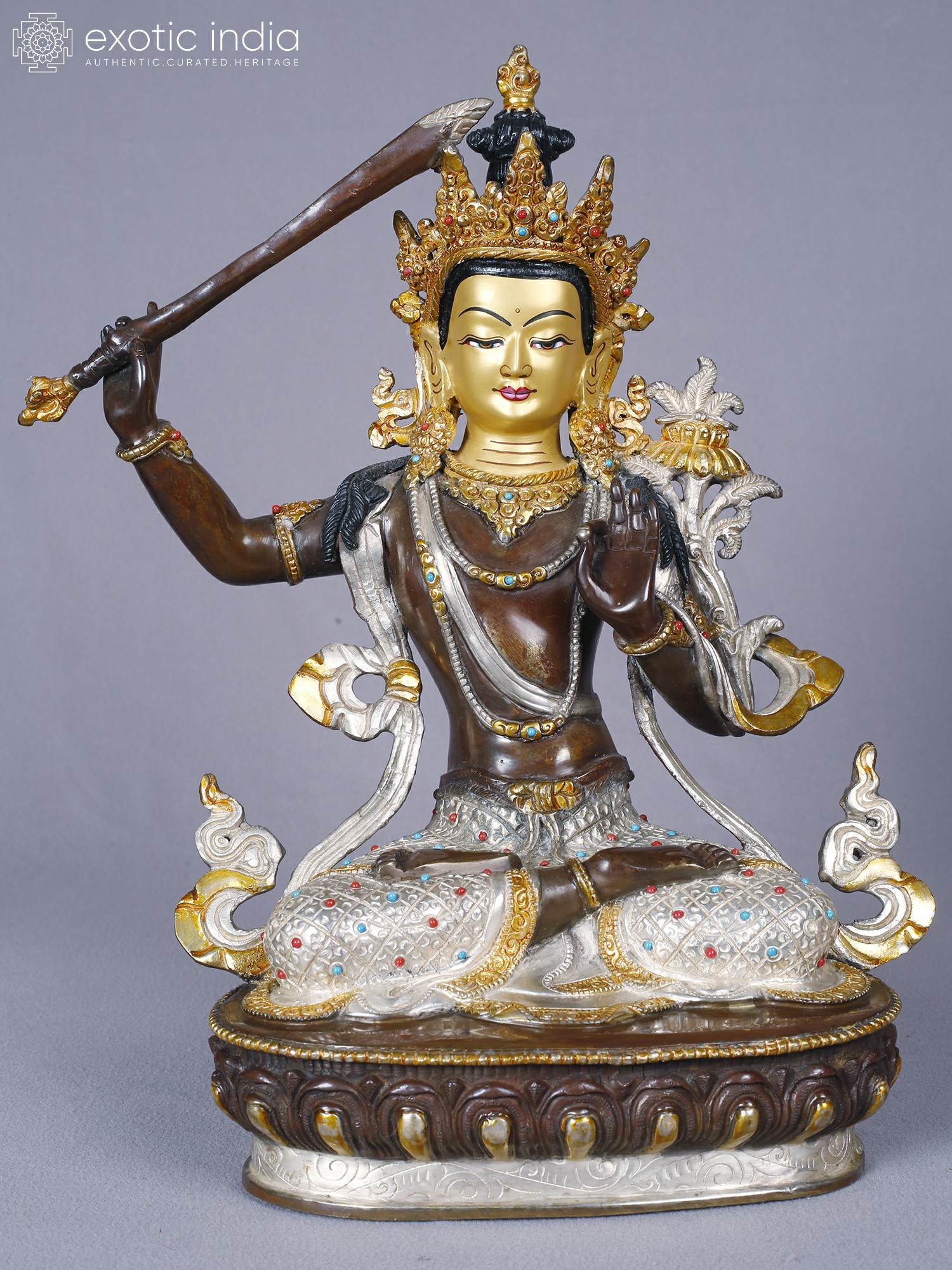 The form stands approximately 13 inches tall, offering a substantial yet elegant presence. Its intricate detailing, from the serene facial expression to the elaborate crown and jewelry, is enhanced by the gleaming contrast of gold and silver against the burnished copper. Observe the delicate rendering of the flowing robes and the powerful gesture of the raised sword, a symbol of severing ignorance. The jeweled embellishments, featuring vibrant hues, add a touch of regality and spiritual vibrancy.