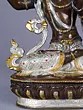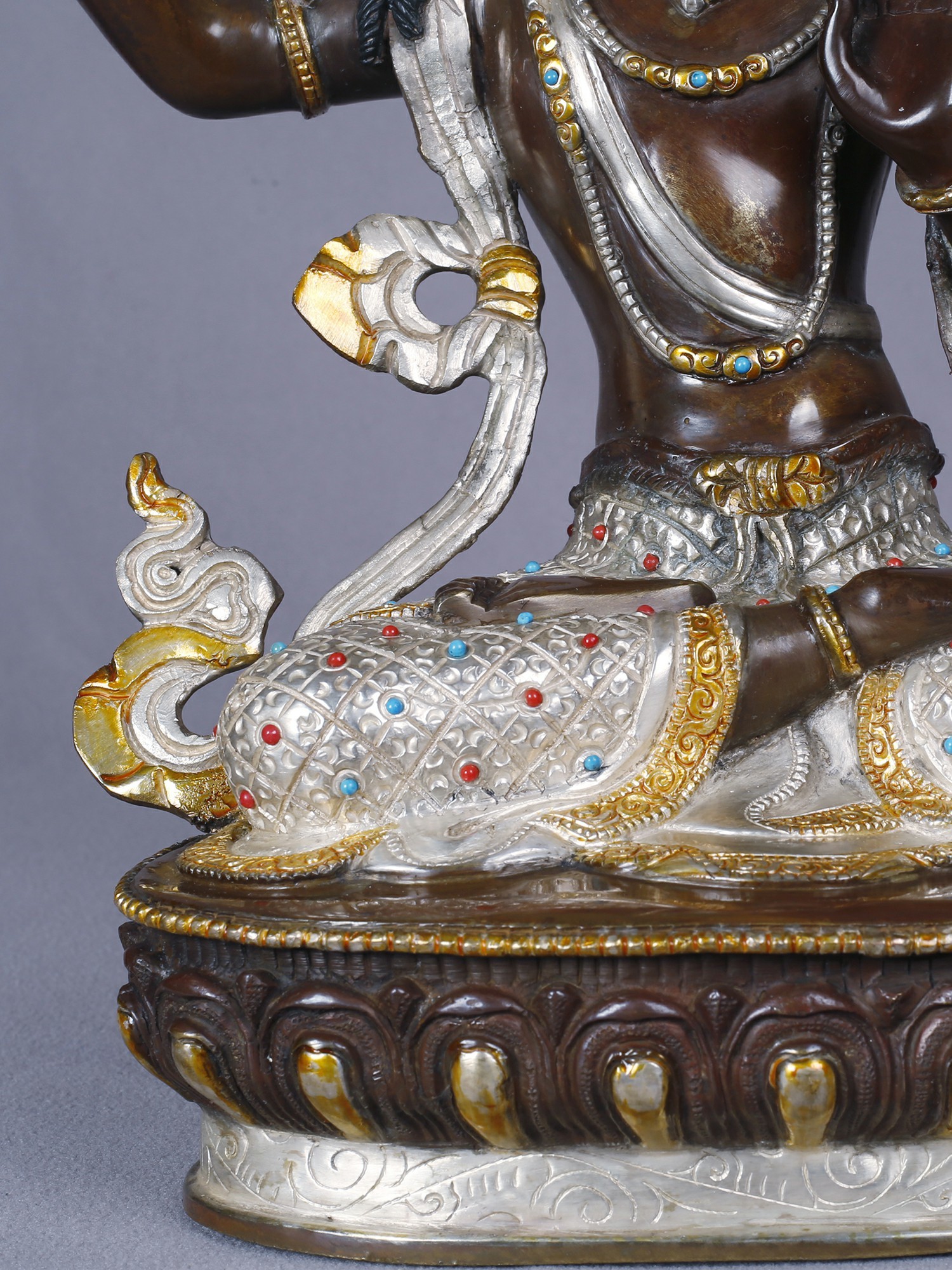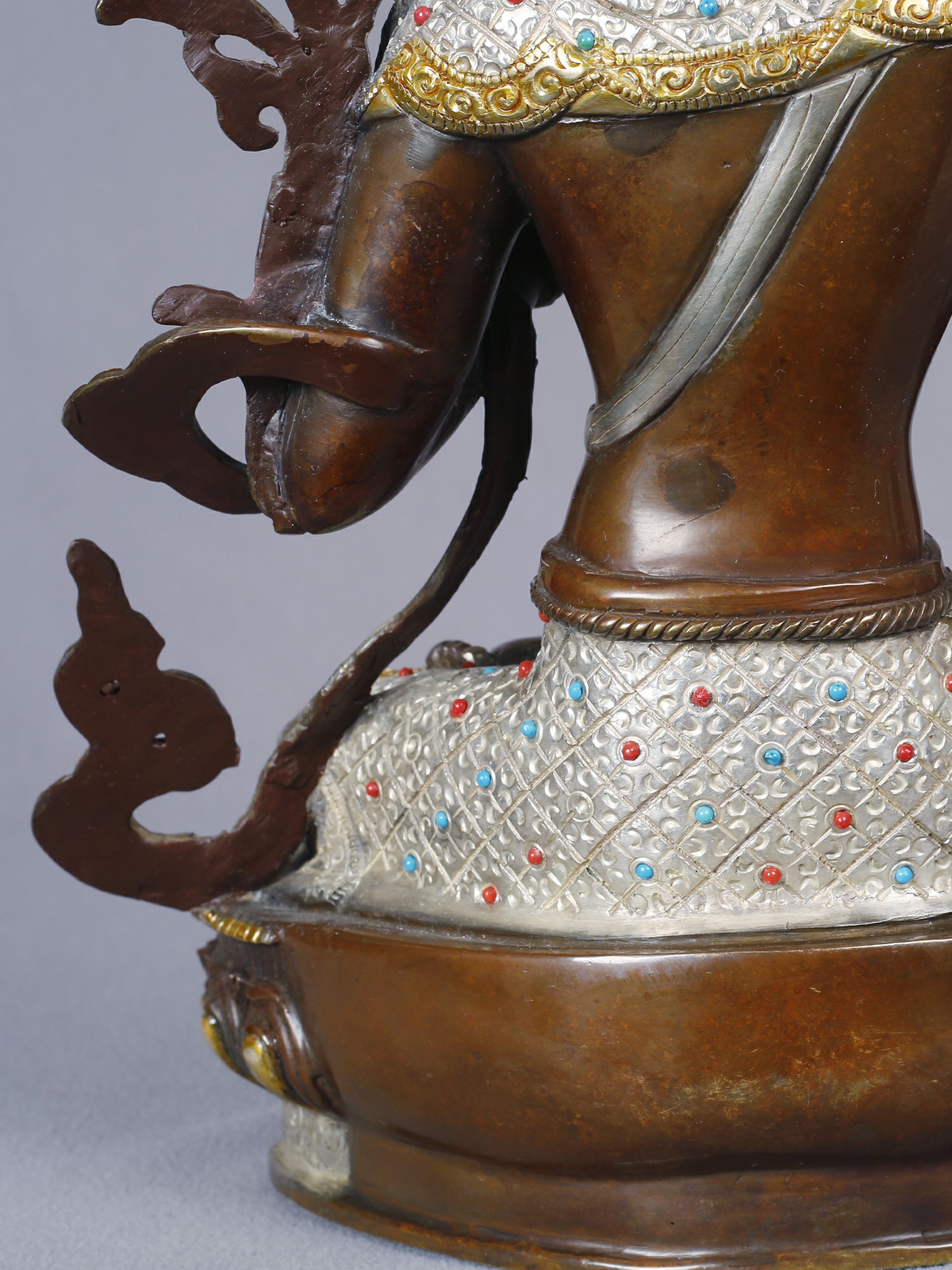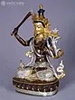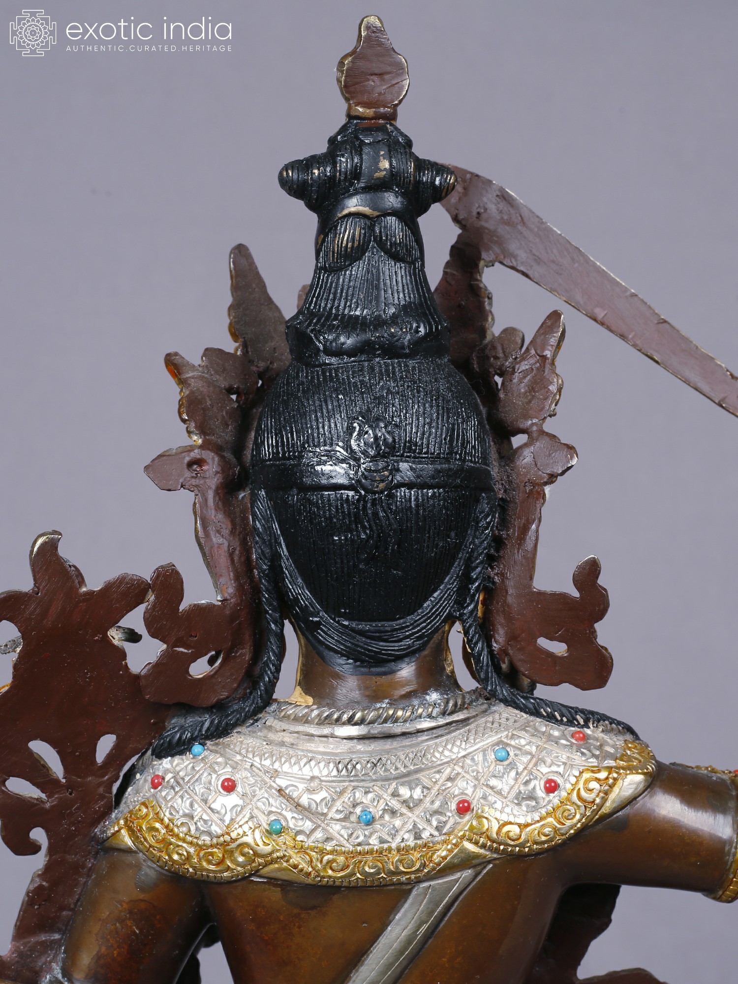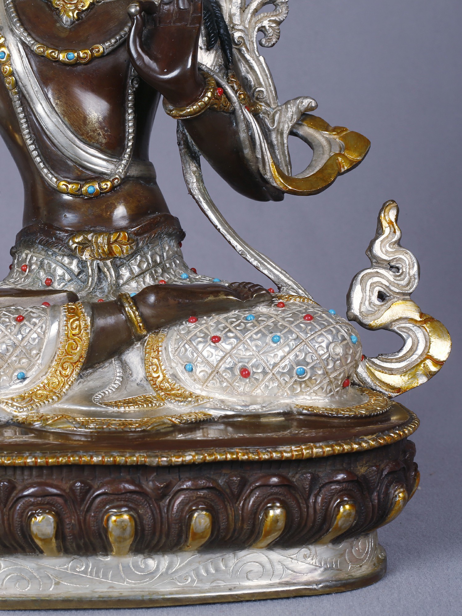 The form stands approximately 13 inches tall, offering a substantial yet elegant presence. Its intricate detailing, from the serene facial expression to the elaborate crown and jewelry, is enhanced by the gleaming contrast of gold and silver against the burnished copper. Observe the delicate rendering of the flowing robes and the powerful gesture of the raised sword, a symbol of severing ignorance. The jeweled embellishments, featuring vibrant hues, add a touch of regality and spiritual vibrancy.