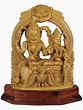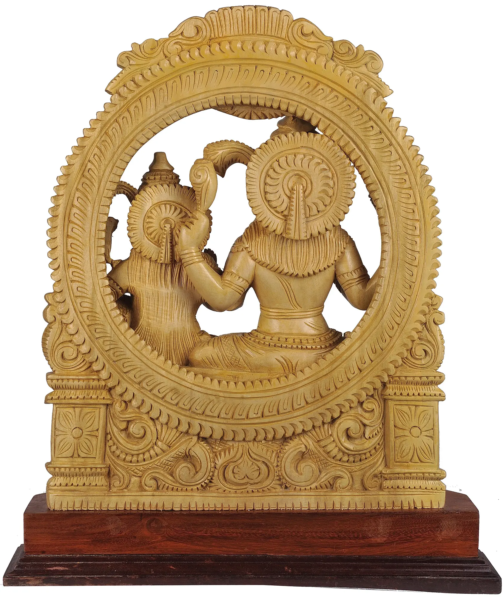 This exquisitely carved statue captures the powerful image of a divine couple: Narasimha, the Man-Lion avatar of Vishnu, and Lakshmi, the Goddess of wealth, prosperity, and auspiciousness. The intricate detailing showcases the skill of artisans from Trivandrum, renowned for their mastery of wood carving. Every curve and contour has been carefully shaped to bring forth the divine essence of these figures, creating a truly captivating and inspiring work of art. The serene and regal posture of both deities invites contemplation and reverence. Narasimha, with his lion's head and human body, represents the triumph of good over evil. Lakshmi, seated beside him, embodies grace, beauty, and abundance. Together, they signify a harmonious balance of power and compassion, protection and provision.