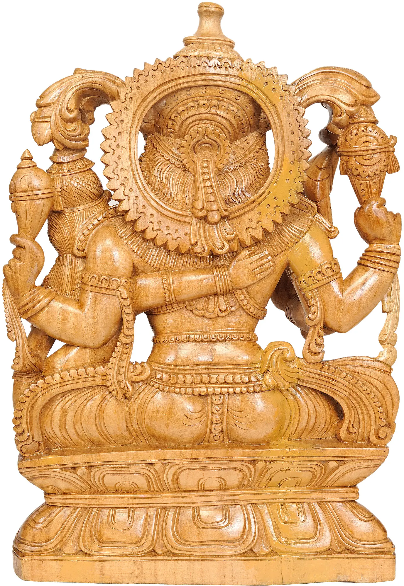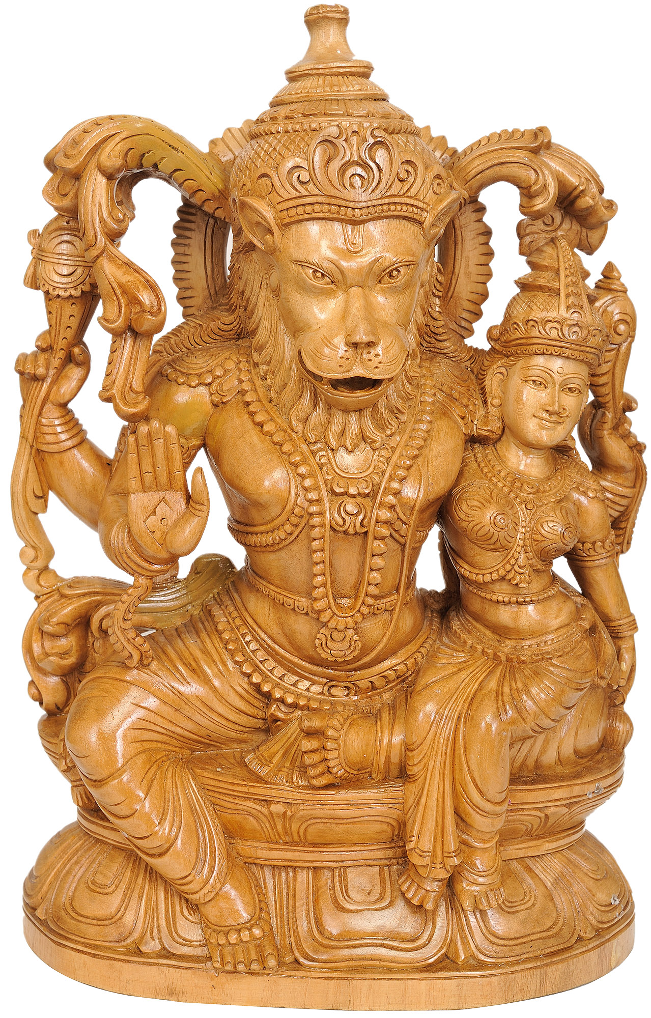 Beside the formidable Narasimha sits Goddess Lakshmi, the divine embodiment of wealth, fortune, beauty, and prosperity. Her gentle smile and graceful posture offer a stark yet complementary contrast to the fierce aspect of her divine husband. She is the bestower of abundance, both material and spiritual, and her presence signifies blessings, good luck, and a life of fulfillment. In Hindu traditions, Lakshmi is invoked not just for material riches but also for spiritual enlightenment and well-being. The juxtaposition of Narasimha and Lakshmi highlights the belief that true prosperity can only flourish in a world protected by divine justice. This carving is more than just a decorative object; it is a tangible representation of profound spiritual concepts. The warm, natural tones of the White Cedar wood lend an aura of authenticity and reverence. The meticulous attention to detail in every aspect of the carving—the layered robes, the elaborate headdresses, the serene expressions, and the powerful musculature—makes this a truly captivating piece. It serves as a constant reminder of the divine forces that safeguard and nurture the universe, encouraging devotees to seek protection, prosperity, and inner peace. This masterful creation is destined to become a cherished centerpiece in any sacred space or home, radiating divine energy and artistic brilliance.