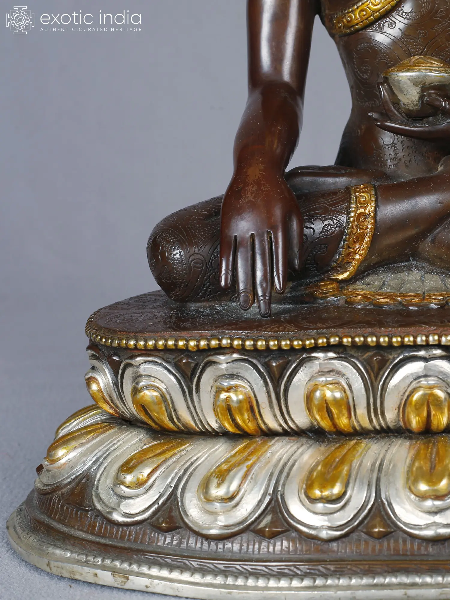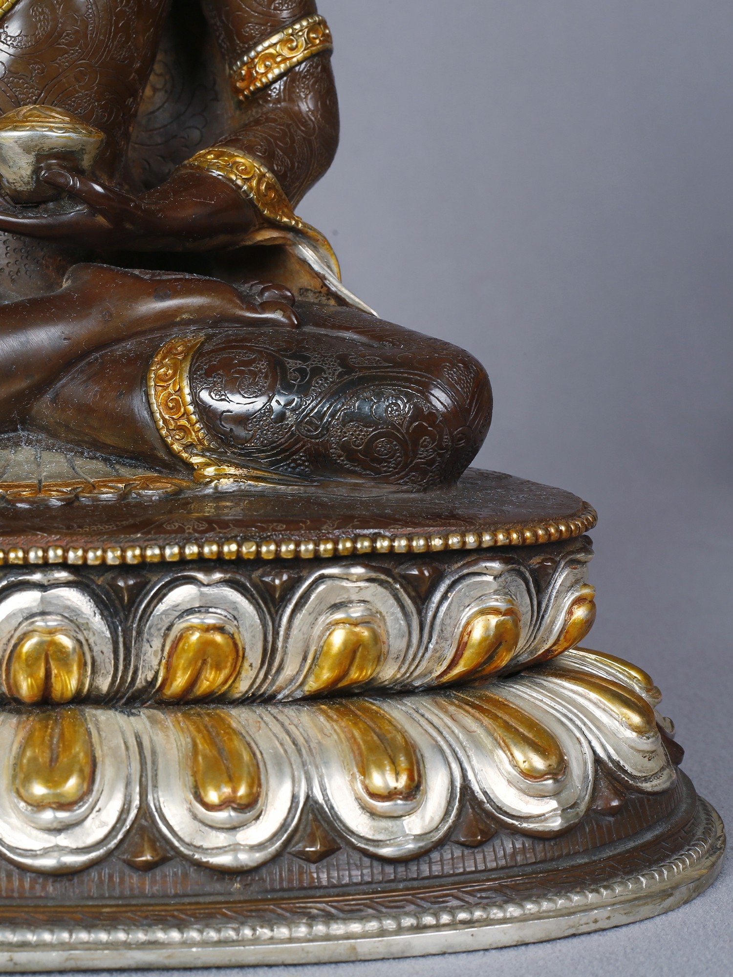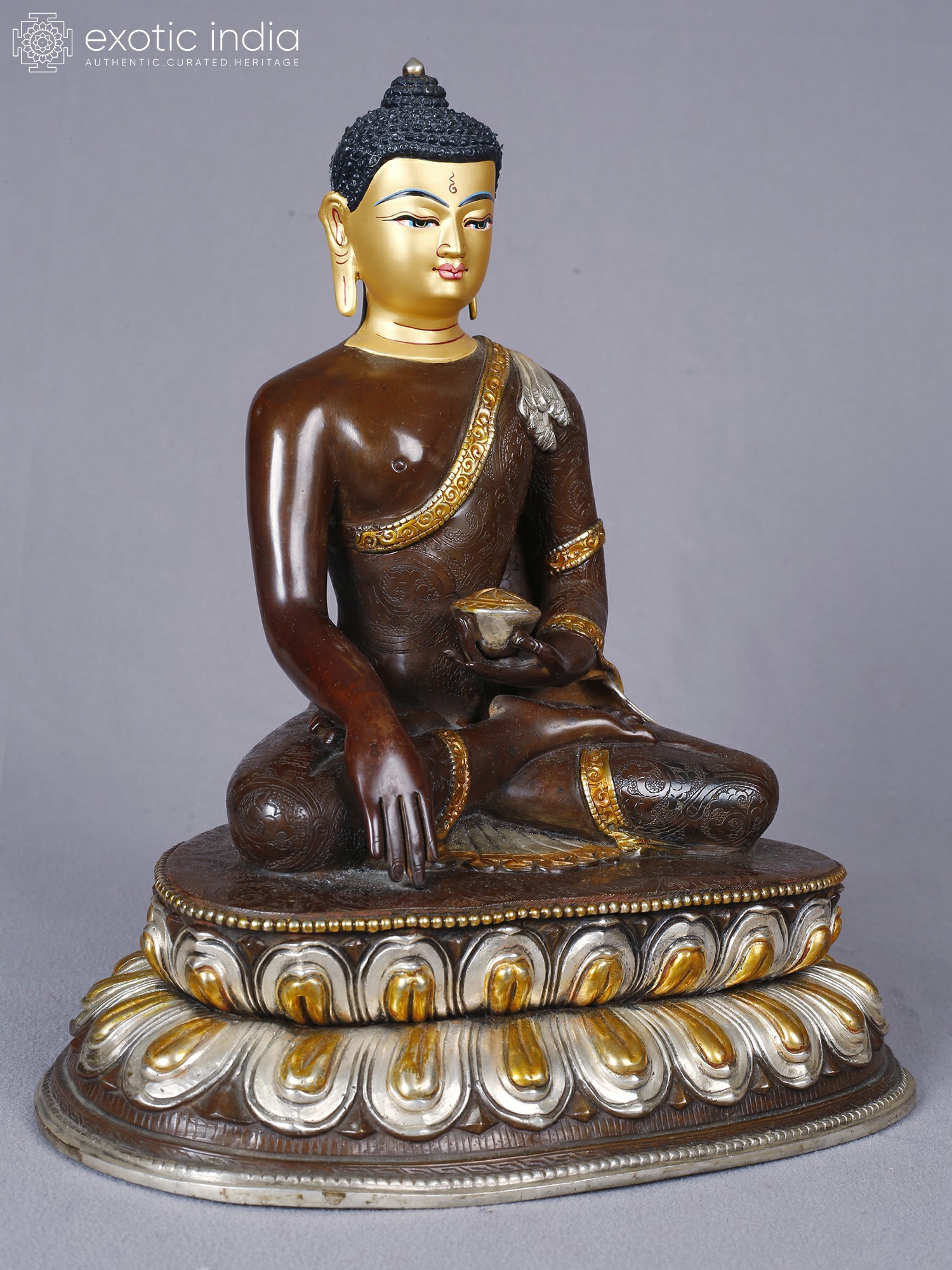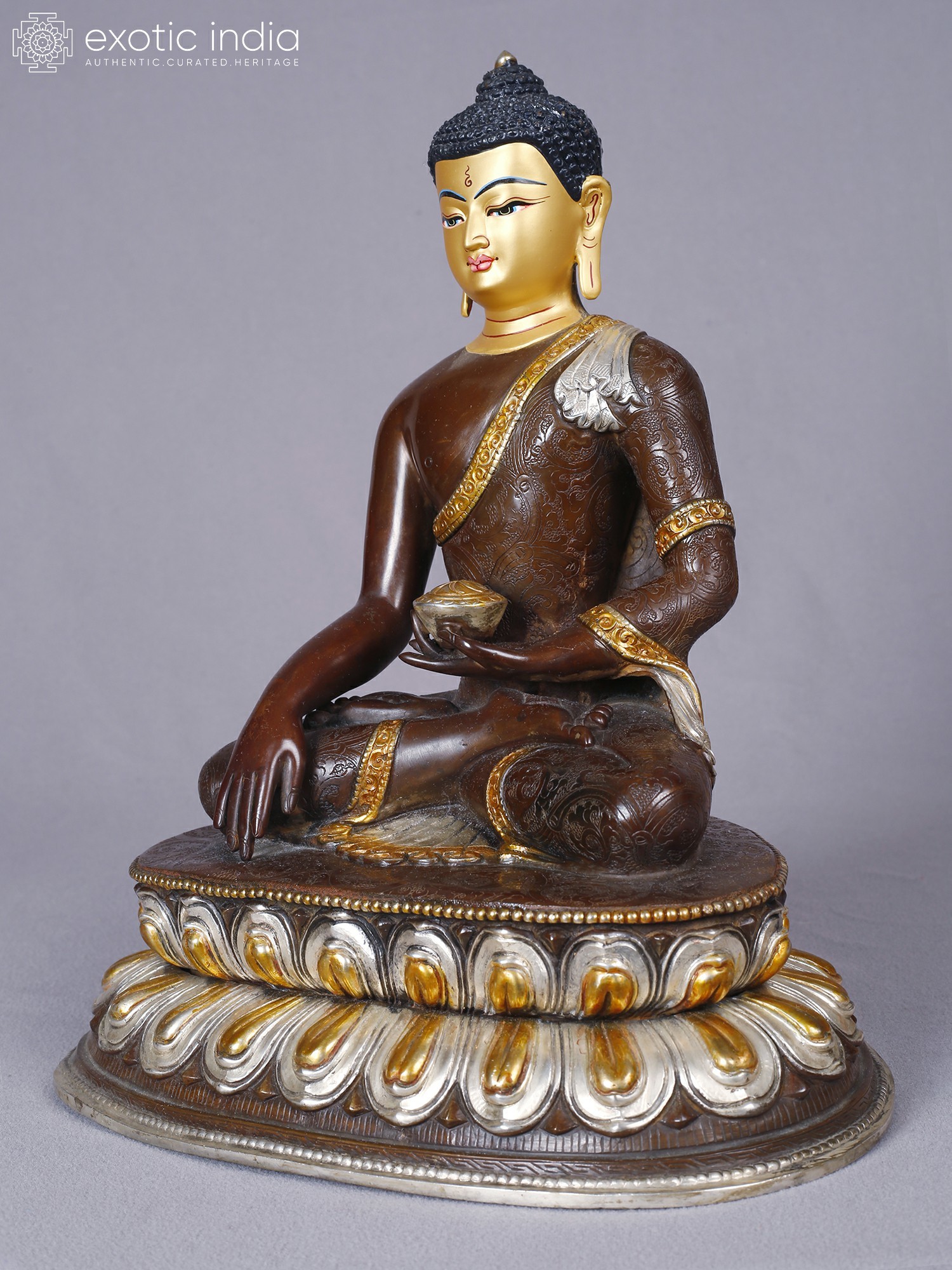 You'll appreciate the masterful balance and harmonious proportions that capture the essence of divine tranquility. The seated posture, with the right hand gently resting on the knee and the left cradling a bowl, signifies deep meditation and compassion. The rich textural interplay between the dark copper body and the gleaming gold and silver accents creates a visually captivating piece, measuring approximately 10.92 inches in height, 9.36 inches in width, and 4.68 inches in depth.