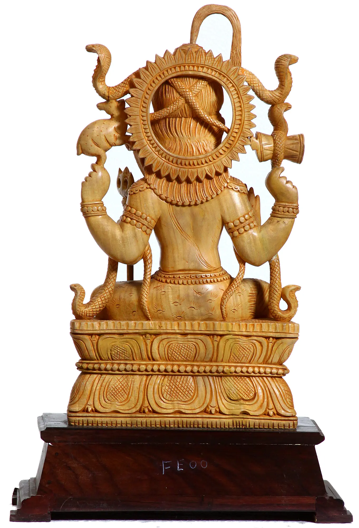 This representation of Pashupatinath is rich in symbolism. Shiva sits in a meditative pose upon a lotus pedestal, the lotus itself representing purity, enlightenment, and spiritual awakening. The snakes adorning his body are no ordinary reptiles; they are potent symbols of transformation and the cyclical nature of life and death, reflecting Shiva's dominion over time itself. His raised hand displays the Abhaya Mudra, a gesture of reassurance and fearlessness, offering protection to devotees. In his other hand, he holds a trishul, the trident that symbolizes his control over the three aspects of the universe: creation, preservation, and destruction. Further enhancing the divinity of Shiva, the wooden carving on his right hand depicts an animal, possibly a rat. This animal is a reference to the story in which Shiva rides Nandi, which is often symbolized as a rat to emphasize the animal-friendly qualities of the great god. This exquisite carving serves not only as a beautiful work of art but also as a reminder of the profound interconnectedness of all life forms.
