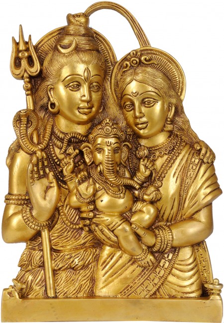 This exquisite brass wall hanging beautifully captures the essence of the divine family: Lord Shiva, Goddess Parvati, and their beloved son, Lord Ganesha. Crafted with meticulous detail, this piece is more than just a decorative item; it is a conduit of blessings, a symbol of domestic bliss, and a representation of the cosmic balance. The lustrous brass, known for its durability and regal sheen, adds a timeless elegance to this sacred depiction. The central figure is the benevolent Lord Ganesha, adorned with his characteristic elephant head. He is depicted being cradled by his divine parents, symbolizing the protection and nurturing love that surrounds the family. Ganesha, the remover of obstacles, is worshipped at the beginning of all rituals and auspicious ceremonies, and his presence here invokes prosperity, wisdom, and good fortune. His serene expression and gentle posture radiate peace and auspiciousness. To Ganesha's right stands Goddess Parvati, the divine consort of Lord Shiva and the mother of the universe. Her gaze is tender and loving as she embraces her son. Parvati, also known as Uma or Gauri, represents Shakti, the feminine energy, and embodies compassion, fertility, and maternal devotion. Her graceful presence in this composition signifies the nurturing aspect of the divine and the strength derived from love and unity. The intricate detailing of her ornaments and attire speaks to her regal status and divine grace. On Ganesha's left is Lord Shiva, the supreme deity, also known as Mahadeva. He is depicted with his third eye symbolizing wisdom and transcendence, and a crescent moon adorning his matted locks. The cobra coiled around his neck signifies control over primal energies. Shiva’s calm demeanor, even amidst his formidable iconography, reflects his role as the destroyer and transformer, a crucial aspect of the cosmic cycle. His protective embrace around his family underscores his role as the supreme patriarch, safeguarding his loved ones. He holds the Trishul, his iconic trident, symbolizing the three aspects of consciousness – waking, dreaming, and deep sleep – and his dominion over creation, preservation, and destruction. ––––––––––––––––––––