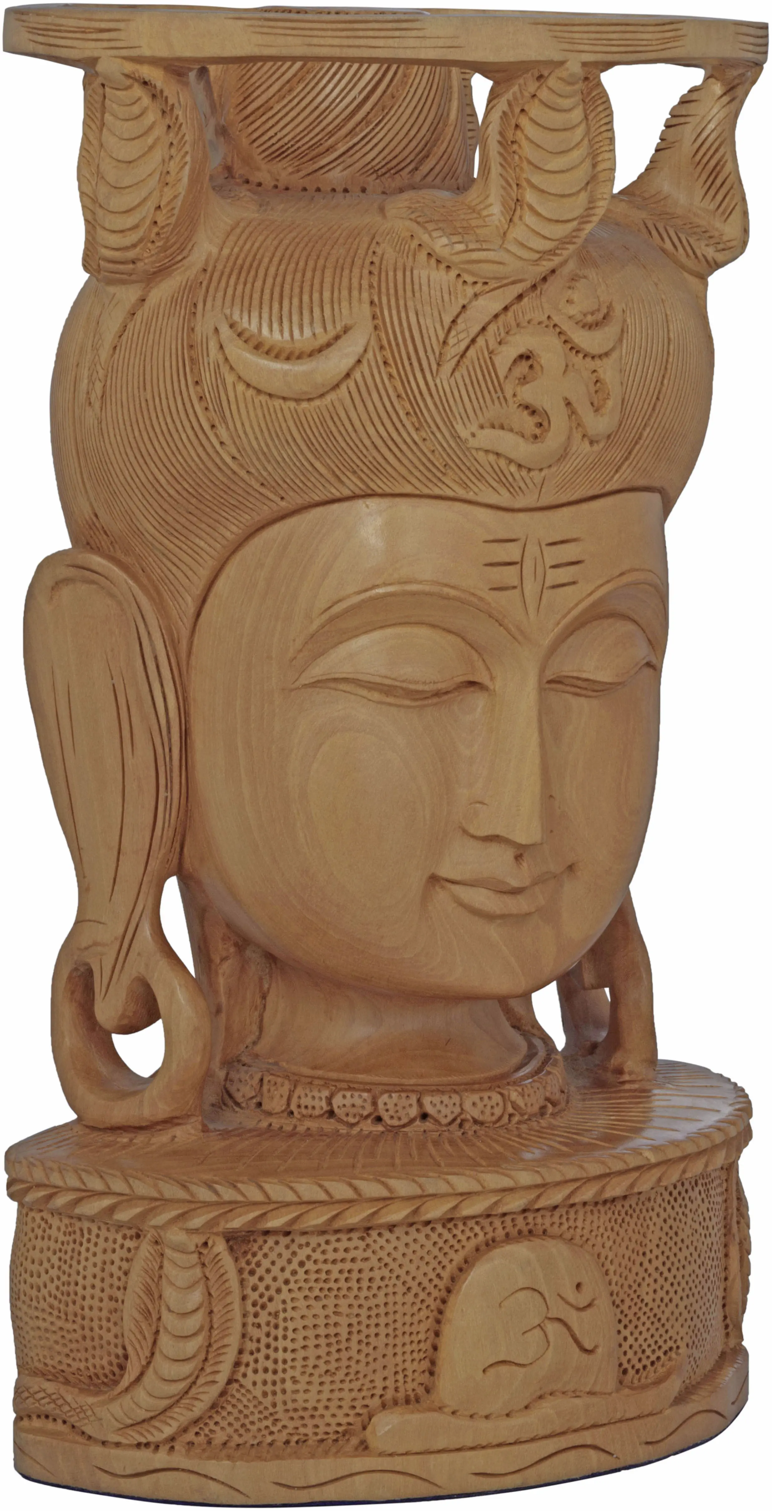 Invite the serene presence of Lord Shiva into your home with this exquisitely carved wooden representation of his divine head. Crafted with meticulous attention to detail, this piece captures the essence of Shiva, the supreme being in Hinduism, often depicted as the destroyer and transformer. The natural beauty of the wood lends a warmth and grounding energy to this sacred artwork, making it a focal point of spiritual contemplation and aesthetic appreciation. The carving features Shiva's characteristic third eye on his forehead, symbolizing his omniscient vision and his power to destroy ignorance. Above his serene face, a cobra, Vasuki, is coiled, signifying his mastery over the primal forces of the universe and his association with venom and rebirth. The intricate patterns adorning his crown suggest the flowing locks of hair that, in mythology, are said to contain the sacred river Ganges, bringing life and purification to the earth. The auspicious "Om" symbol, a sacred sound and spiritual icon in Hinduism, Buddhism, Jainism, and Sikhism, is subtly yet prominently featured, representing the primordial sound of the universe and the essence of ultimate reality.