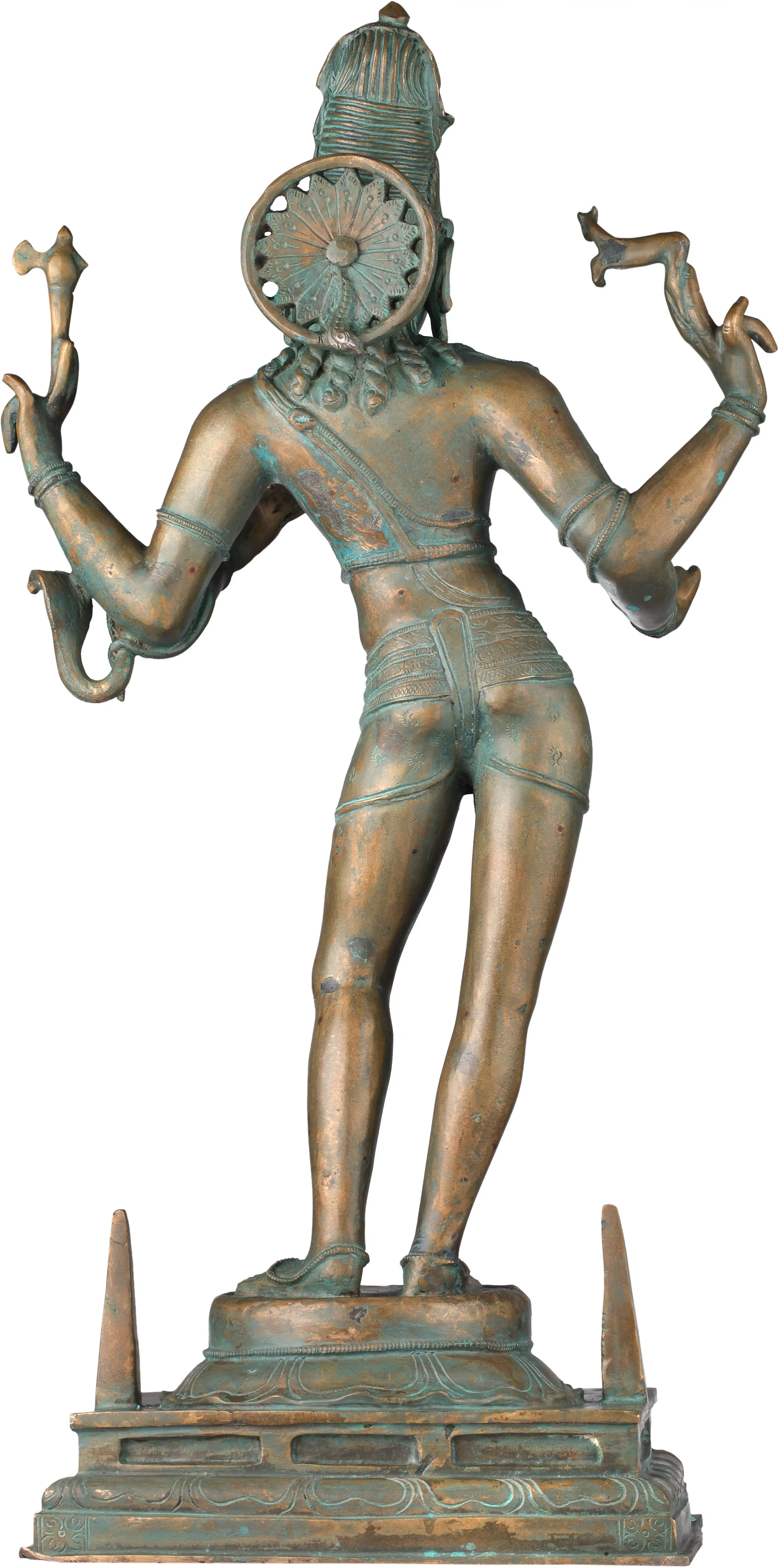 This exquisite bronze statue captures the awe-inspiring form of Lord Shiva as Pashupatinath, the Lord of Animals, and the cosmic dancer, Nataraja. Crafted with unparalleled artistry in Swamimalai, a region renowned for its ancient bronze casting traditions, this piece is a testament to the mastery of Panchaloha metalwork. The patina, a result of time and careful treatment, imbues the sculpture with a mystical aura, hinting at the divine power and eternal rhythm it represents. The posture of Shiva is dynamic, caught in the midst of his Tandava dance, a dance of creation, preservation, and destruction that perpetuates the universe. His raised leg symbolizes the release from earthly bondage, while the other firmly planted foot crushes the demon Apasmara, representing ignorance and ego. The multiple arms, each holding significant symbolism, convey the multifaceted nature of the divine. In one hand, the damaru, a small hand drum, produces the primal sound of creation. In another, the agni, or flame, signifies destruction and transformation, the necessary prelude to renewal. The other hands are depicted in gestures that offer protection and blessing, assuring devotees of divine grace.