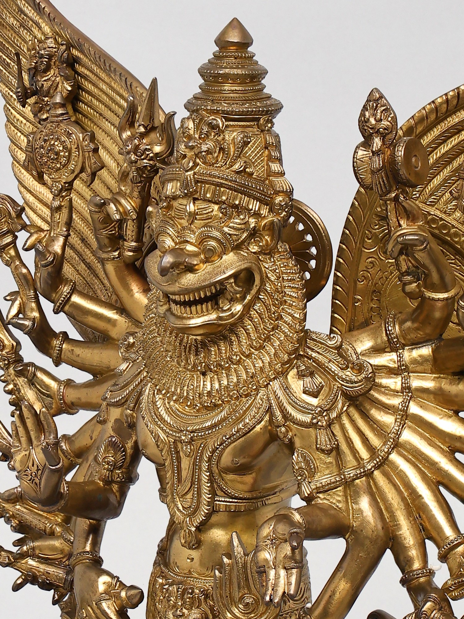 Depicts the divine manifestation of Lord Shiva as the Eighteen-Armed Sharabha Avatara.