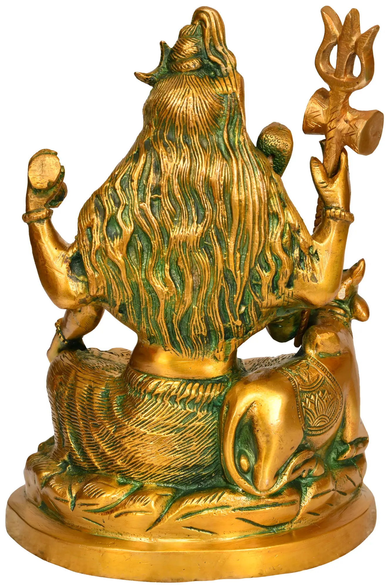 By Lord Shiva's side rests Nandi, his loyal bull vahana (mount). Nandi embodies strength, purity, and unwavering devotion, serving as the gatekeeper to Shiva's celestial abode. In Hindu mythology, Nandi is often depicted with a gentle yet powerful demeanor, reflecting the balance that Shiva himself embodies. The lion skin beneath Shiva is more than mere raiment; it represents the subjugation of primal forces. Legends speak of Shiva donning the skin of a lion to vanquish arrogance and demonic powers, reinforcing his role as the supreme deity who upholds cosmic order. The intricate detailing of the lion's face and claws on the base further emphasizes this theme of divine triumph over the untamed. The craftsmanship of this statue is a testament to traditional artistry. Cast in durable brass, the golden sheen of the metal is beautifully contrasted with the subtle green patina that accentuates the divine details. This patina evokes the patina of ancient sculptures, hinting at a timeless connection to sacred traditions. Each element, from the flowing locks of hair to the delicate ornamentation, is rendered with meticulous attention, creating a piece that is both aesthetically stunning and spiritually resonant.