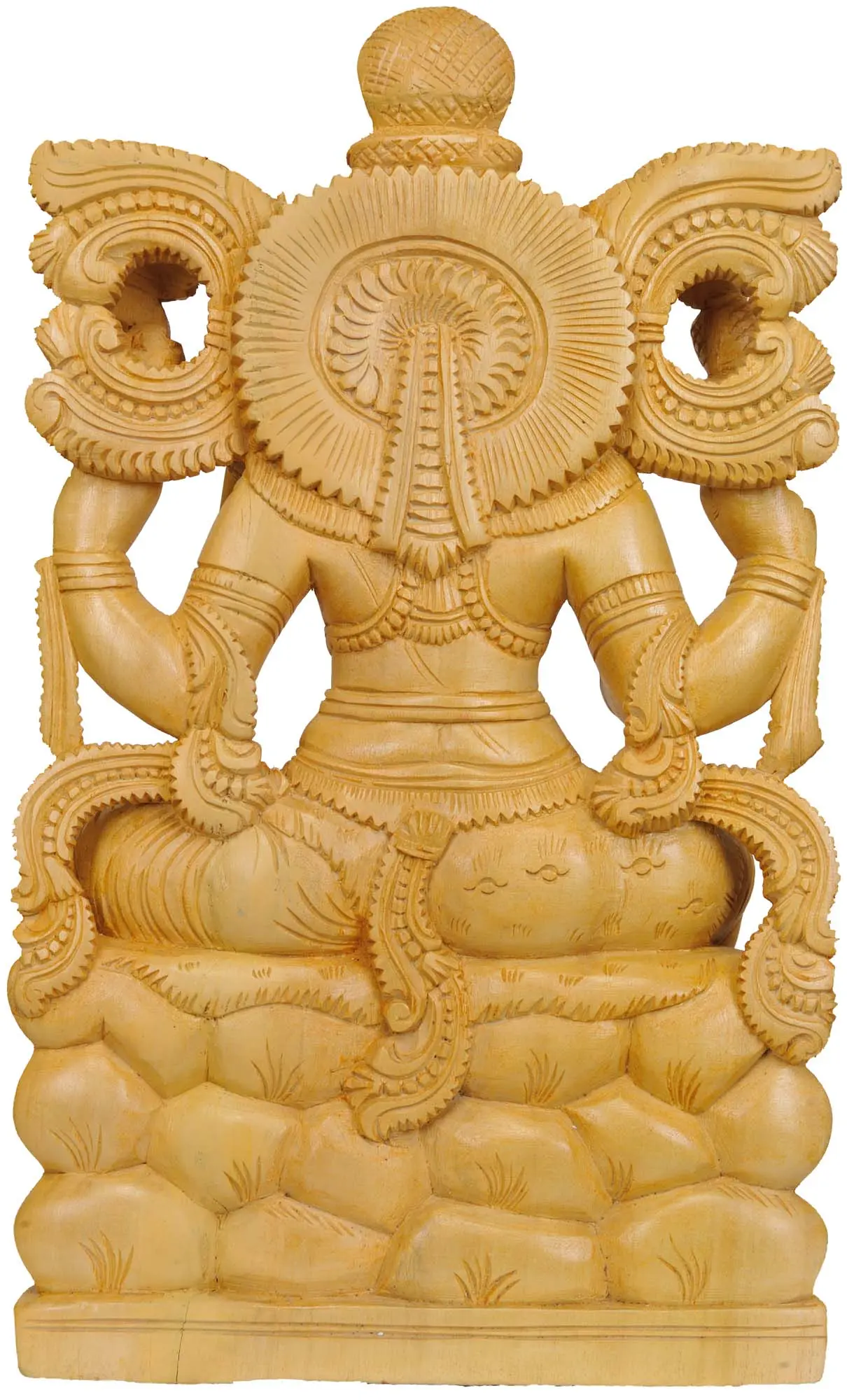 In one hand, Lord Shiva holds the trident, or Trishul, his primary weapon and a symbol of his three supreme functions: creation, preservation, and destruction. This powerful symbol represents the balance of cosmic forces and the ultimate control he wields over all existence. The other hand is raised in the Abhaya Mudra, a gesture of fearlessness and reassurance, bestowing blessings and dispelling anxieties. The presence of the deer, often associated with Lord Shiva, symbolizes grace, gentleness, and his role as the controller of the wild and untamed aspects of existence. The intricate carvings of celestial elements and divine adornments further enhance the aura of divinity surrounding the deity. Mount Kailash, the mythical abode of Lord Shiva, is more than just a physical location; it represents the pinnacle of spiritual achievement and the untainted purity of the Himalayas. It is a place of profound meditation, where the boundaries between the material and the divine blur. This carving, therefore, is not merely a representation of Shiva but a doorway to experiencing the essence of his celestial realm, bringing a sense of divine presence and spiritual elevation to your home or sacred space. The natural warmth and texture of the white cedar wood lend an organic and grounding quality to this divine depiction, making it a timeless piece of devotional art.