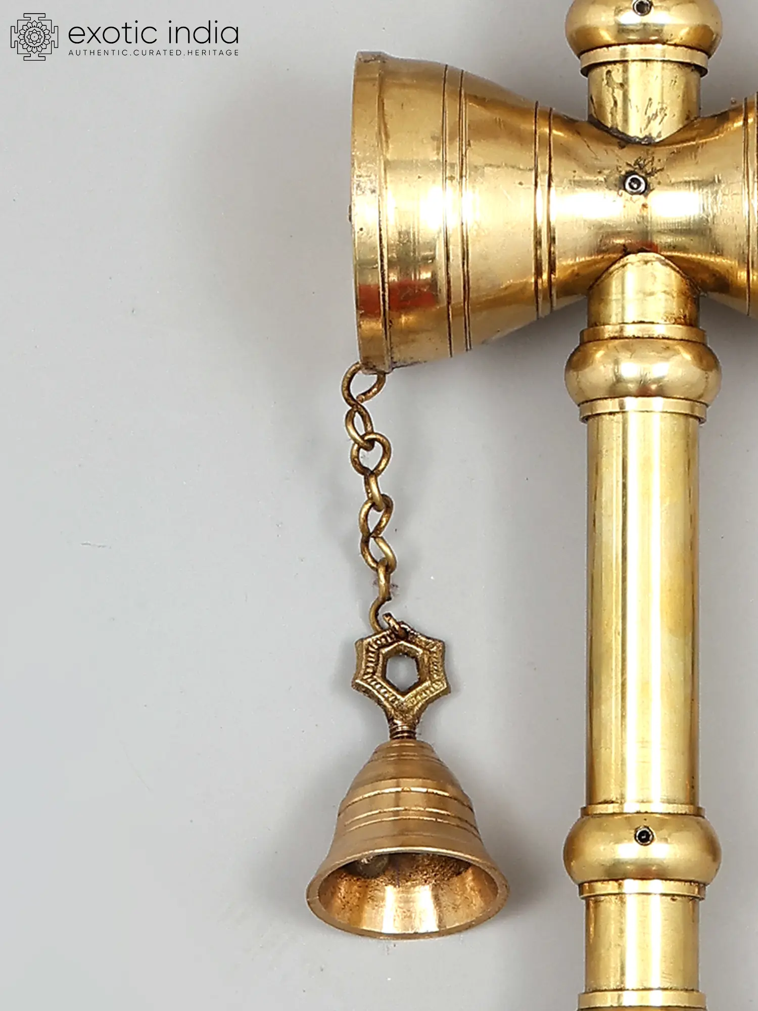 Meticulously fashioned from high-quality brass, this 37-inch trishul is a testament to traditional Indian craftsmanship. The warm, lustrous glow of the brass lends an aura of divinity and permanence to the piece, making it an ideal addition to any sacred space or a commanding presence in your home decor. The detailed carving and the balanced proportions of the trident, damru, and bells speak to the artisan's skill and devotion. Whether intended for ritualistic purposes, as a focal point for meditation, or as a striking decorative item, this brass trishul serves as a constant reminder of the profound philosophical underpinnings and rich cultural heritage associated with Lord Shiva and his cosmic energies. It is an object that inspires awe, devotion, and a deep sense of connection to the divine.