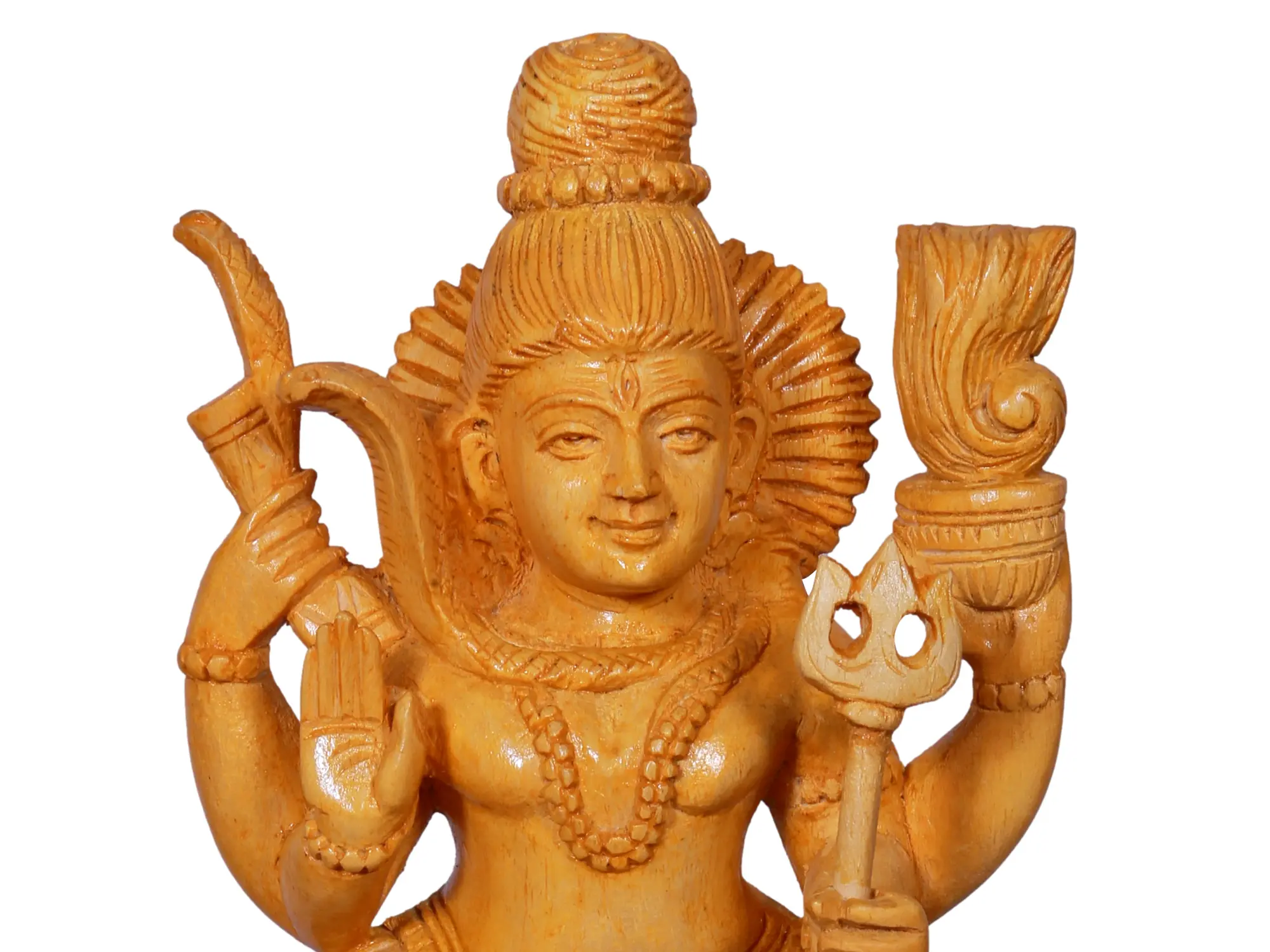 The wooden sculpture encapsulates the dichotomy of Shiva's nature, portraying both his fierce and compassionate aspects. This representation serves as a visual ode to the divine prowess of Shiva and invokes a sense of reverence for his role as the cosmic protector and harbinger of auspiciousness.