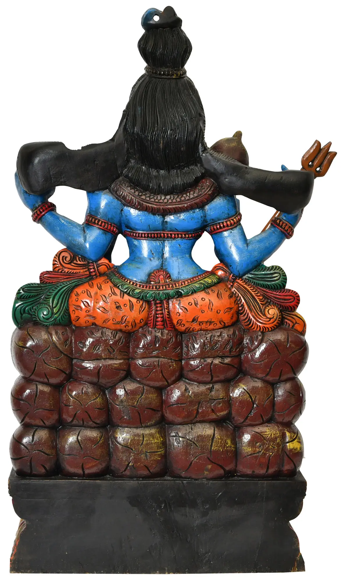 This magnificent wood carving from South India depicts Lord Shiva, the destroyer and transformer, in a posture of serene meditation. Adorned with the iconic blue hue symbolizing his cosmic essence, this piece captures the multifaceted nature of the supreme deity. Shiva, known as Mahadeva, the Great God, is a central figure in Hinduism, revered as the creator, preserver, and destroyer of the universe. His essence embodies both asceticism and ecstatic dance, stillness and immense power. In this carving, his eyes are gently closed, suggesting deep contemplation, while his multiple hands hold significant symbols of his divine attributes.
