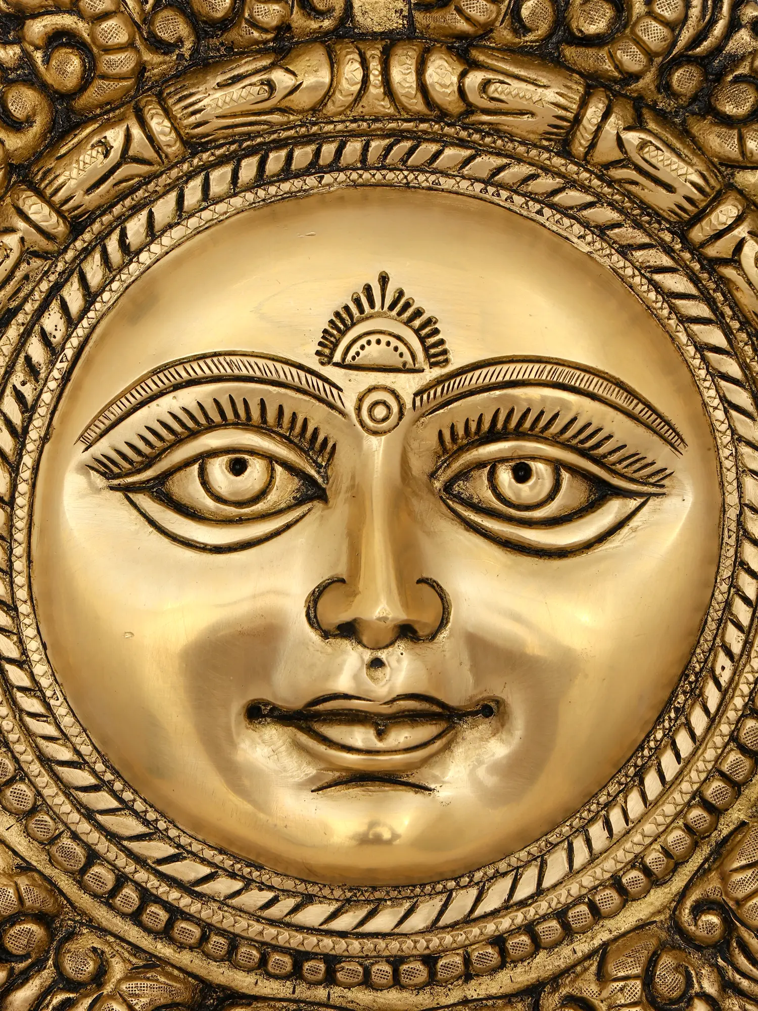 Infuse your home with the illuminating power and divine presence of the sun. This exquisite brass wall hanging captures the celestial visage, bringing an aura of warmth and prosperity into any space it graces. It is a testament to enduring artistic traditions, designed to captivate and inspire.