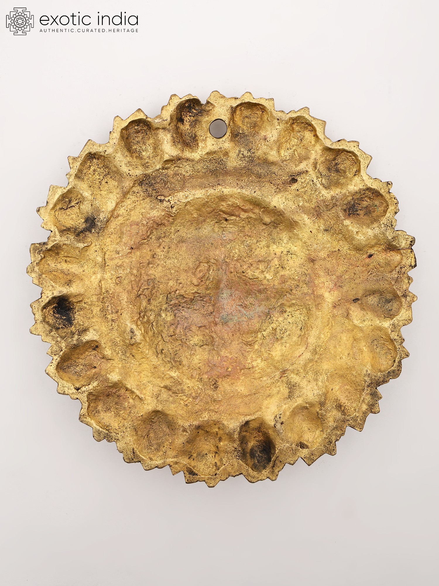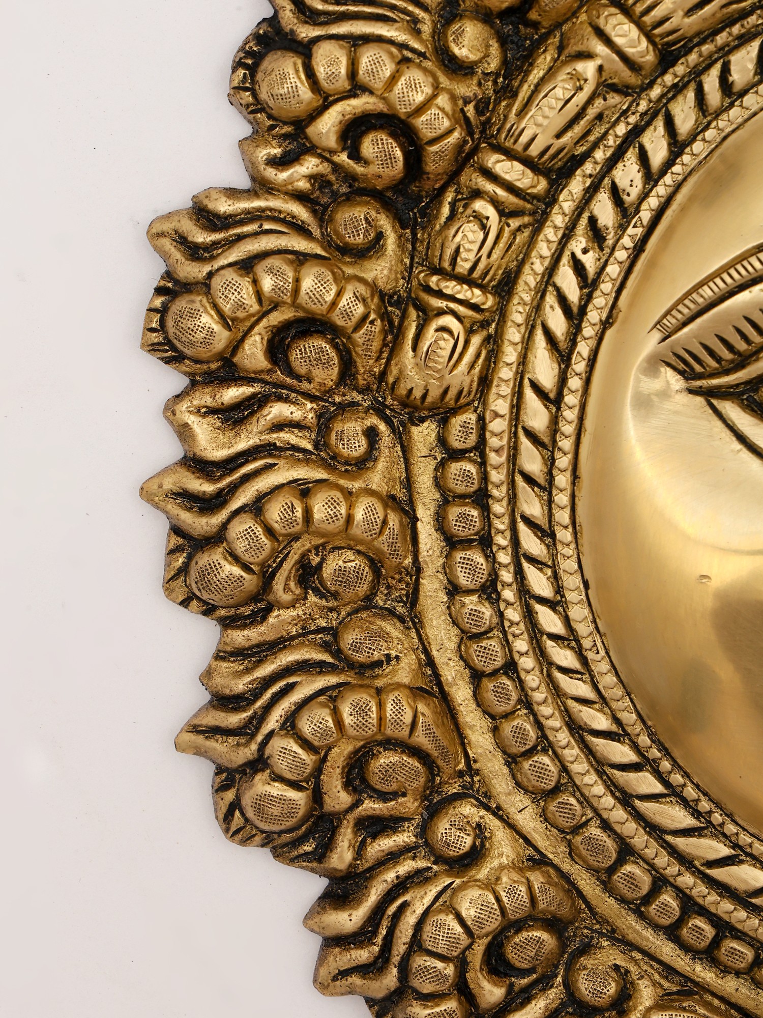 Each detail of this radiant face has been meticulously hand-chiseled from solid brass by skilled artisans. You'll appreciate the depth and texture achieved through traditional casting and finishing techniques, resulting in a piece that feels both substantial and finely wrought. The lustrous glow of the brass is enhanced by subtle patination, highlighting the intricate floral border and the serene expression.