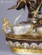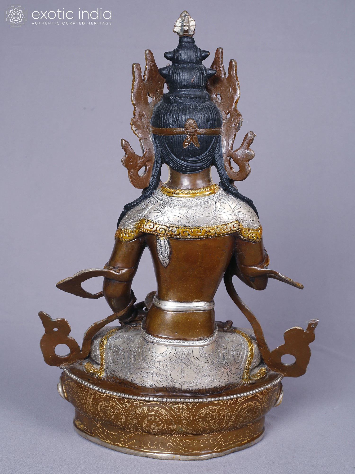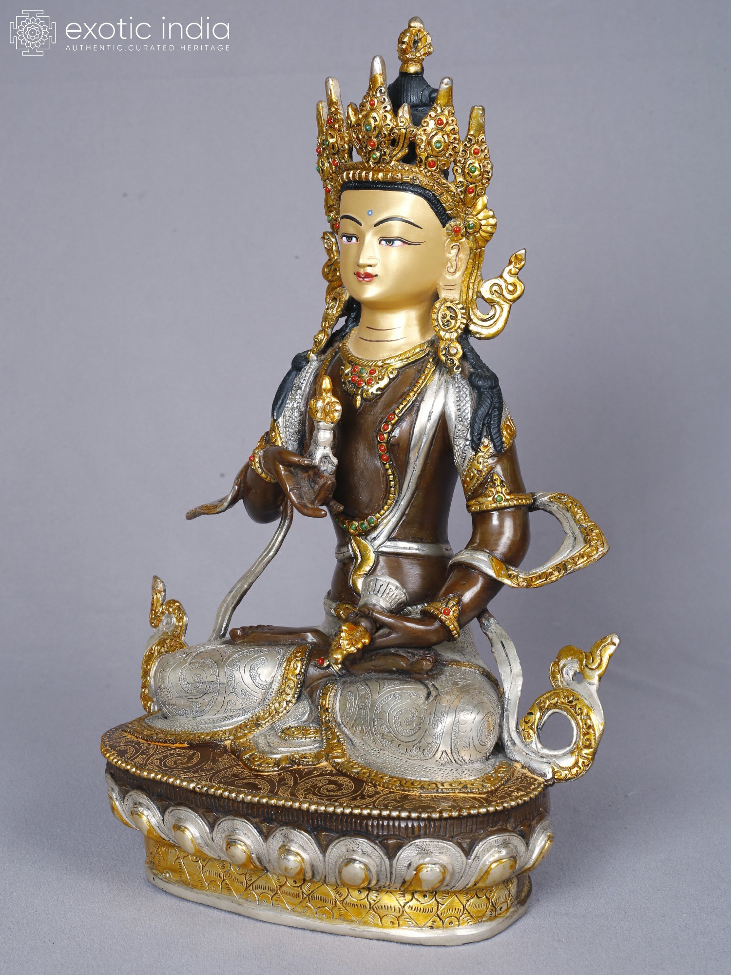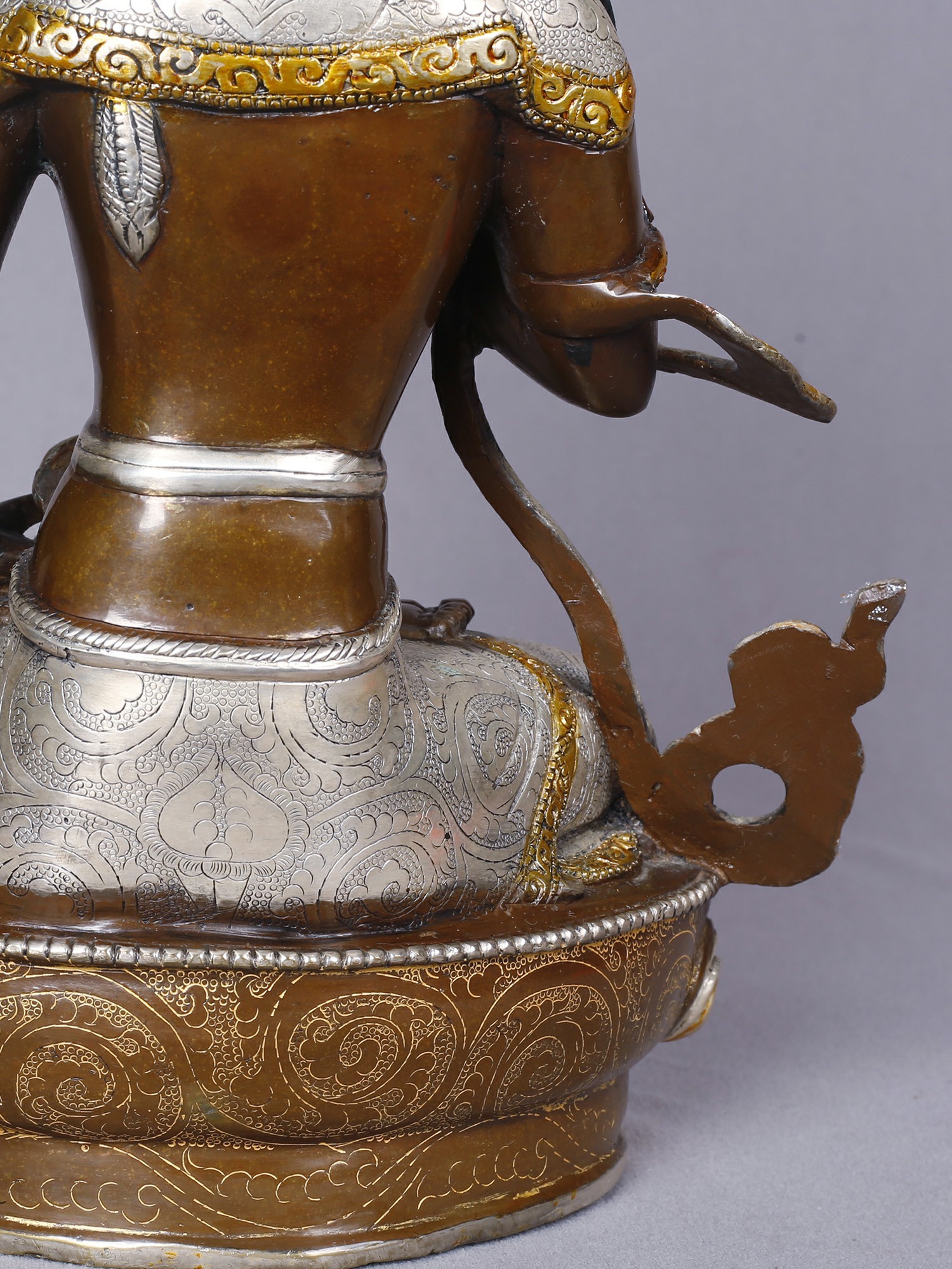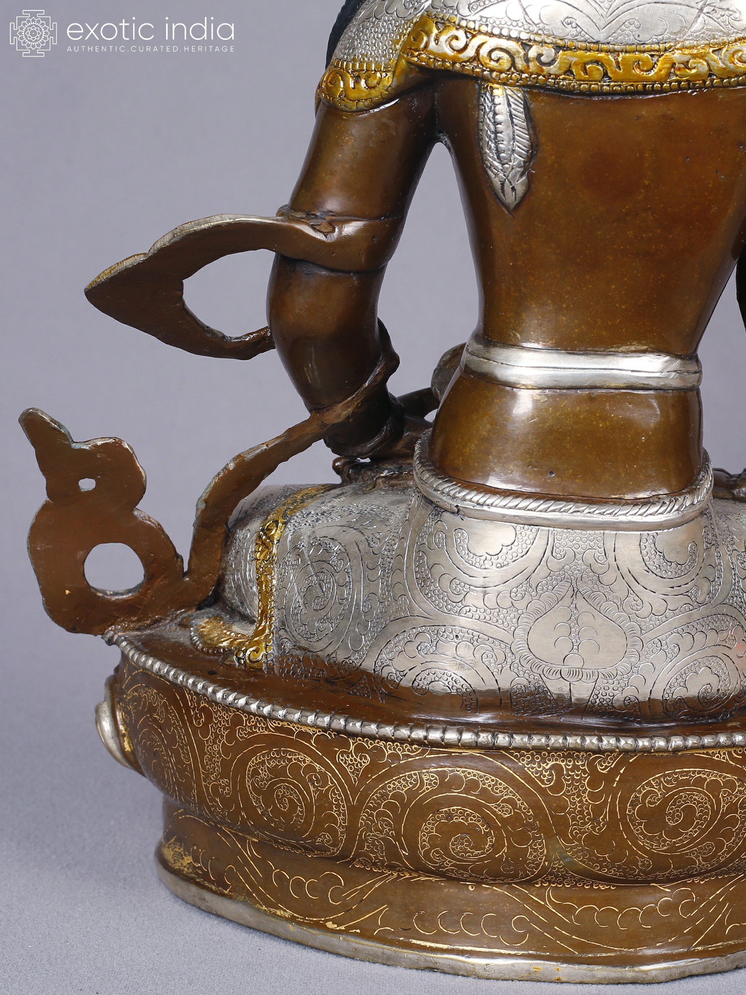 You’ll be struck by the striking contrast of the deep, rich copper base against the luminous gleam of gold and silver accents, creating a visual harmony that is both dynamic and serene. The figure is adorned with a crown and jewelry that sparkle with inlaid gemstones, each one carefully chosen to enhance the divine radiance. The seated posture, with hands held in symbolic mudras, conveys a sense of ultimate calm and spiritual authority, while the ornate detailing of the lotus base provides a majestic foundation.