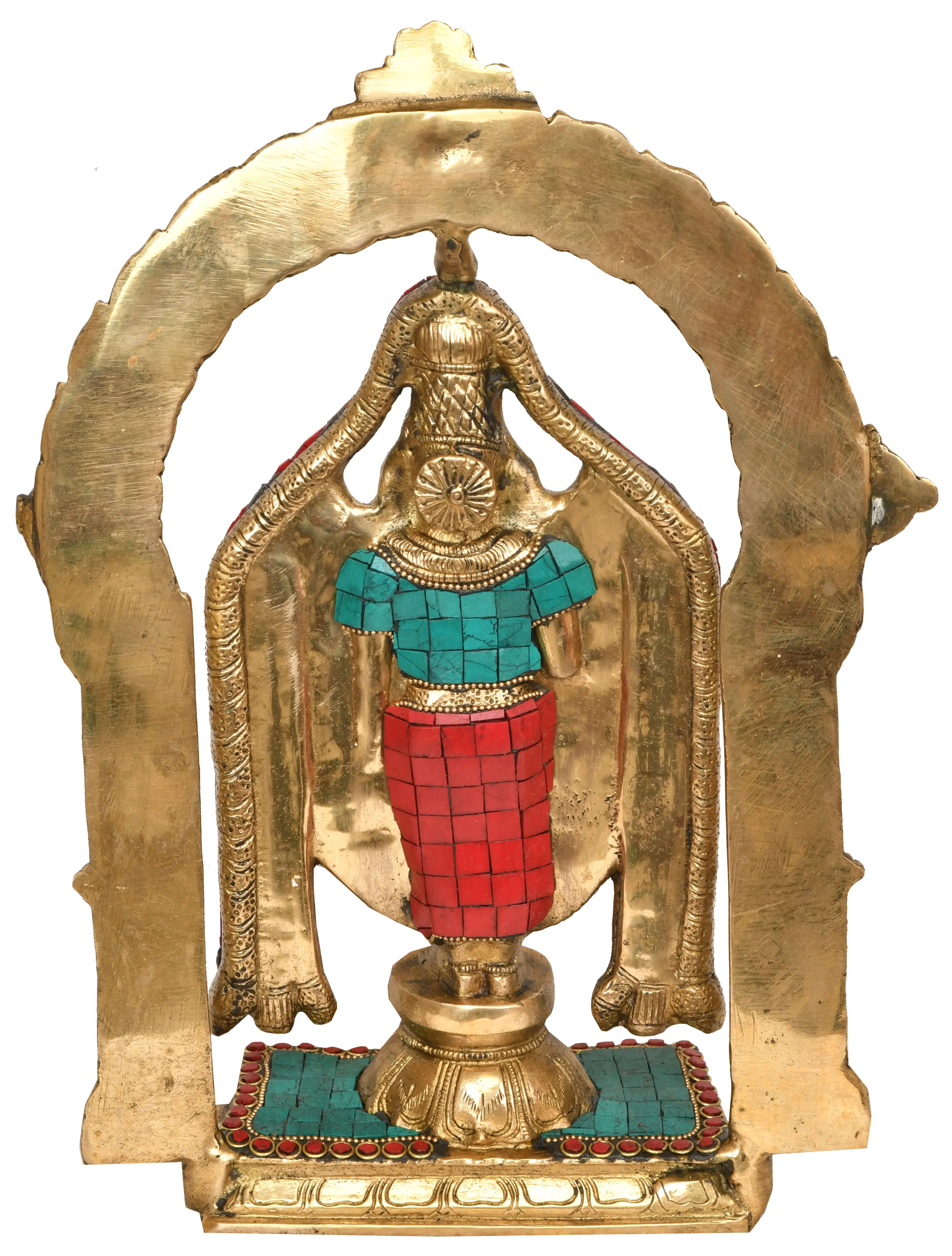 The brass construction of this statue lends it a timeless appeal and a substantial feel, symbolizing the enduring nature of faith. The meticulous inlay work, featuring vibrant red and turquoise stones, adds a layer of opulence and draws the eye to the deity's form. These colors are often associated with auspiciousness and divine energy in Hindu traditions. The archway that frames Lord Balaji, also embellished with these stones, evokes the grandeur of temple architecture, transporting you to the sacred precincts of Tirupati. Each detail, from the serene expression on Balaji's face to the flowing garments and elaborate headdress, has been rendered with remarkable precision, a testament to the skill of the artisans.