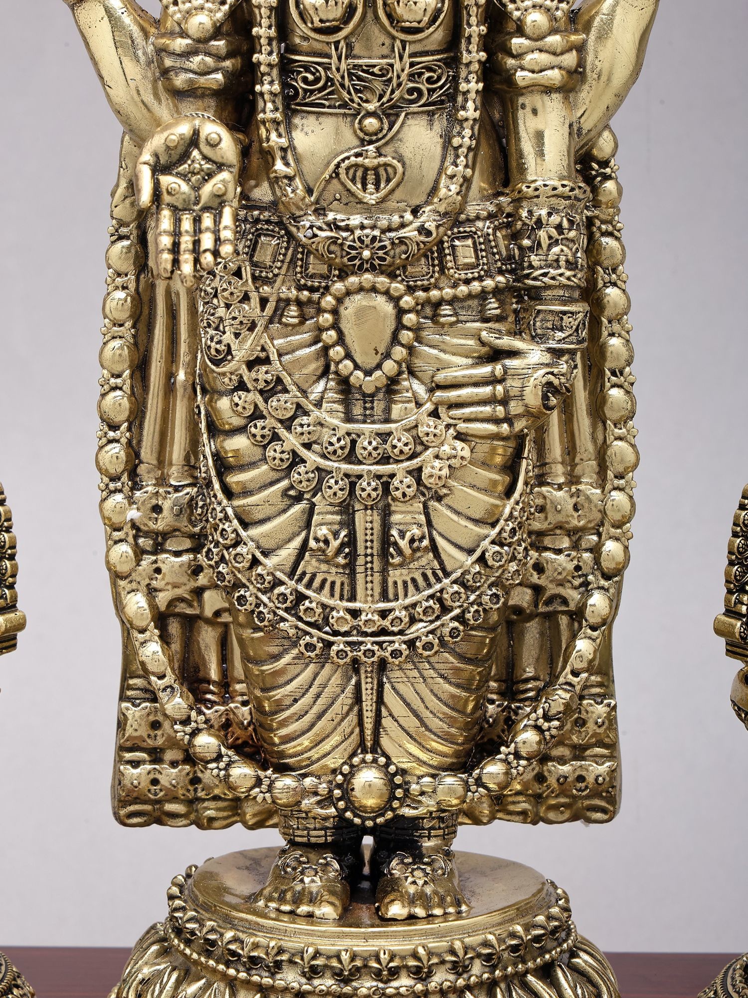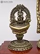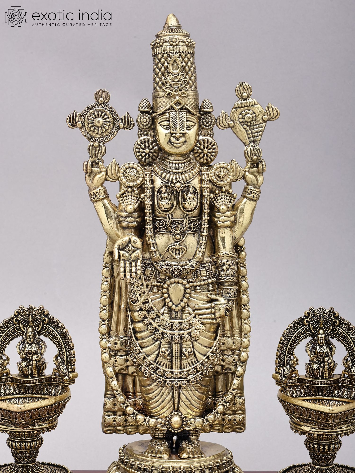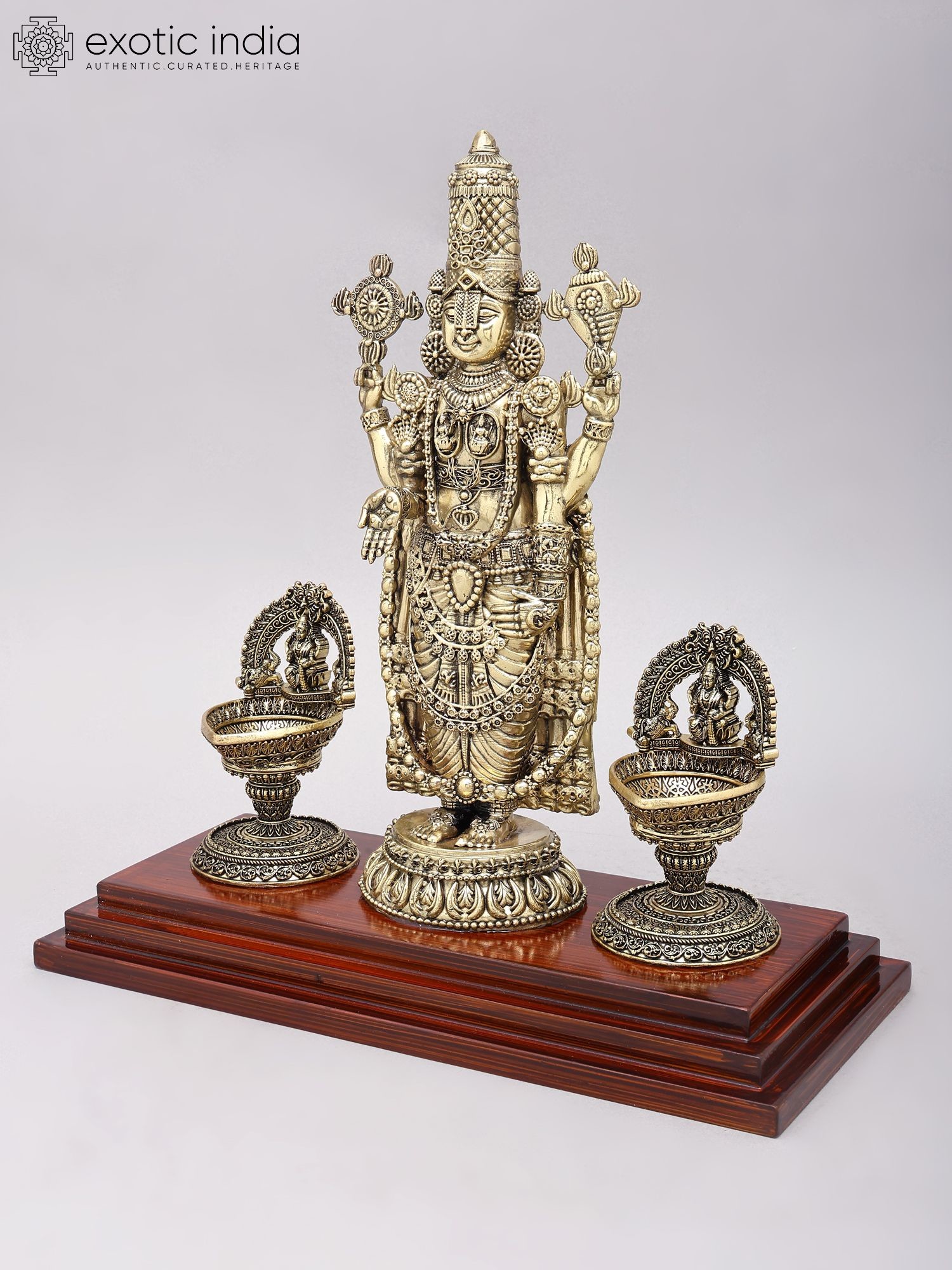 Lord Venkateshwara Brass Statue with Lakshmi Lamps, 13 Inch - Wood Base