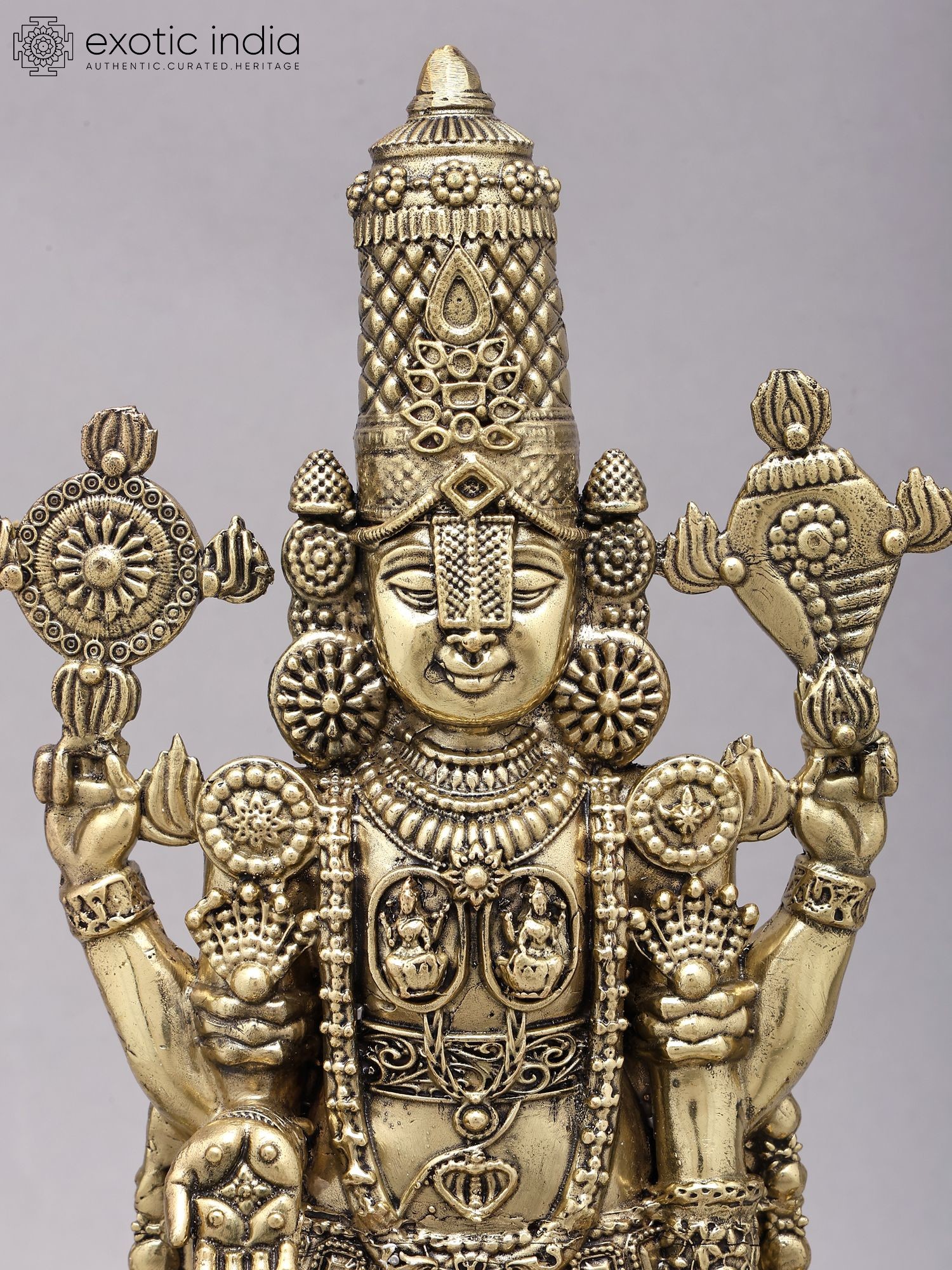 Intricately detailed brass sculpture depicting Lord Tirupati Balaji (Venkateshvara) in a commanding posture.
