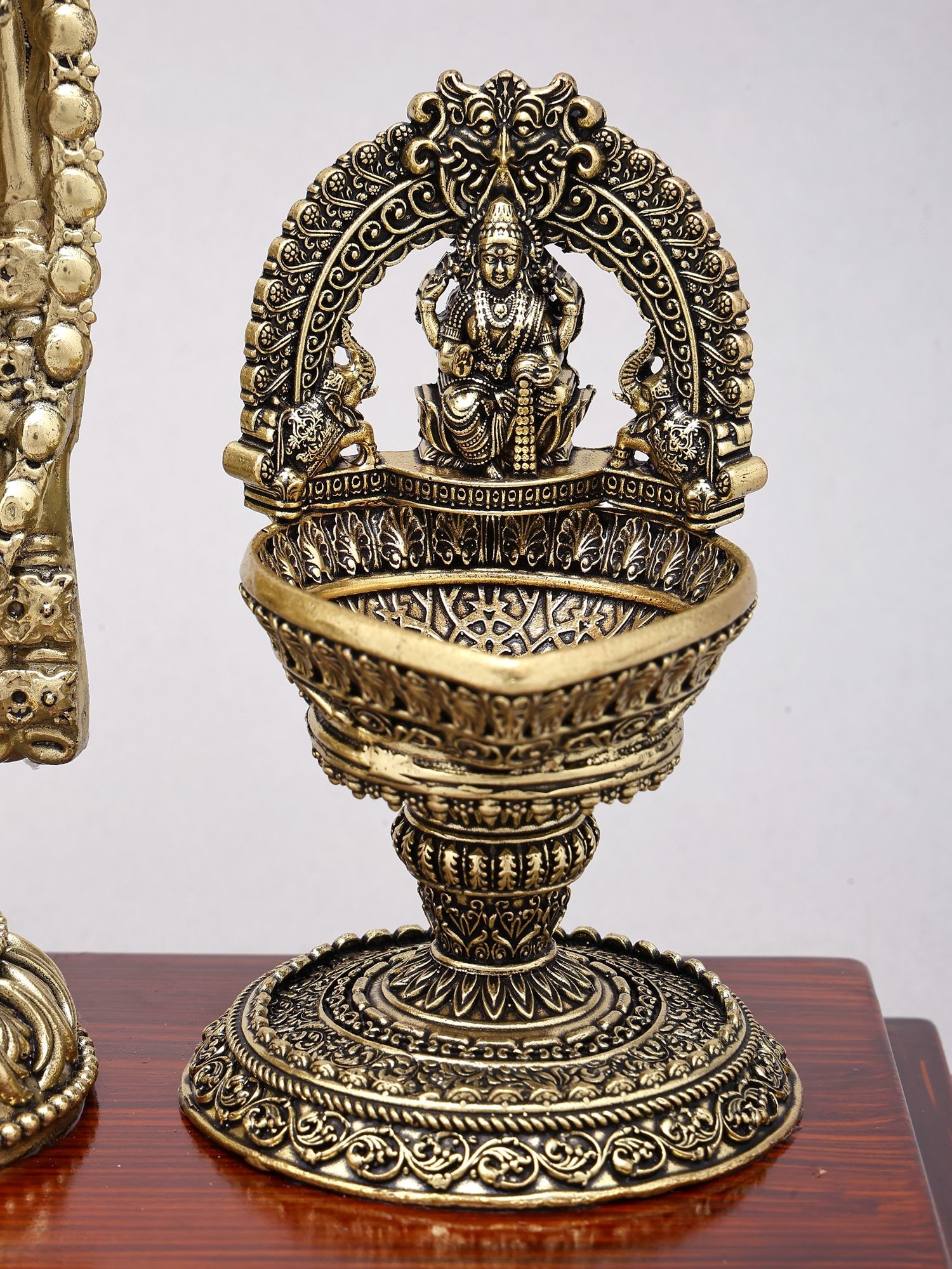 Features twin oil lamps with depictions of Goddess Lakshmi, symbolizing prosperity and good fortune.