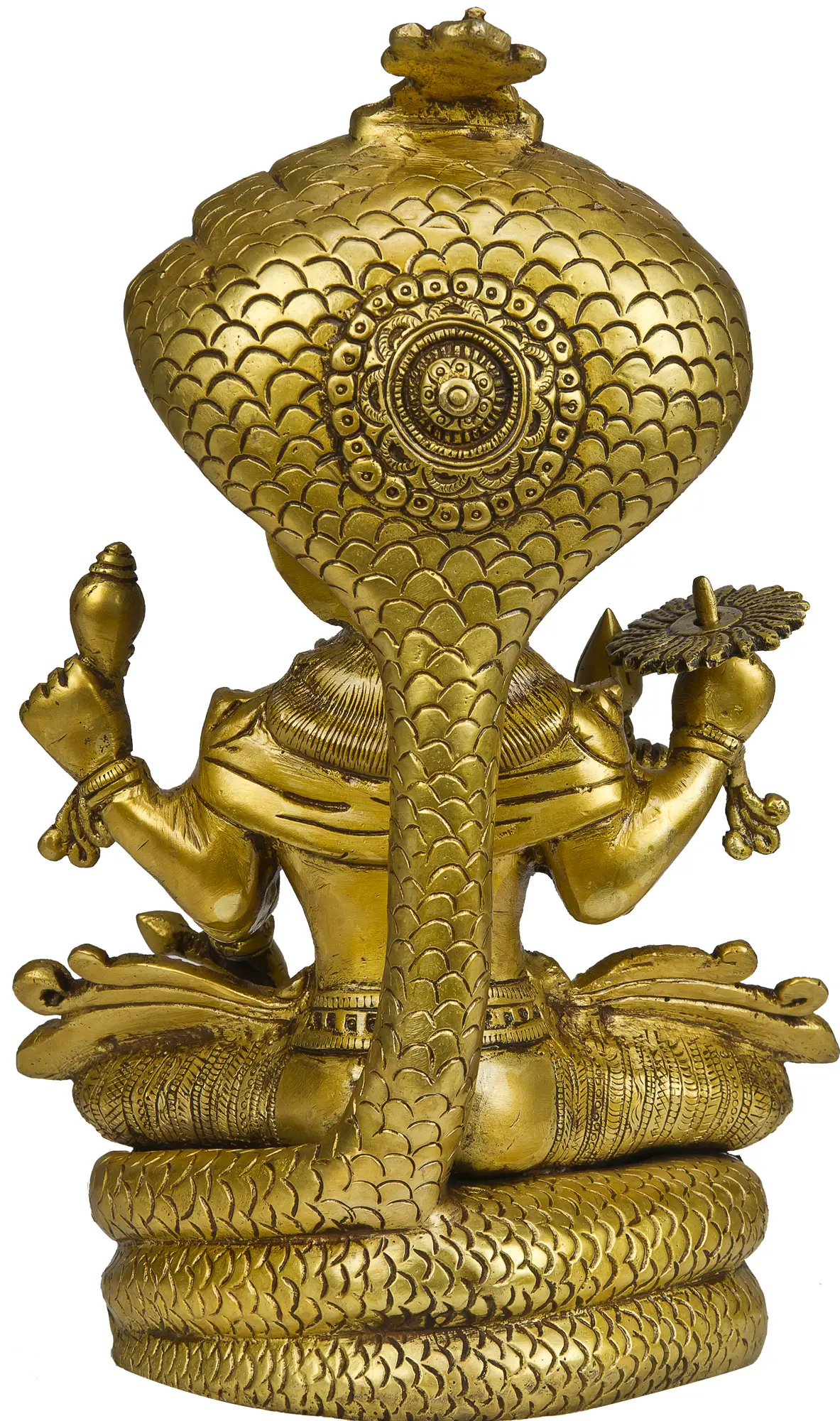 Invite the benevolent presence of Lord Vishnu, the preserver and protector of the universe, into your home with this exquisite brass sculpture. Seated serenely upon the coils of Sheshnag, the cosmic serpent, this piece embodies a profound spiritual narrative central to Hindu philosophy. Vishnu, with his infinite compassion and unwavering resolve, is depicted in a posture of tranquil contemplation, yet ever-vigilant to maintain cosmic order. The intricate craftsmanship highlights the divine aura of Vishnu, with his iconic four arms signifying his omnipotence and his ability to manage multiple aspects of existence simultaneously. The Sheshnag, also known as Ananta, is not merely a serpent but represents the primordial and infinite consciousness upon which Vishnu reclines during the cosmic dissolution. It symbolizes eternity, stability, and the unfathomable depths of the universe. The hoods of Sheshnag fan out majestically above Vishnu, forming a protective canopy, a testament to the serpent's devotion and its role as the eternal bed of the divine. This imagery is deeply rooted in tales of creation, where Vishnu's slumber on Sheshnag precedes the unfolding of new universes.