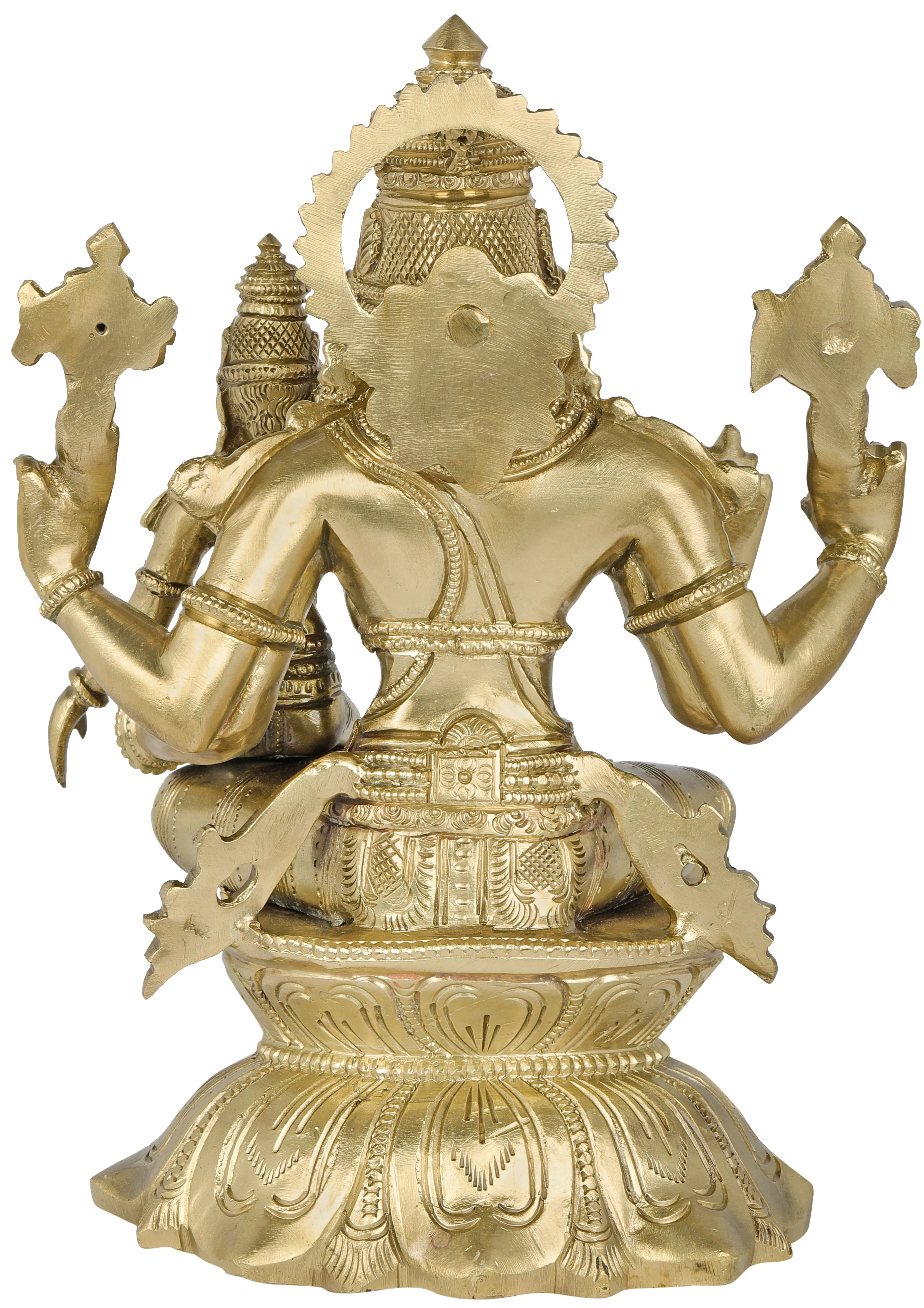 Lord Vishnu, the preserver of the universe, is depicted in a posture of grace and strength, his four hands holding sacred emblems signifying his cosmic power and responsibilities. Beside him, Goddess Lakshmi, the embodiment of wealth, prosperity, and auspiciousness, sits with gentle composure. Their seating on the lotus, a symbol of purity and spiritual awakening, signifies their transcendental nature and their benevolent influence on the world. In Hindu mythology, Vishnu and Lakshmi are often depicted together as the divine couple, their union representing the cosmic order, material abundance, and spiritual fulfillment. Tales often describe Lakshmi emerging from the churning of the cosmic ocean (Samudra Manthan) and choosing Vishnu as her eternal consort, signifying that true prosperity is inseparable from righteousness and divine grace.