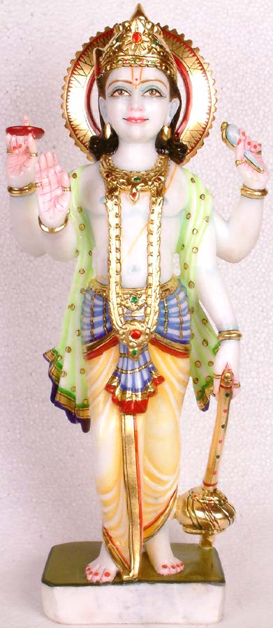 The sculpture depicts Vishnu in a standing posture, a symbol of his active involvement in the world. The four arms, a common representation of Vishnu, hold significant symbolic items. One hand is raised in the Abhaya Mudra, a gesture of reassurance and protection, dispelling fear and granting blessings. The other hands typically hold the Padma (lotus), representing purity, spiritual awakening, and divine birth; the Chakra (discus), a powerful weapon symbolizing the destruction of ego and ignorance; and the Gada (mace), representing authority and the power of divine justice. These attributes, meticulously rendered in the marble, underscore Vishnu’s role as the protector and upholder of dharma.